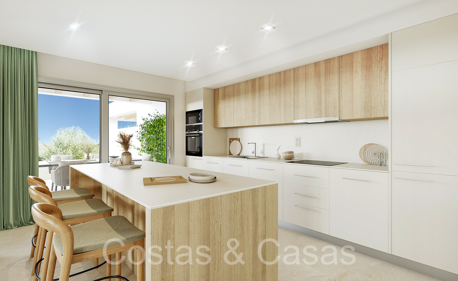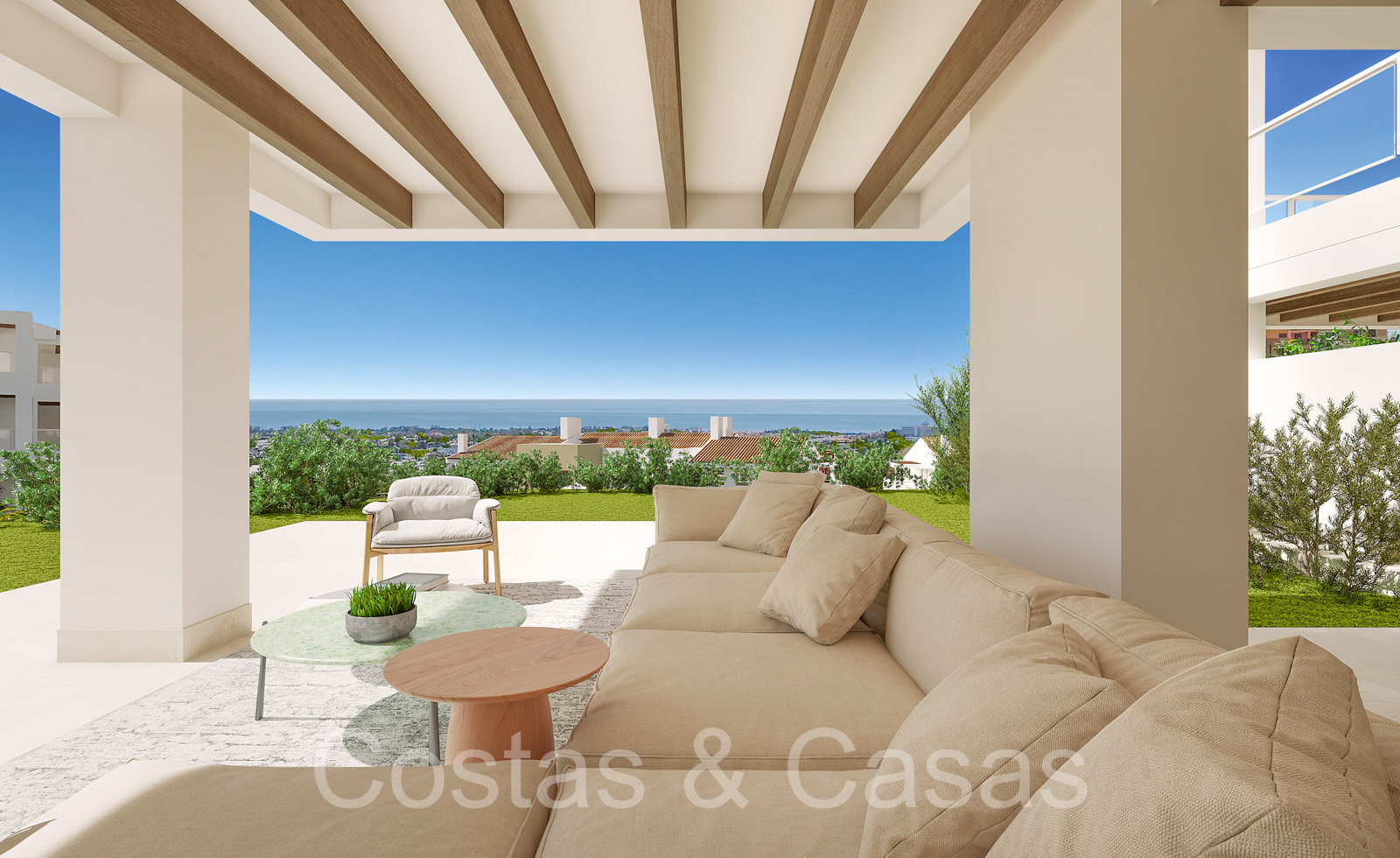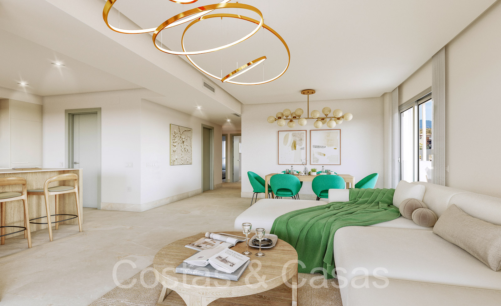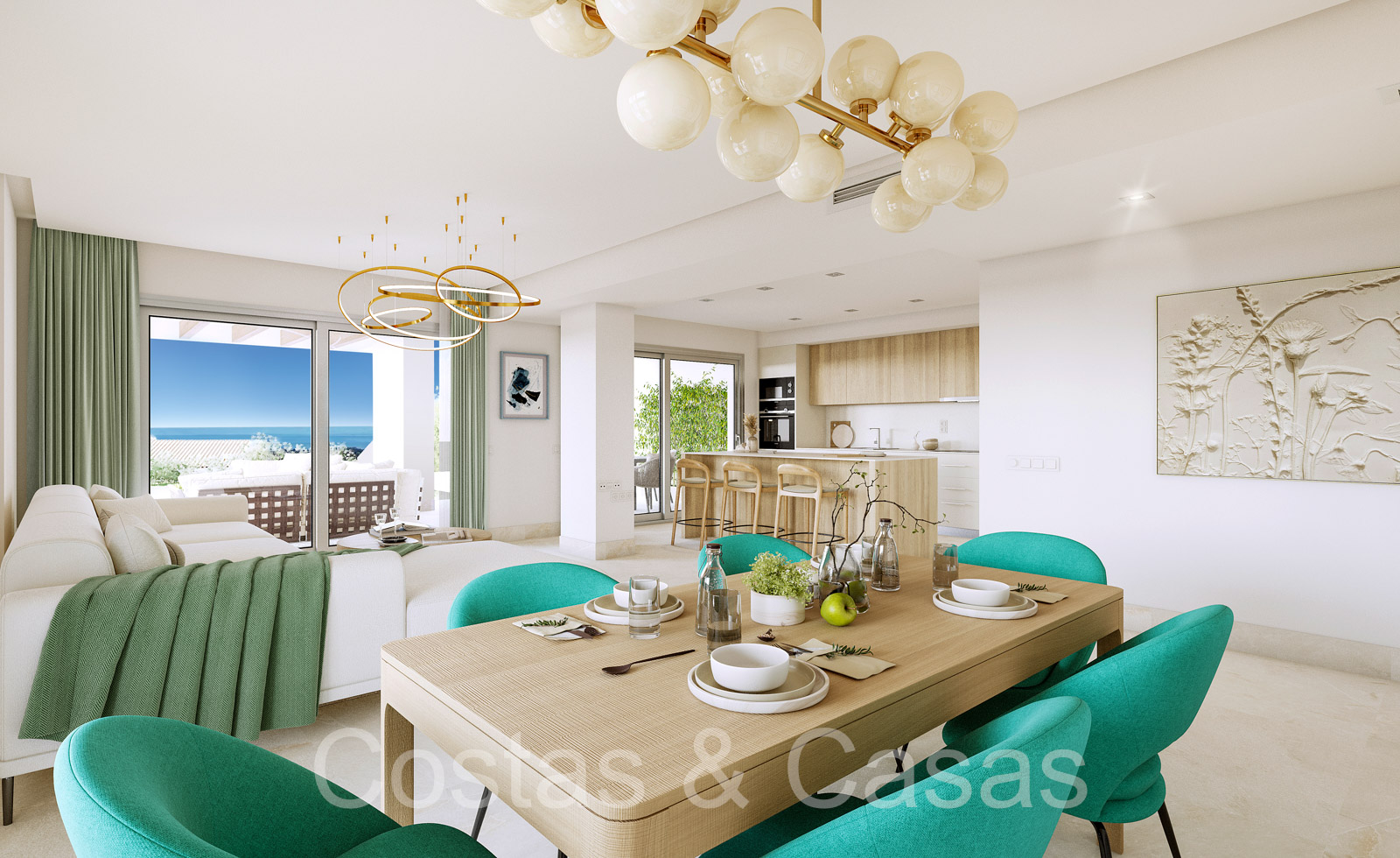 Apartamentos de nueva construcción de estilo contemporáneo. Alto nivel de acabados con materiales de calidad. Orientada al Sureste. Vistas panorámicas a los campos de golf y al mar Mediterráneo. Diseño interior espacioso y elegante. Apartamentos en planta baja, 1a o 2a planta. Concepto de planta abierta. Cocina moderna y abierta, totalmente equipada con electrodomésticos Siemens y equipada con una isla. Junto a un cuarto de servicio. Las altas ventanas correderas generan mucha luz natural en las viviendas y dan a las amplias terrazas. Comedor integrado. 2 o 3 dormitorios, 2 baños. Suelos porcelánicos de calidad 90x90cm de la marca Saloni. Trastero y plaza de aparcamiento en garaje subterráneo incluidos.
