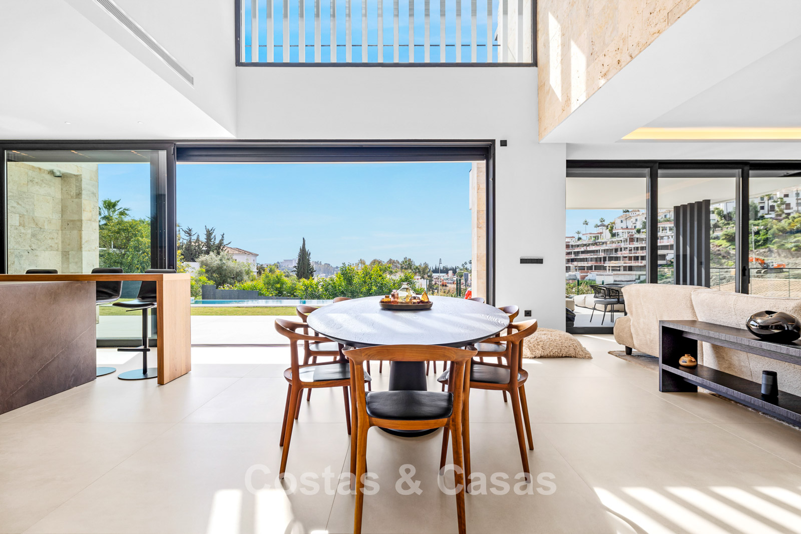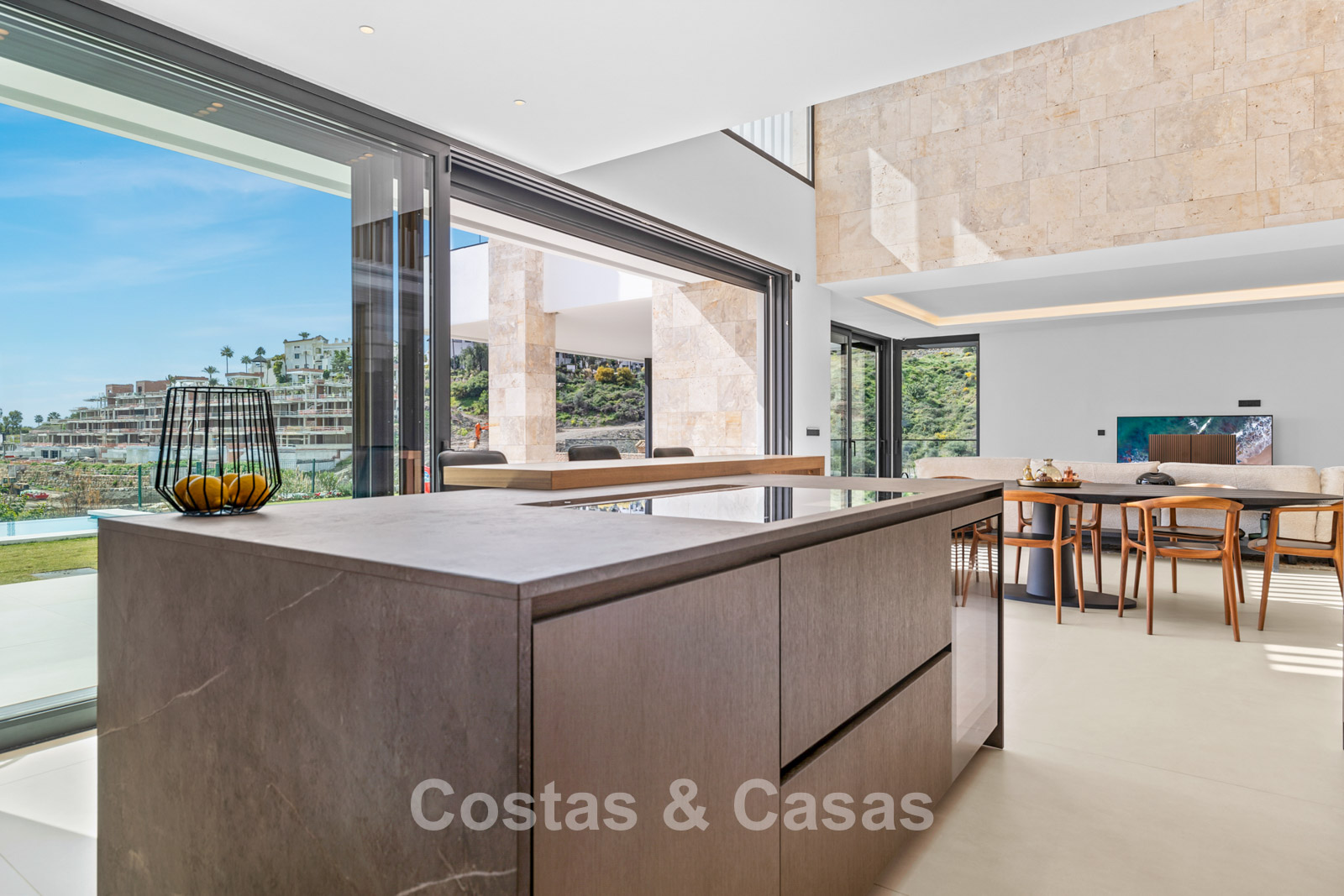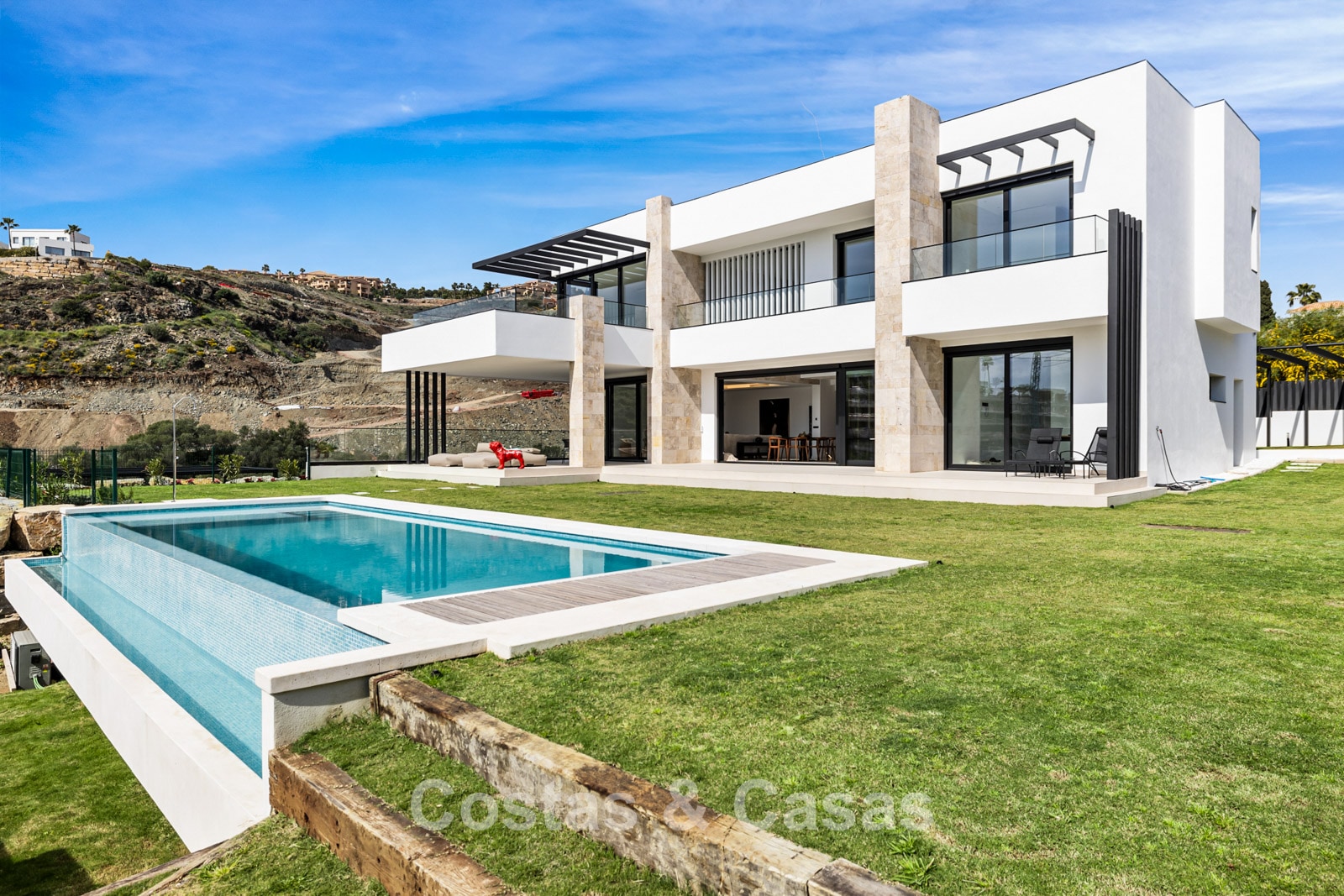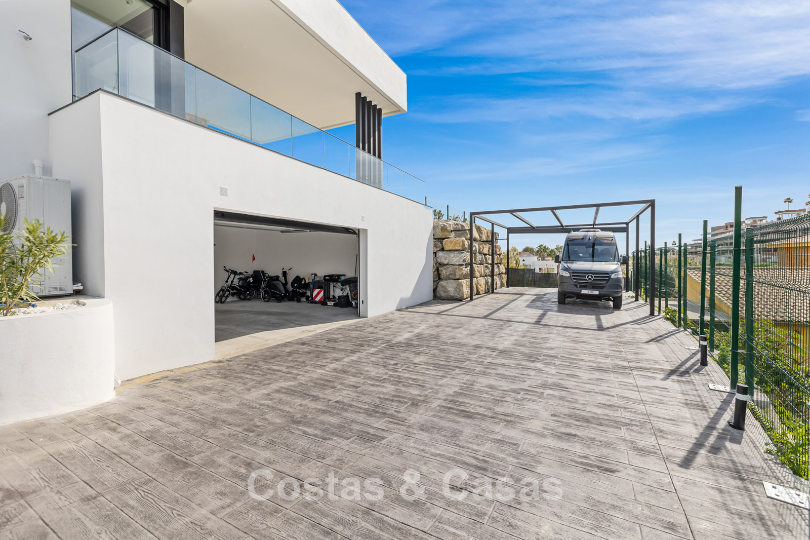 Villa independiente de lujo con una arquitectura moderna y minimalista con líneas limpias y un diseño abierto que combina perfectamente con el entorno mediterráneo. Terminada en 2024 según los más altos estándares de calidad. Entrada, hall, amplio living y comedor con techos altos. Grandes ventanales de planta a techo y barandillas de vidrio maximizan la luz y brindan una conexión perfecta entre el interior y el exterior. Una cocina abierta y totalmente equipada con electrodomésticos Miele y barra de desayuno. Comedor integrado. 4 dormitorios, 4 baños y aseo independiente. El dormitorio principal en suite dispone de vestidor. En la planta inferior hay una gran sala polivalente que se puede configurar libremente. Suelos de piedra natural de gran formato en color crema. Lavandería, equipada con espacio de almacenaje y máquinas Miele. Trastero. Garaje interior para 2 coches. Al lado del garaje hay una cochera cubierta para 2 coches.