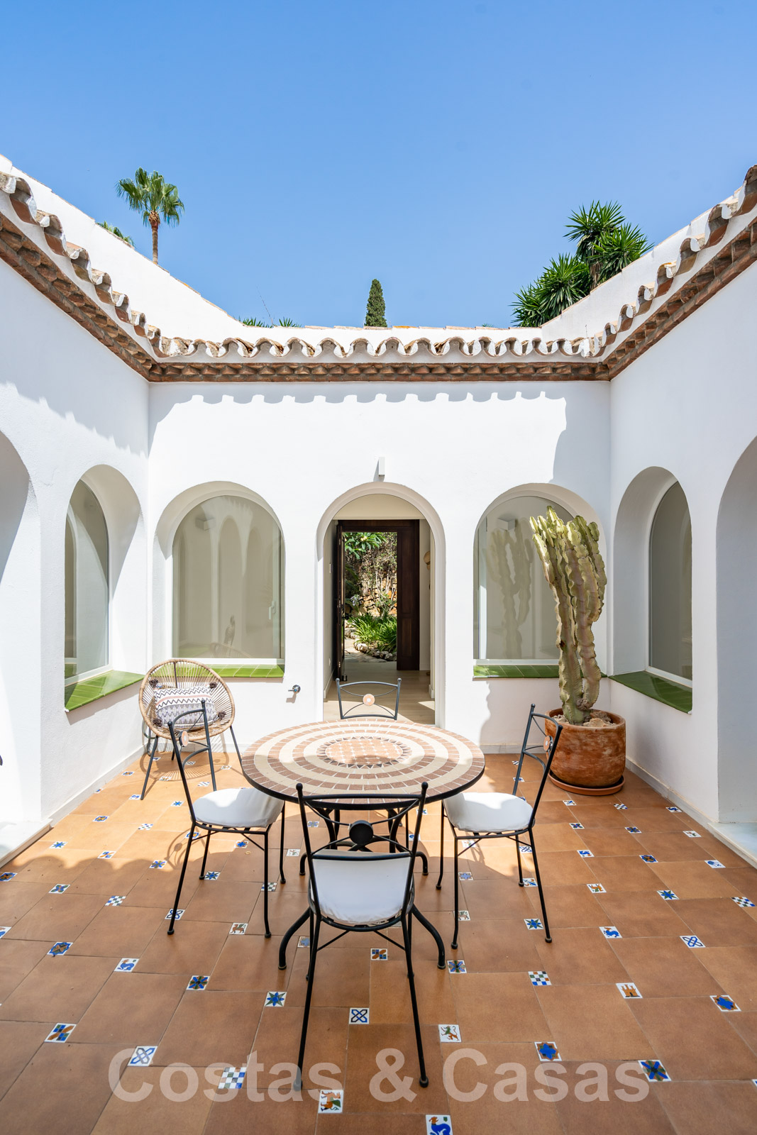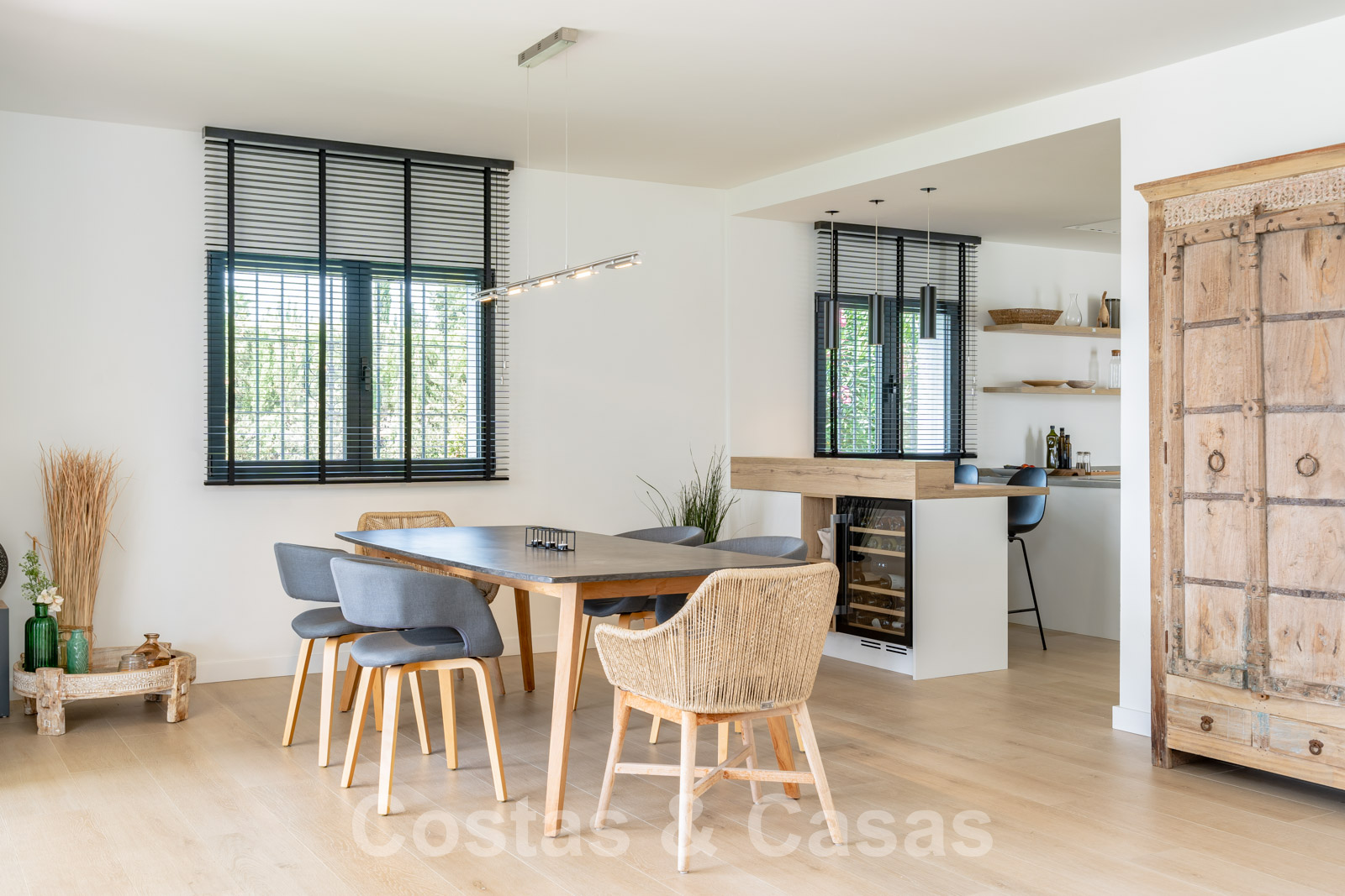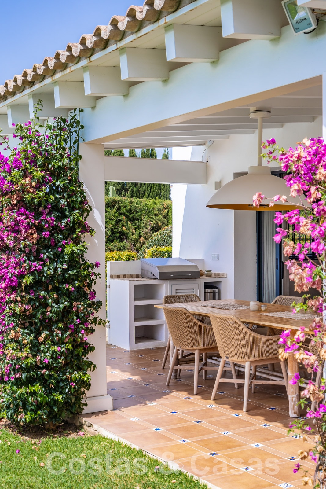 Villa de una sola planta con un estilo arquitectónico tradicional español. Renovado en 2020 a un alto nivel. Interior muy luminoso y ventilado gracias a la distribución abierta, ventanas altas y un patio central. Amplio salón de TV equipado con chimenea. Cocina abierta totalmente equipada con nevera para vinos y barra de desayuno. Comedor integrado. 4 dormitorios, 3 baños. Suelos de parque de calidad. Garaje privado cerrado e independiente.
