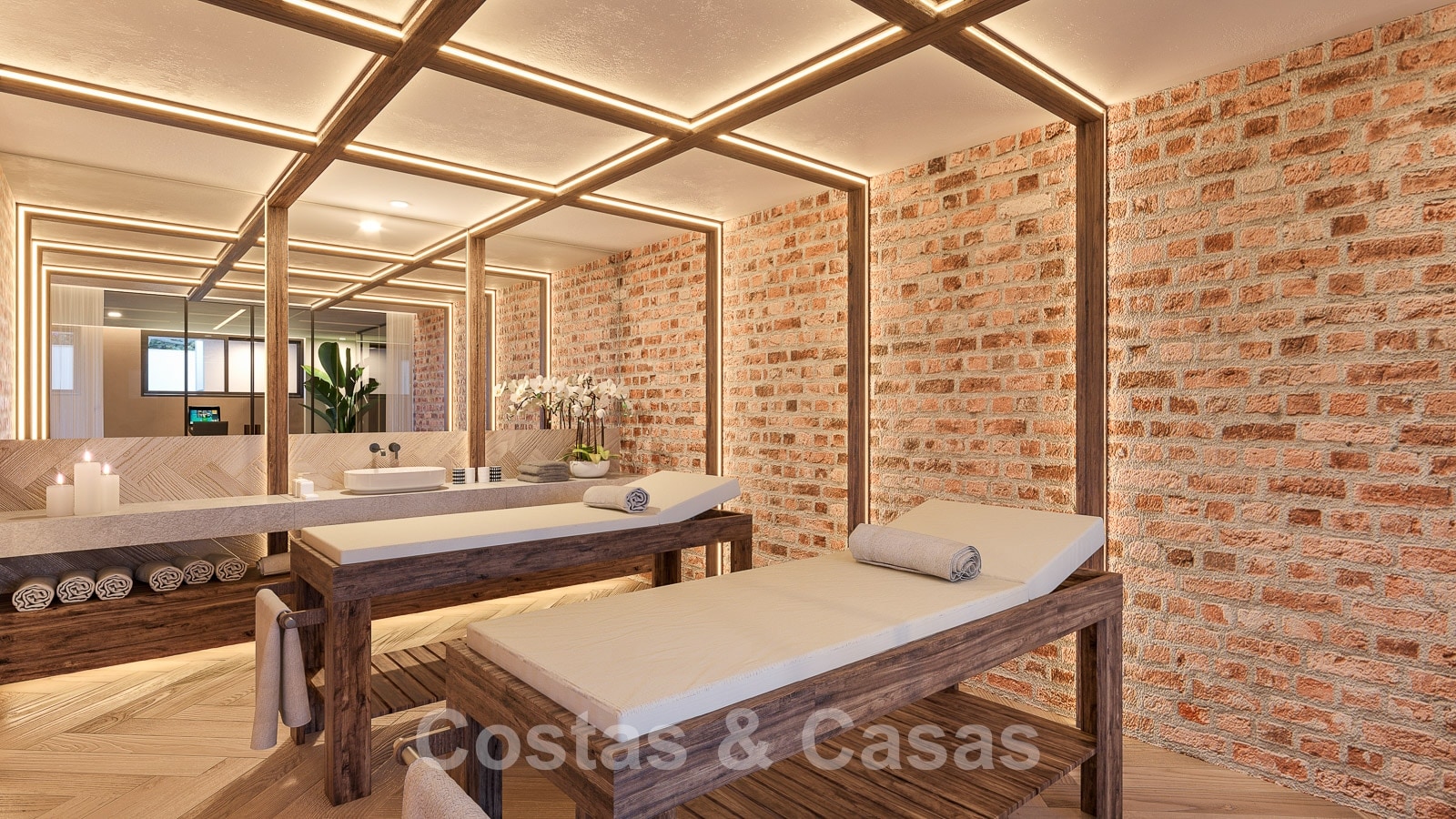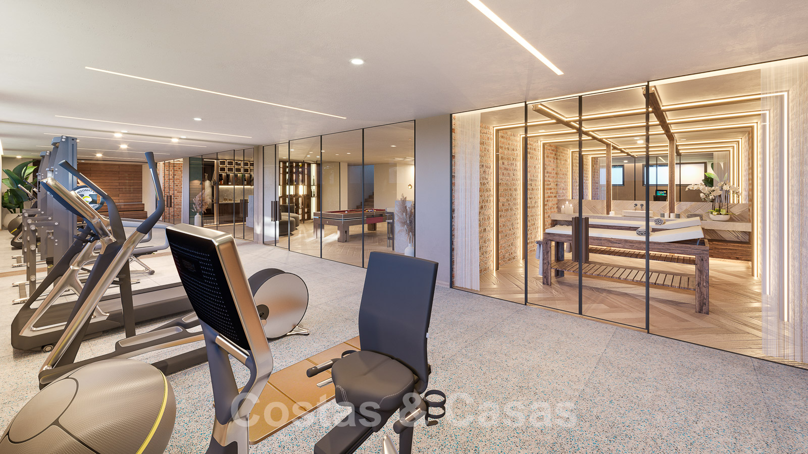 Este espacio está separado por altas ventanas correderas de cristal de un gimnasio totalmente equipado, una sauna y una sala de masajes.