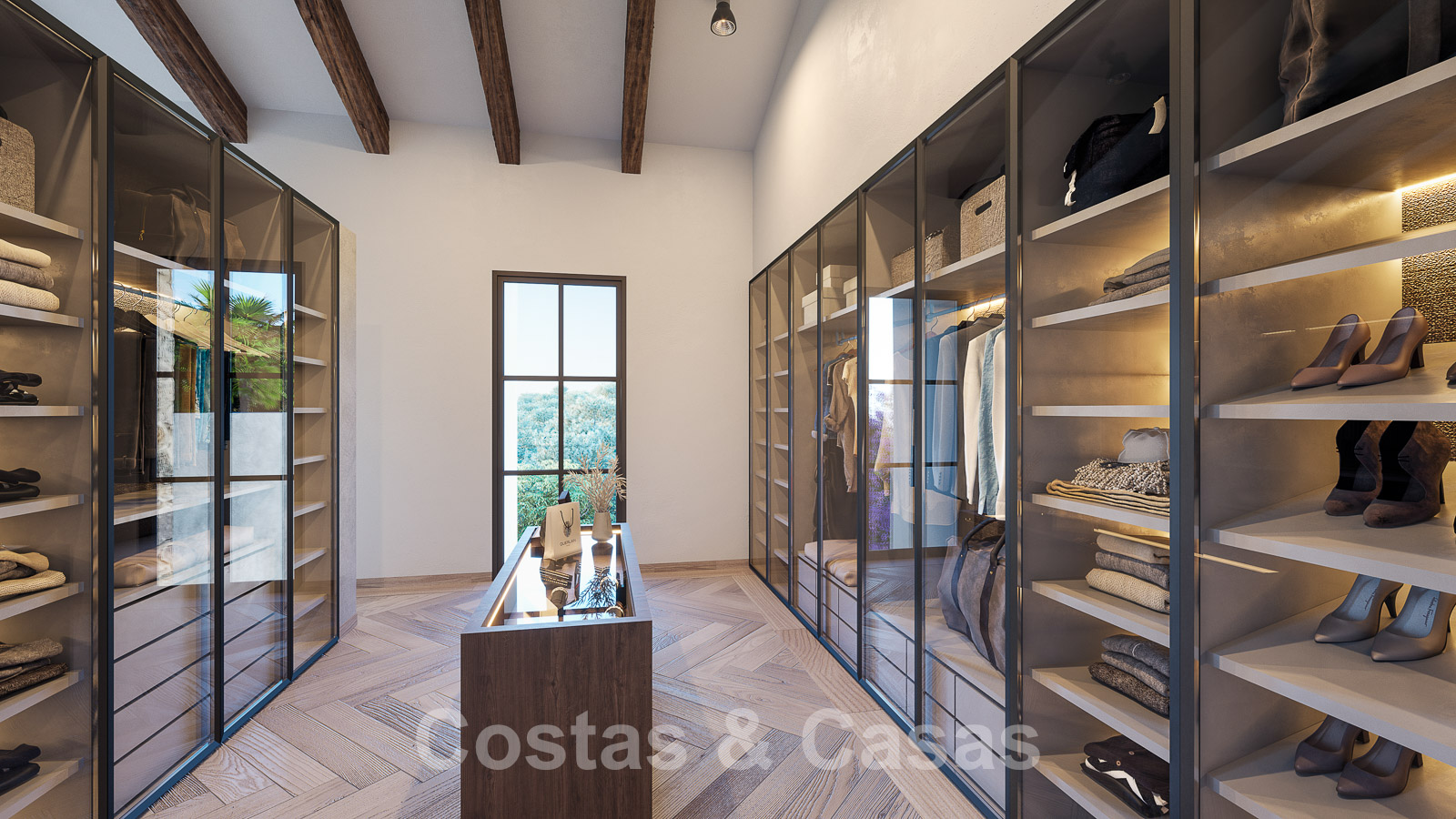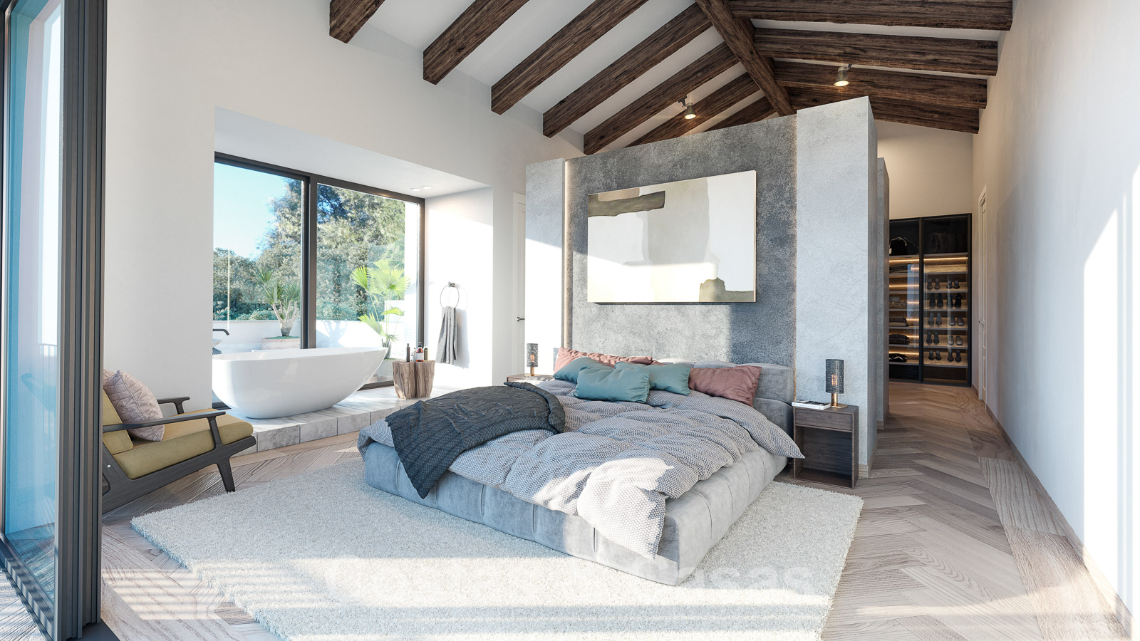 Entrando, a la derecha se encuentra la espaciosa suite principal con un techo abovedado extra alto, un baño central - abierto, vestidor y una gran terraza abierta donde se disfruta de espectaculares vistas al mar.