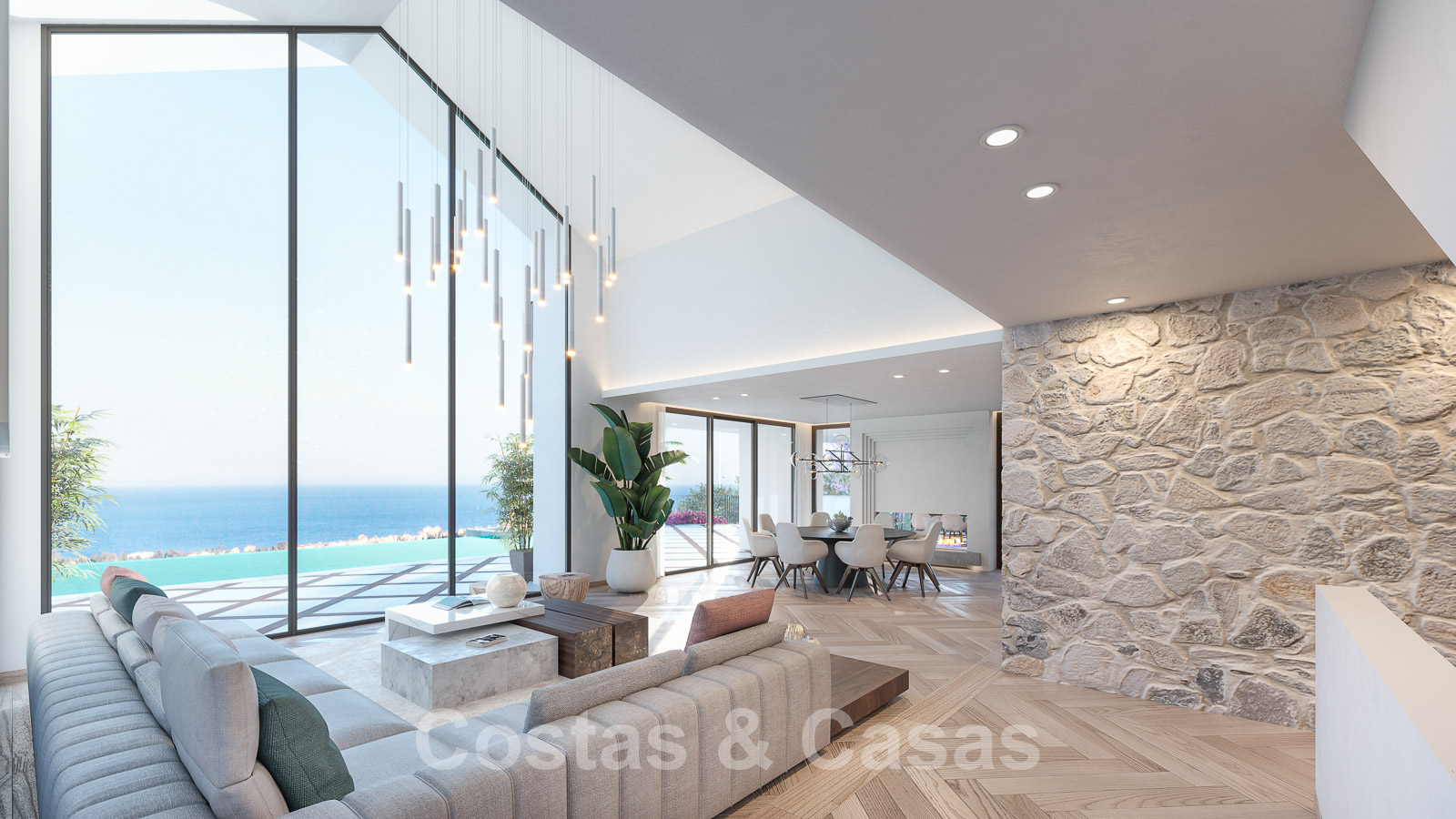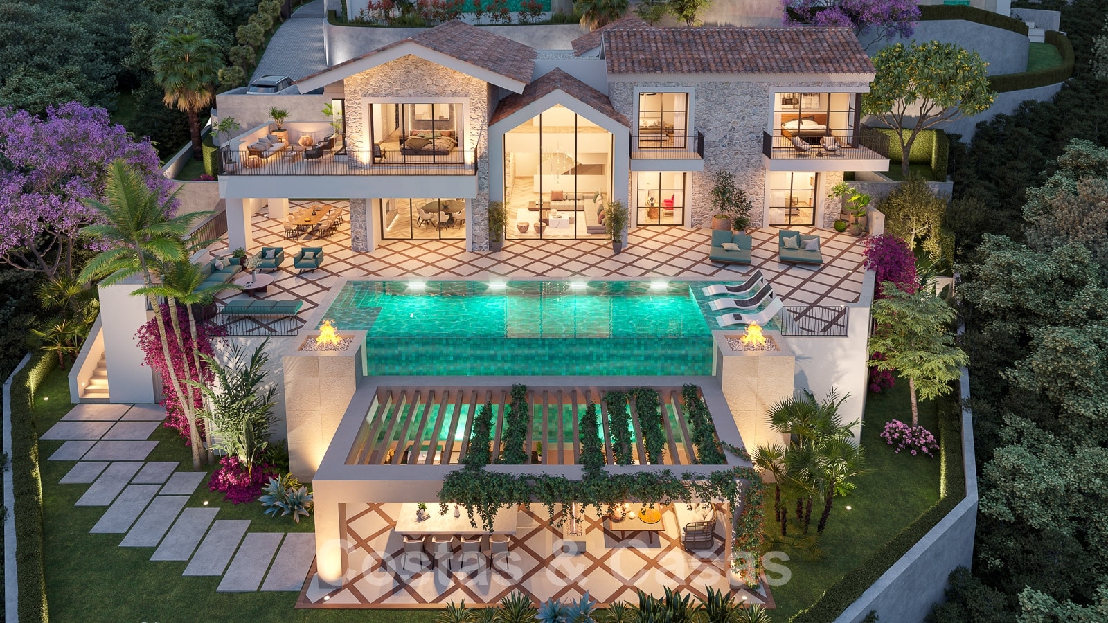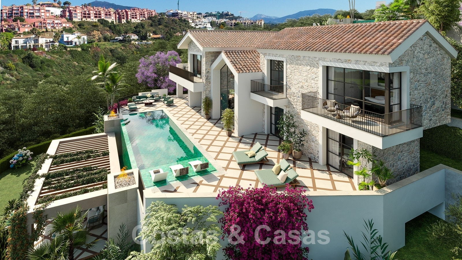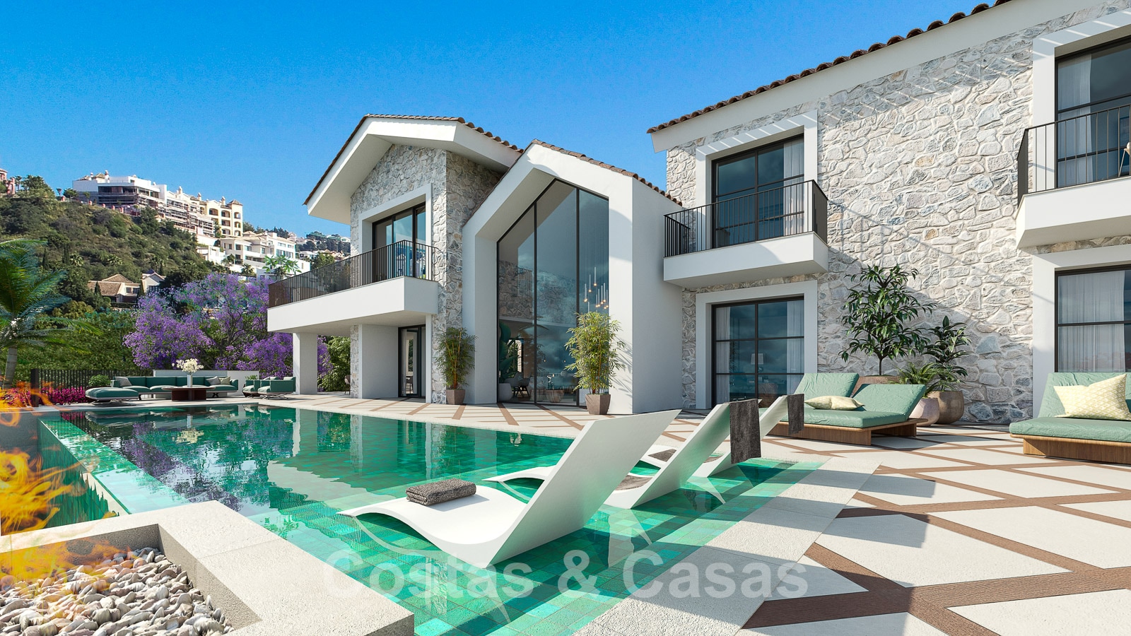 Villa independiente con elementos constructivos de piedra natural que desprenden lujo y calidez.