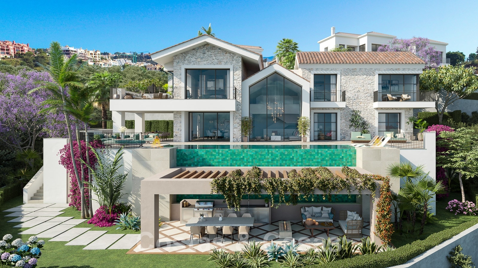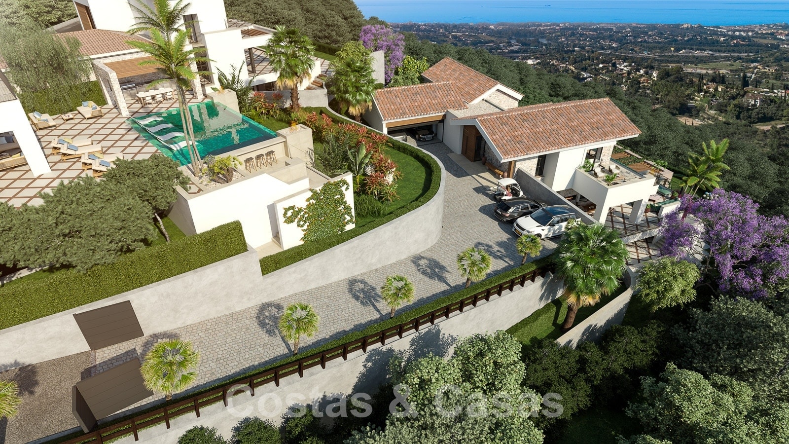 Una colección de 3 villas situadas en una urbanización icónica en una posición elevada, rodeada de varios campos de golf prominentes incluyendo Los Arqueros, La Quinta, Los Naranjos, Aloha y Las Brisas.