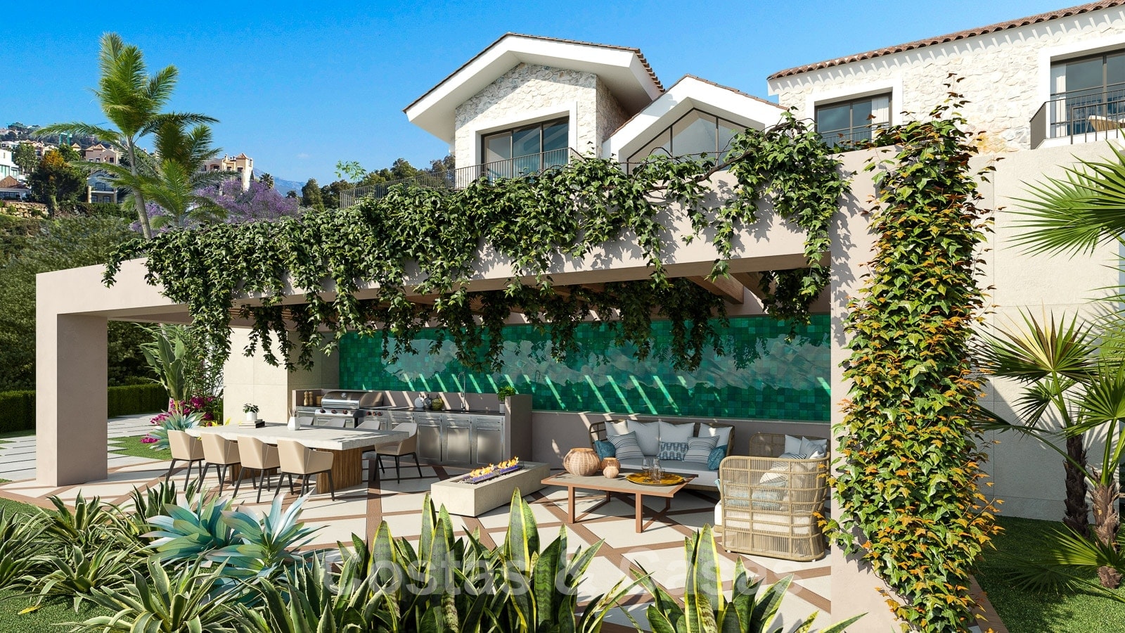 Una terraza con pérgola dispone de cocina exterior con comedor y chill-out con chimenea.