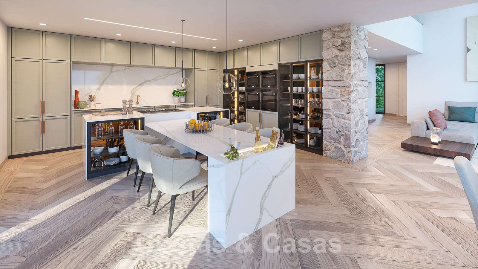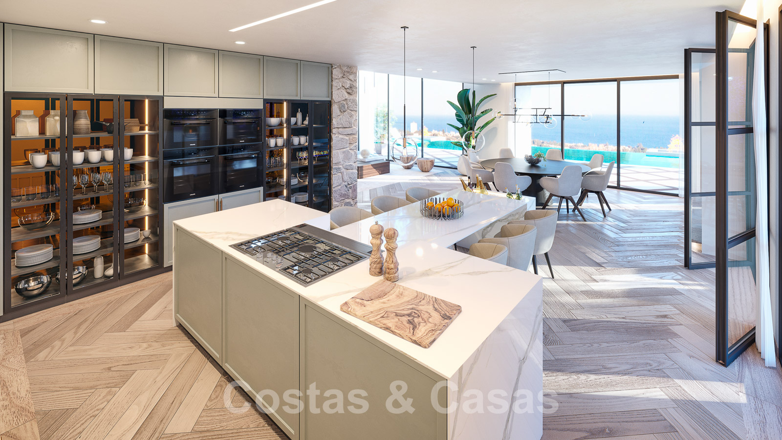 Cocina moderna e intemporal, totalmente equipada con isla de cocción y barra de desayuno.