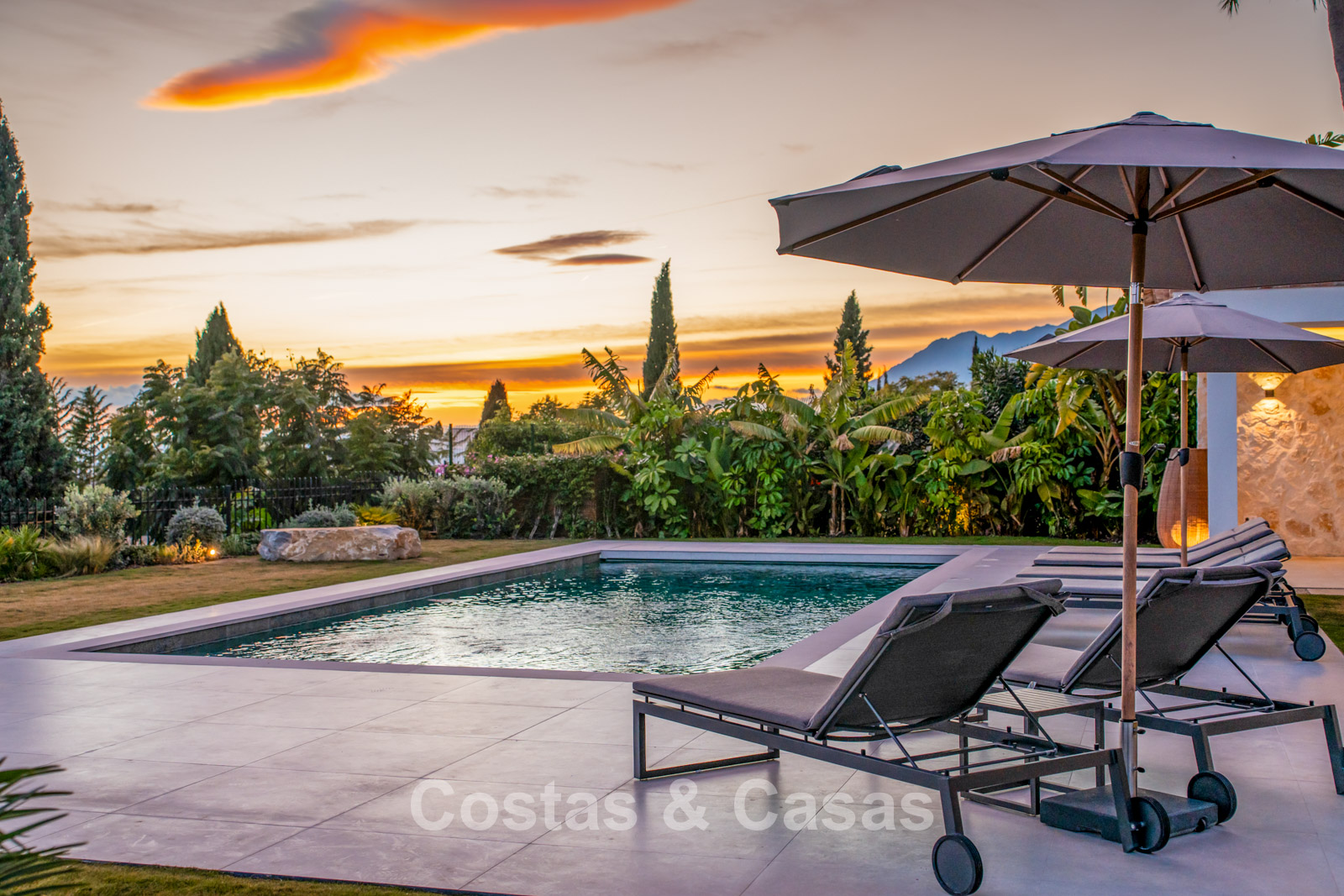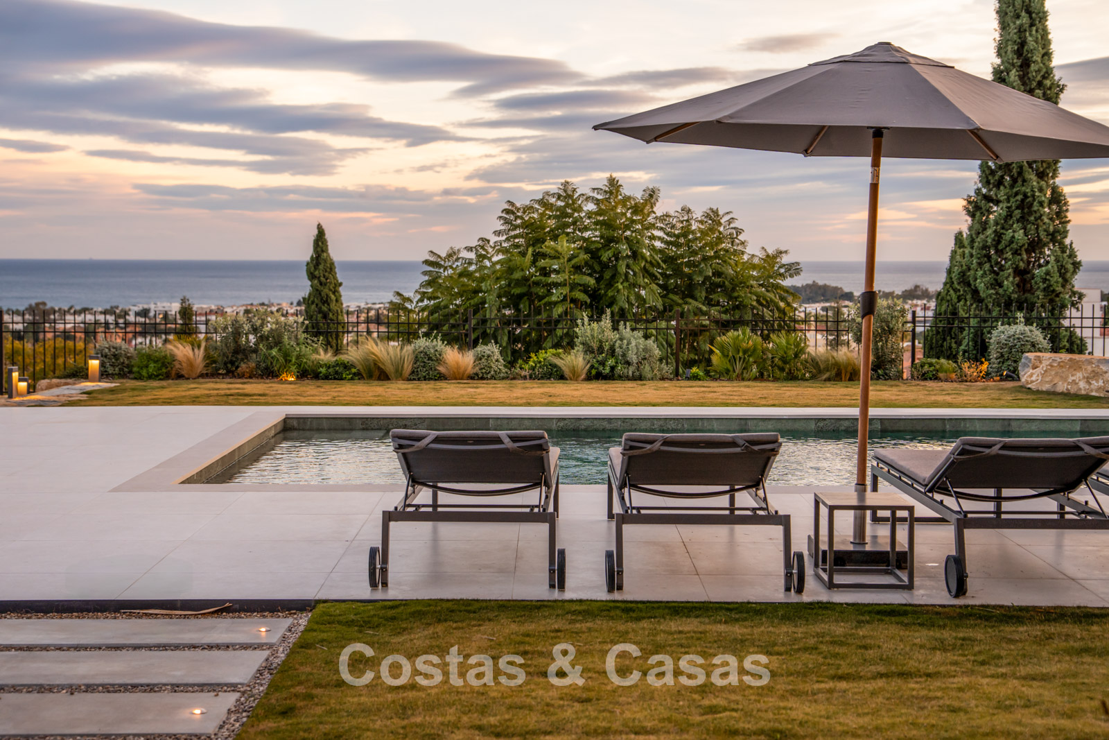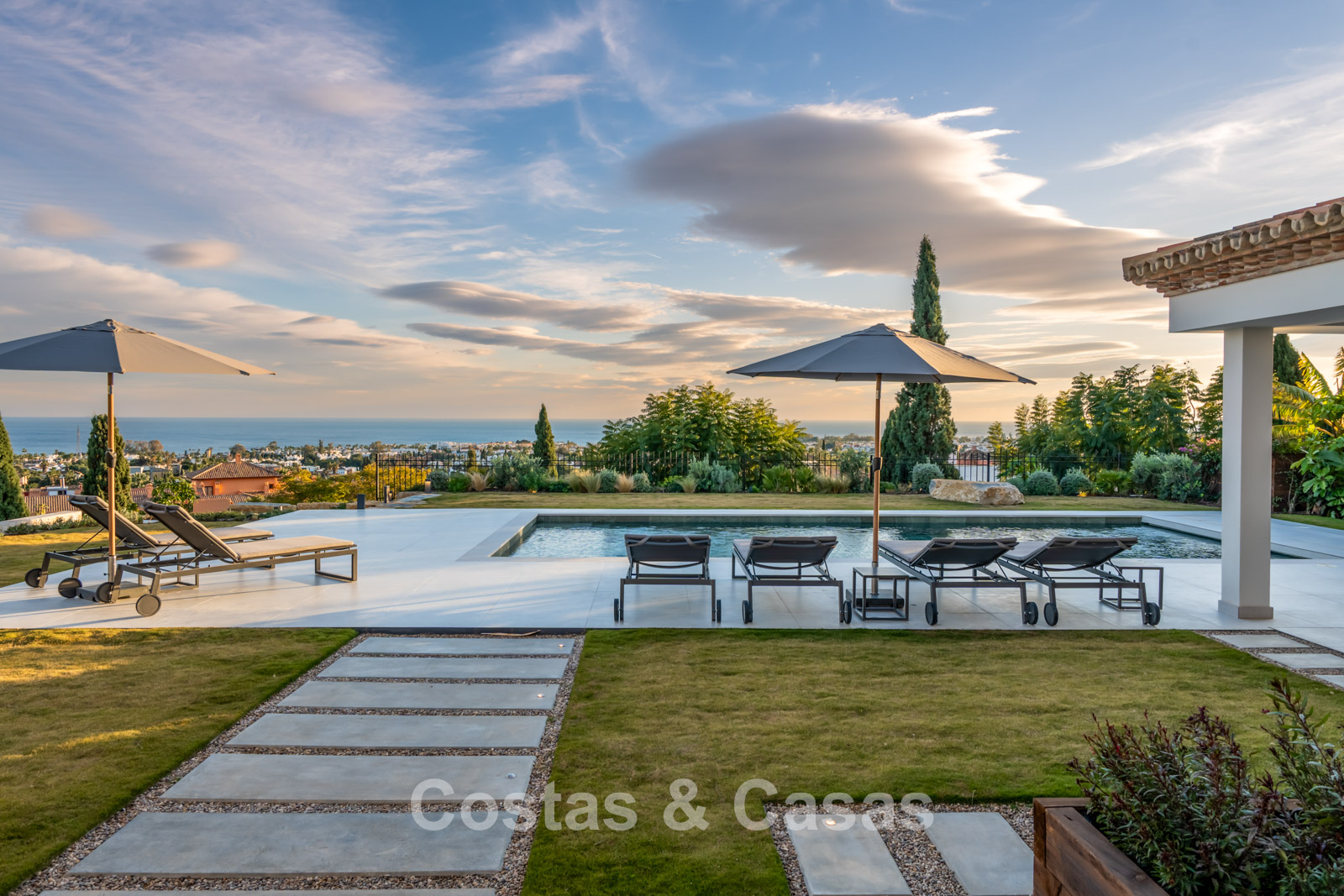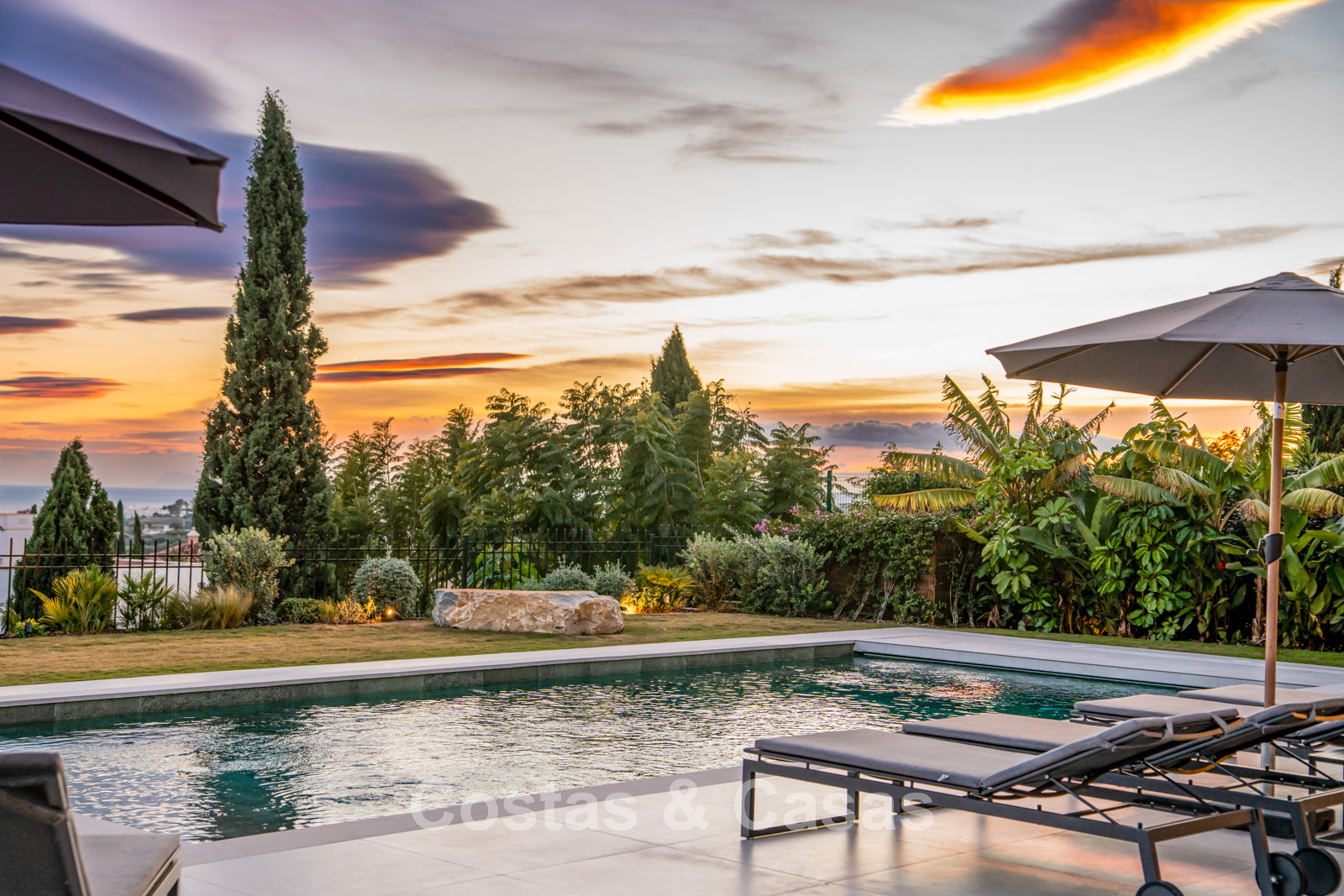 Amplia parcela vallada en una posición elevada. El jardín es un auténtico paraíso mediterráneo con exuberante vegetación tropical, elegantes zonas chill-out y una hoguera. La piscina climatizada está rodeada de modernas terrazas solárium. La elegante cocina exterior con barbacoa Napoleon de alta gama es ideal para largas veladas al aire libre. Orientación sur. Desde todos los niveles se disfrutan impresionantes vistas abiertas al mar y la costa.