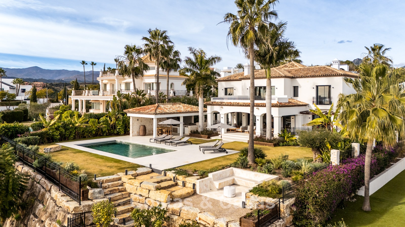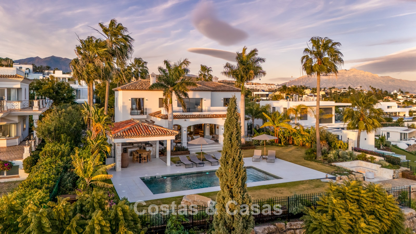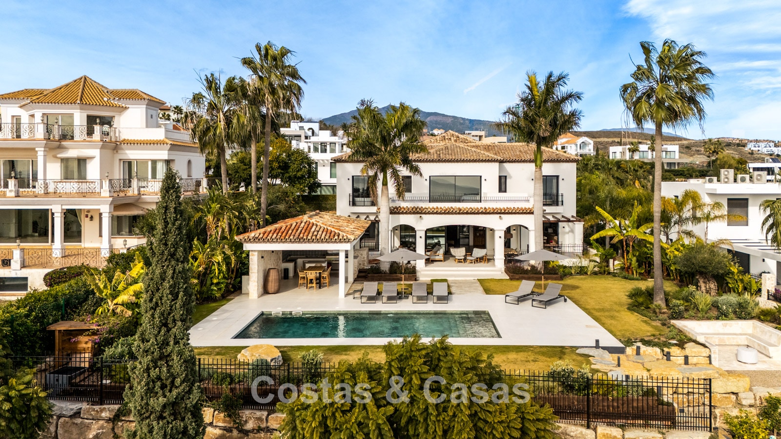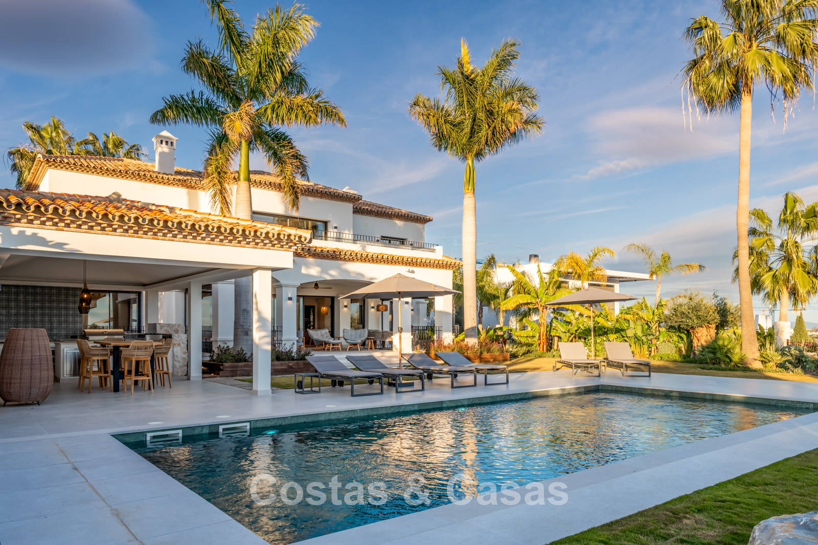 Amplia villa que combina la arquitectura andaluza tradicional con el confort moderno. Recientemente renovada por completo con un nivel de calidad excepcional, incorporando las últimas tecnologías y un excelente trabajo artesanal. Diseño interior moderno y cuidado hasta el último detalle. Grandes ventanales correderos con perfiles empotrados crean una transición fluida entre interior y exterior, permitiendo una abundante entrada de luz natural. Espacio de salón de concepto abierto con zona de TV y comedor integrado. Cocina de diseño a medida equipada con electrodomésticos Gaggenau de alta gama y una isla con barra de desayuno. Los cuatro dormitorios disponen de baño en suite y acabados de lujo. La planta inferior alberga una zona privada de bienestar y entretenimiento. Incluye un gimnasio totalmente equipado, sala de masajes y un bar versátil con sala de juegos. El garaje tiene capacidad para dos vehículos y cuenta con punto de carga para coche eléctrico.