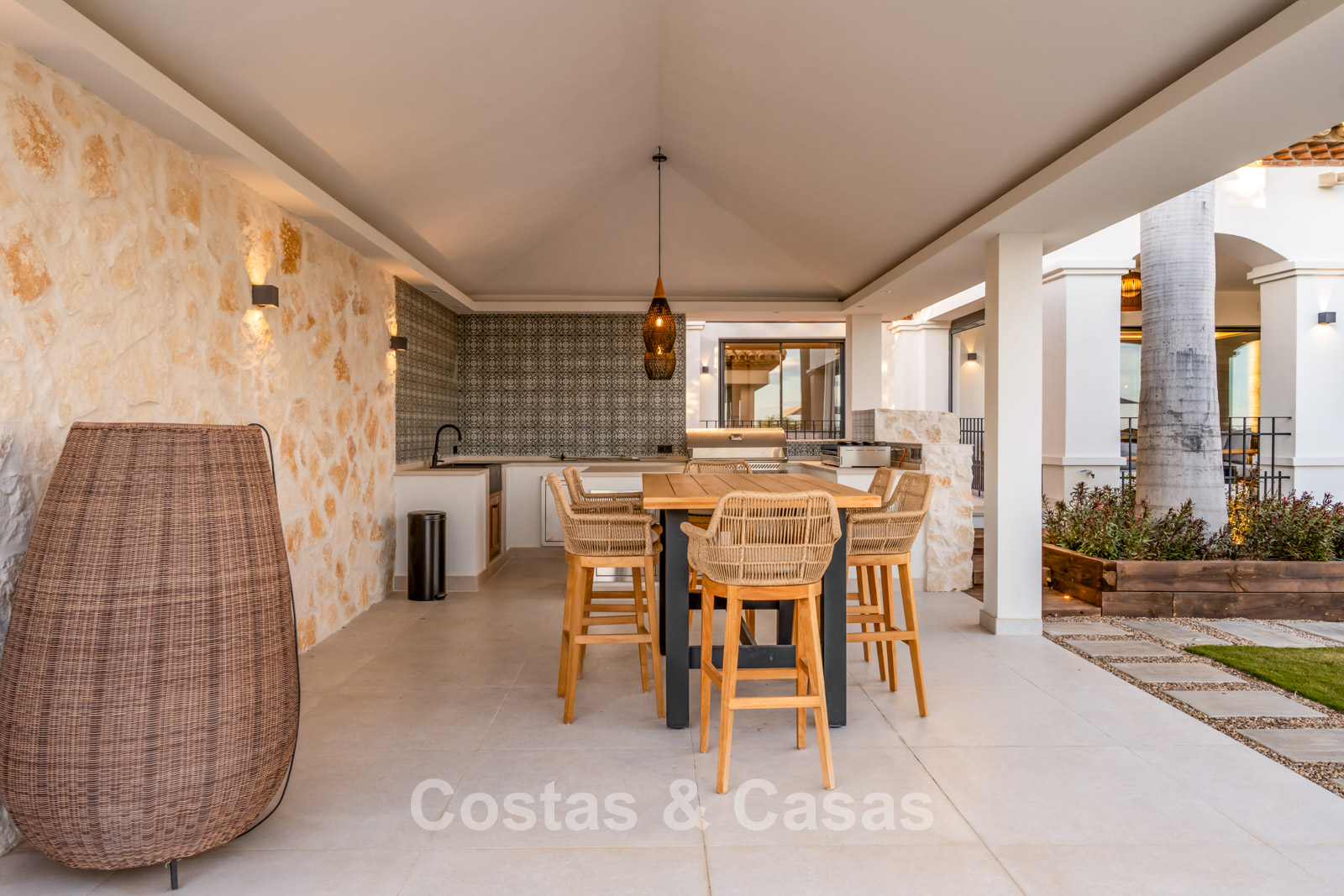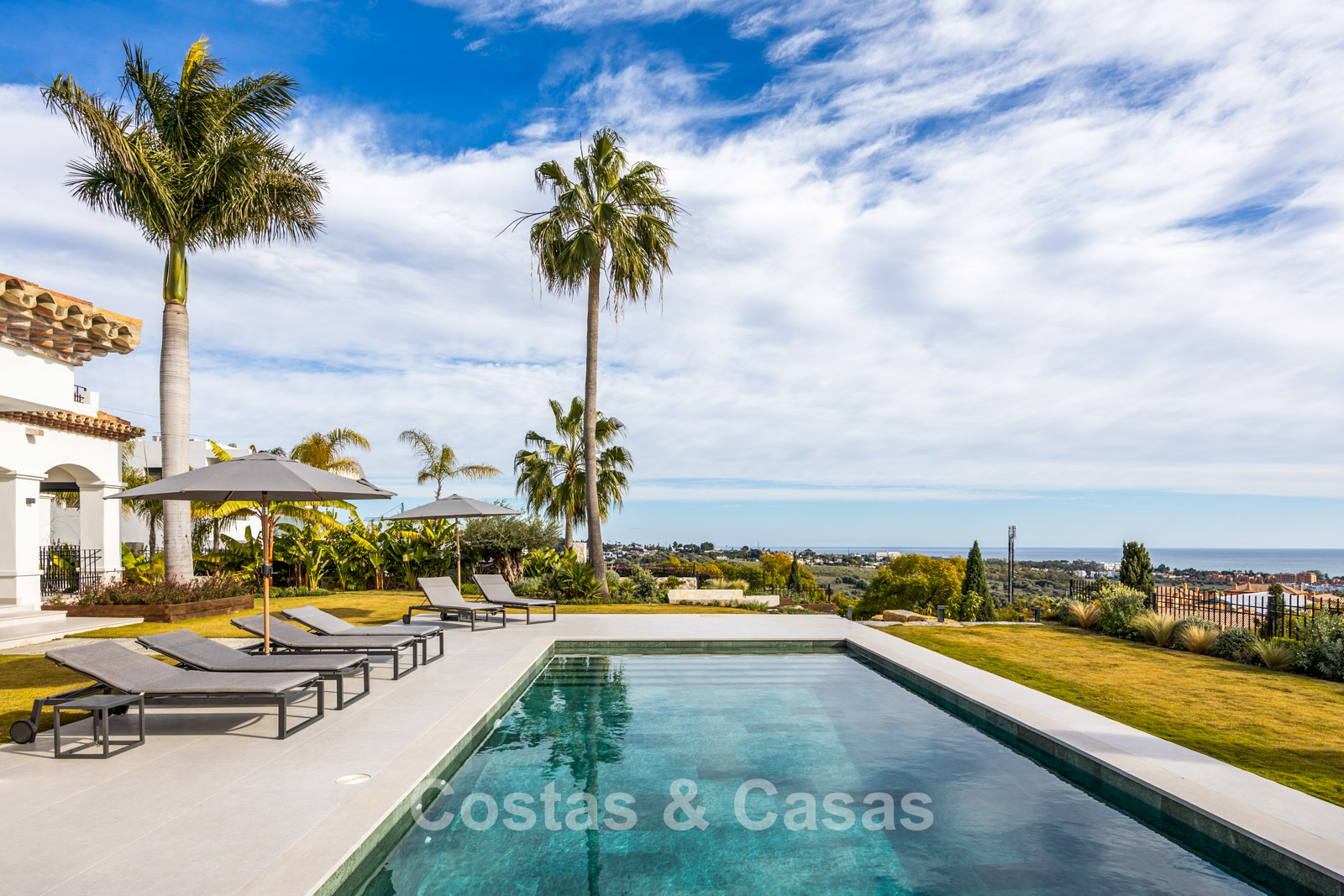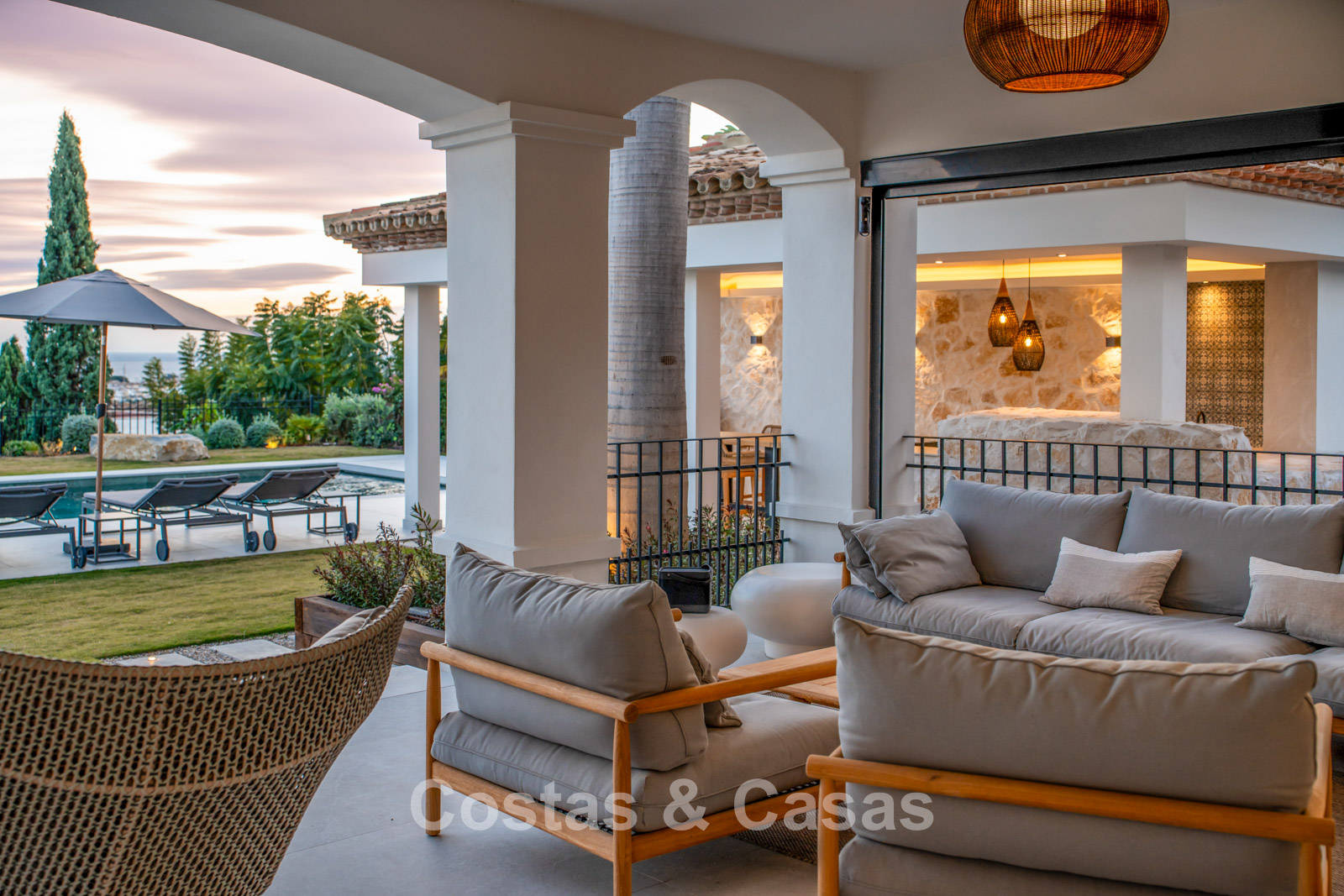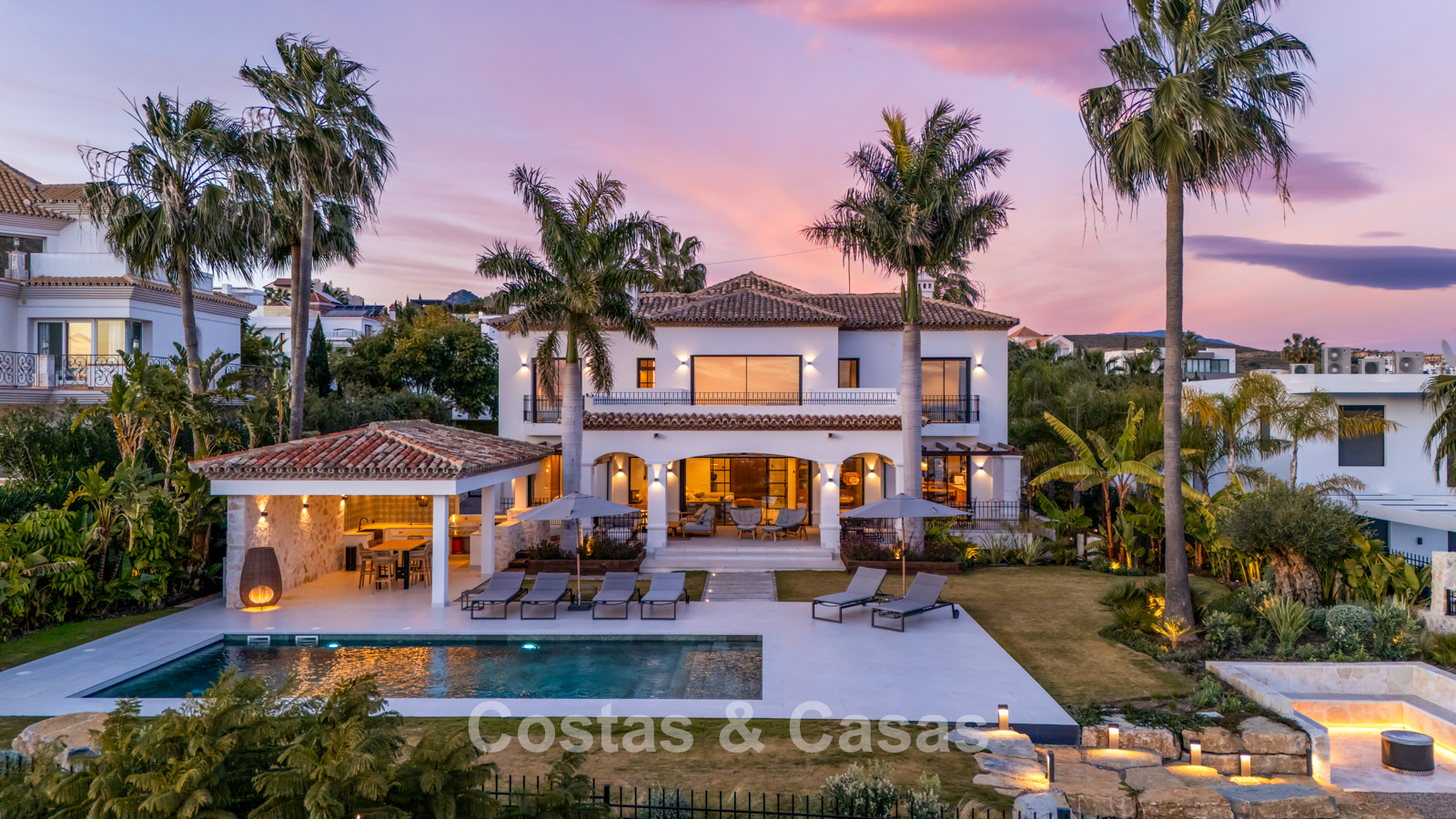 Amplia villa que combina la arquitectura andaluza tradicional con el confort moderno. Recientemente renovada por completo con un nivel de calidad excepcional, incorporando las últimas tecnologías y un excelente trabajo artesanal. Diseño interior moderno y cuidado hasta el último detalle. Grandes ventanales correderos con perfiles empotrados crean una transición fluida entre interior y exterior, permitiendo una abundante entrada de luz natural. Espacio de salón de concepto abierto con zona de TV y comedor integrado. Cocina de diseño a medida equipada con electrodomésticos Gaggenau de alta gama y una isla con barra de desayuno. Los cuatro dormitorios disponen de baño en suite y acabados de lujo. La planta inferior alberga una zona privada de bienestar y entretenimiento. Incluye un gimnasio totalmente equipado, sala de masajes y un bar versátil con sala de juegos. El garaje tiene capacidad para dos vehículos y cuenta con punto de carga para coche eléctrico.