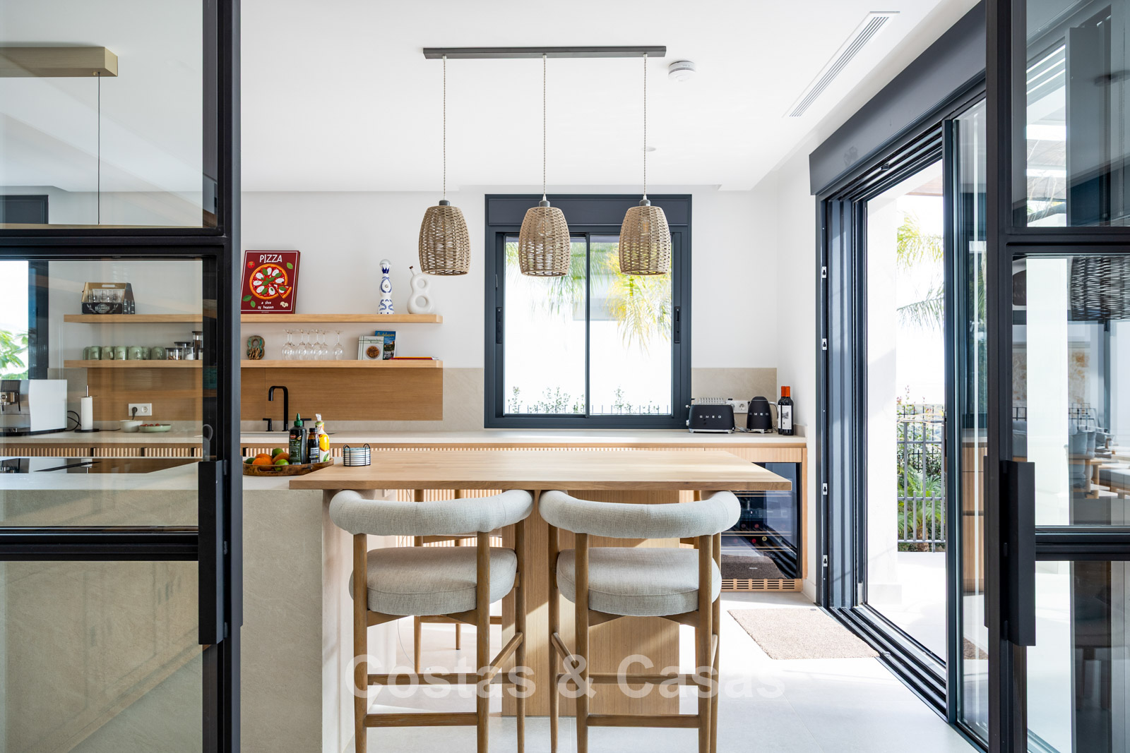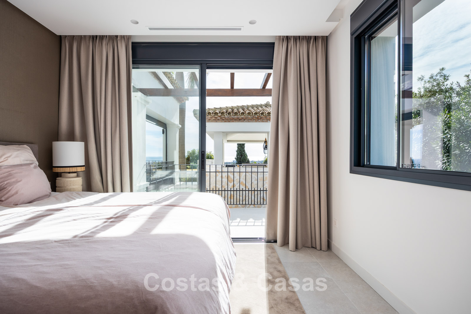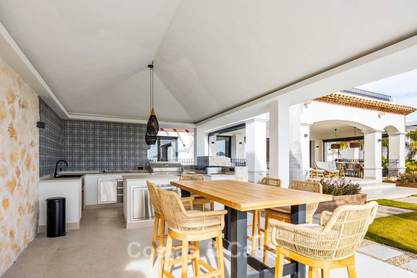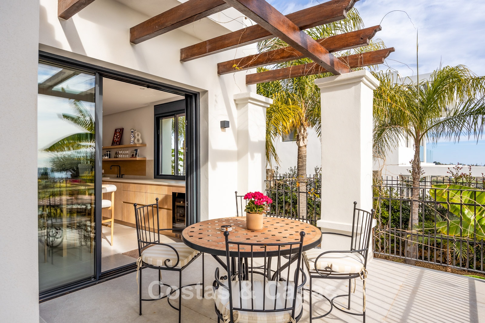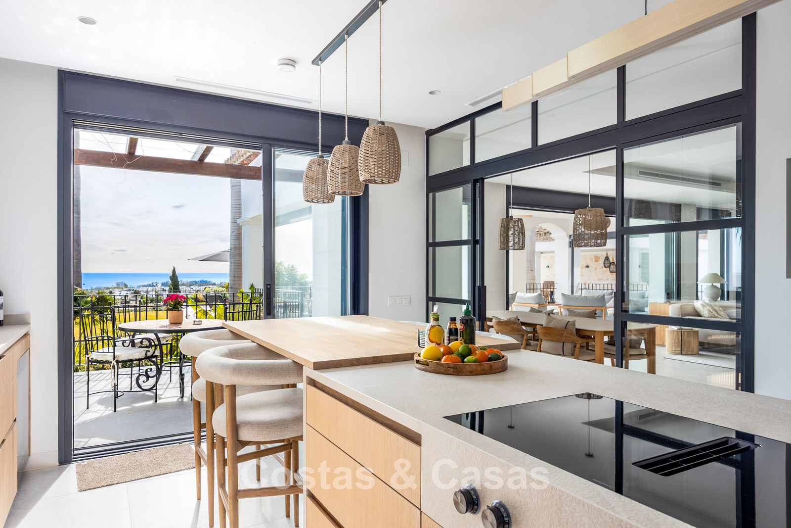 Amplia villa que combina la arquitectura andaluza tradicional con el confort moderno. Recientemente renovada por completo con un nivel de calidad excepcional, incorporando las últimas tecnologías y un excelente trabajo artesanal. Diseño interior moderno y cuidado hasta el último detalle. Grandes ventanales correderos con perfiles empotrados crean una transición fluida entre interior y exterior, permitiendo una abundante entrada de luz natural. Espacio de salón de concepto abierto con zona de TV y comedor integrado. Cocina de diseño a medida equipada con electrodomésticos Gaggenau de alta gama y una isla con barra de desayuno. Los cuatro dormitorios disponen de baño en suite y acabados de lujo. La planta inferior alberga una zona privada de bienestar y entretenimiento. Incluye un gimnasio totalmente equipado, sala de masajes y un bar versátil con sala de juegos. El garaje tiene capacidad para dos vehículos y cuenta con punto de carga para coche eléctrico.