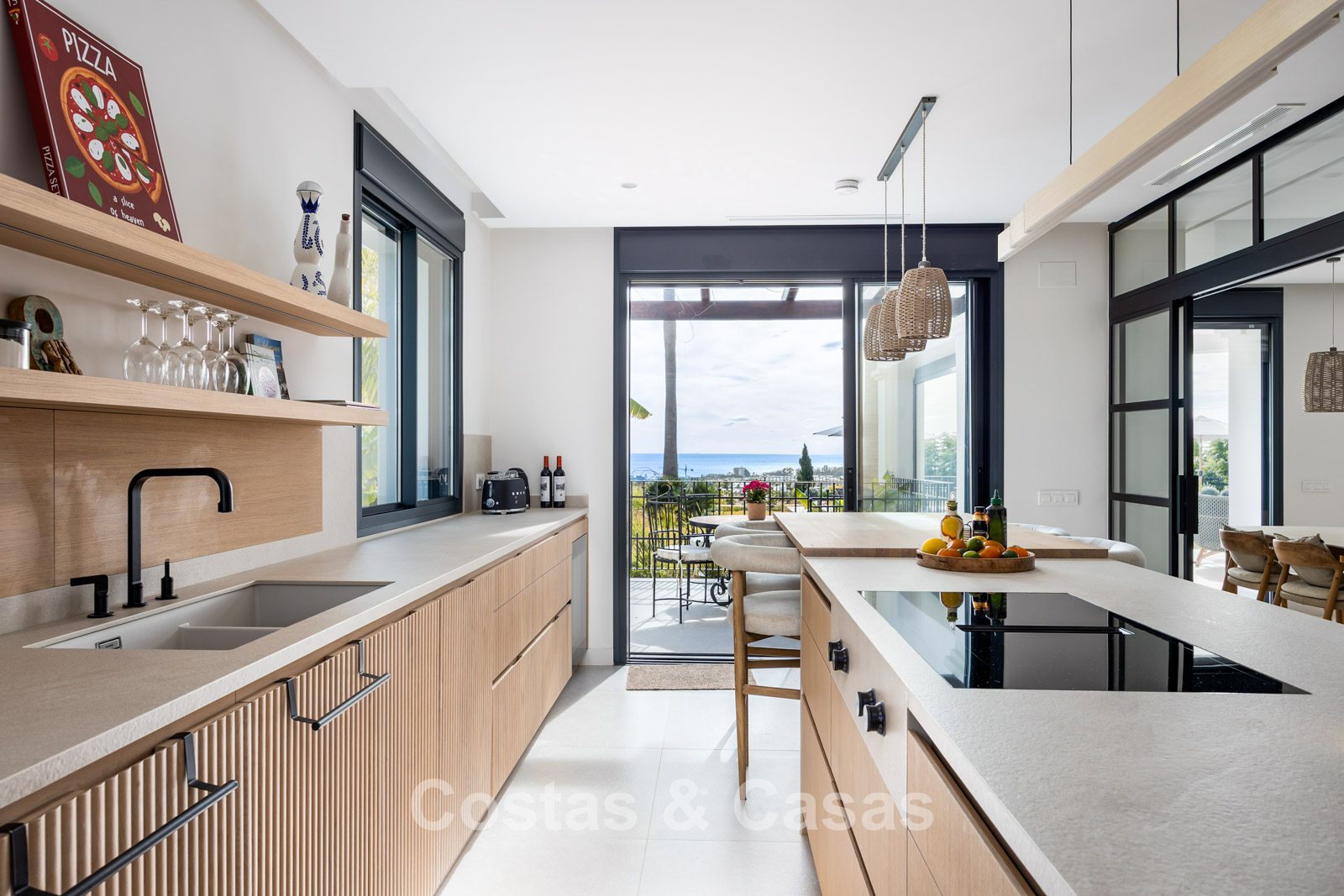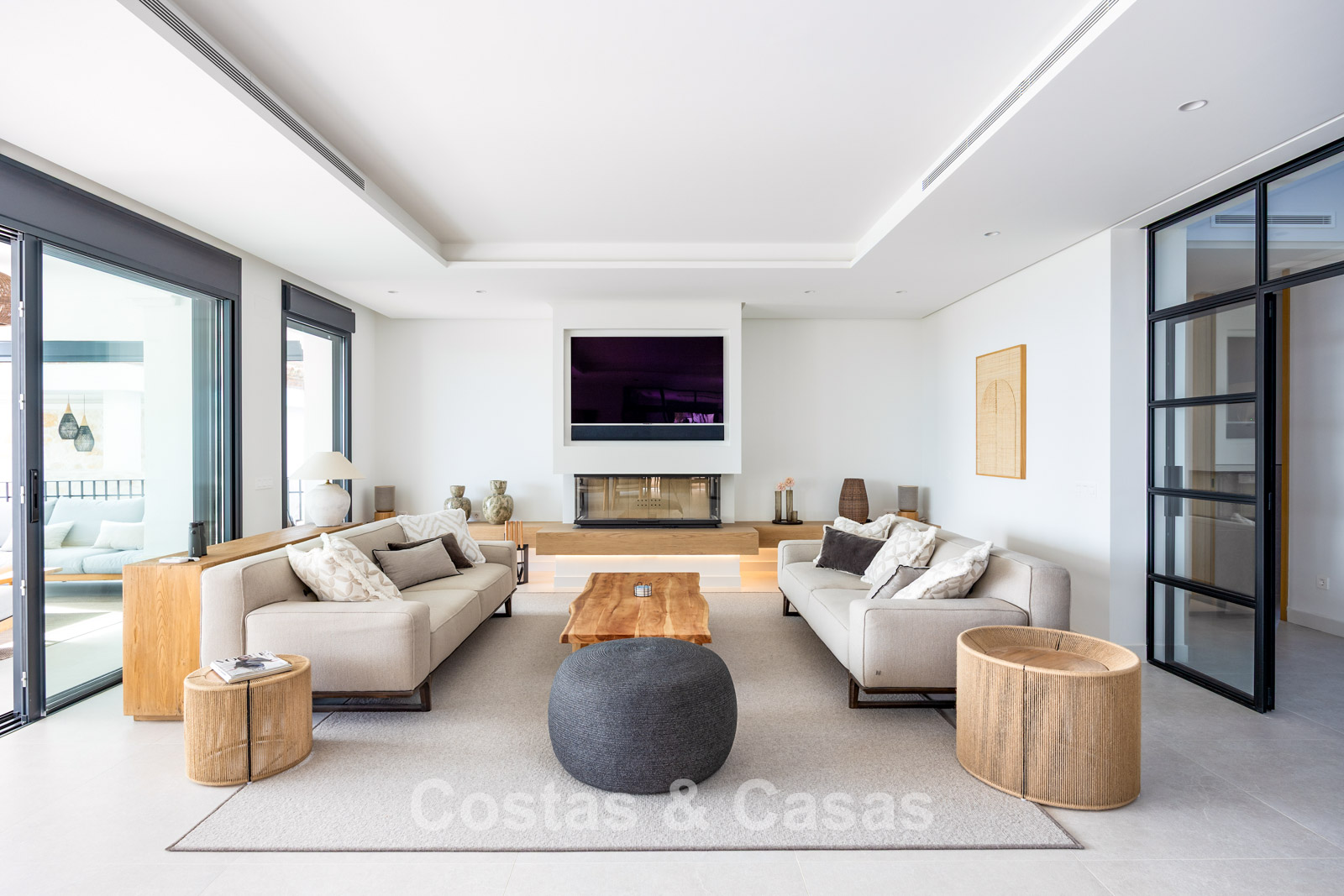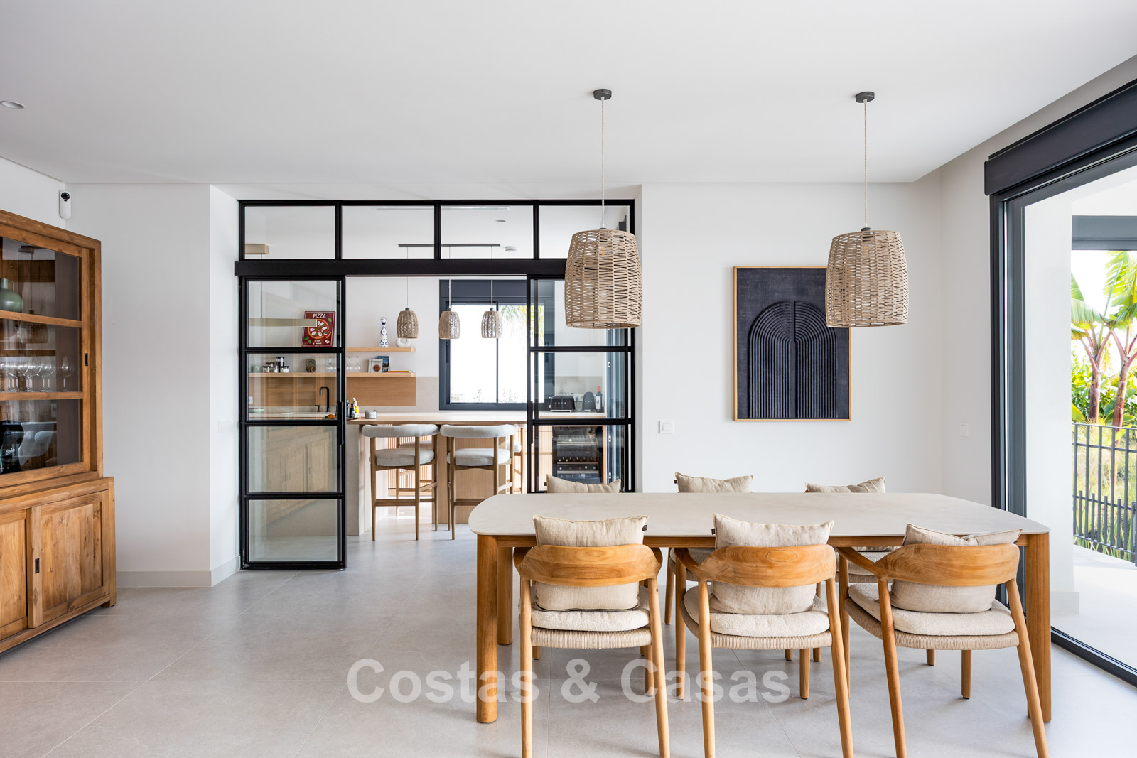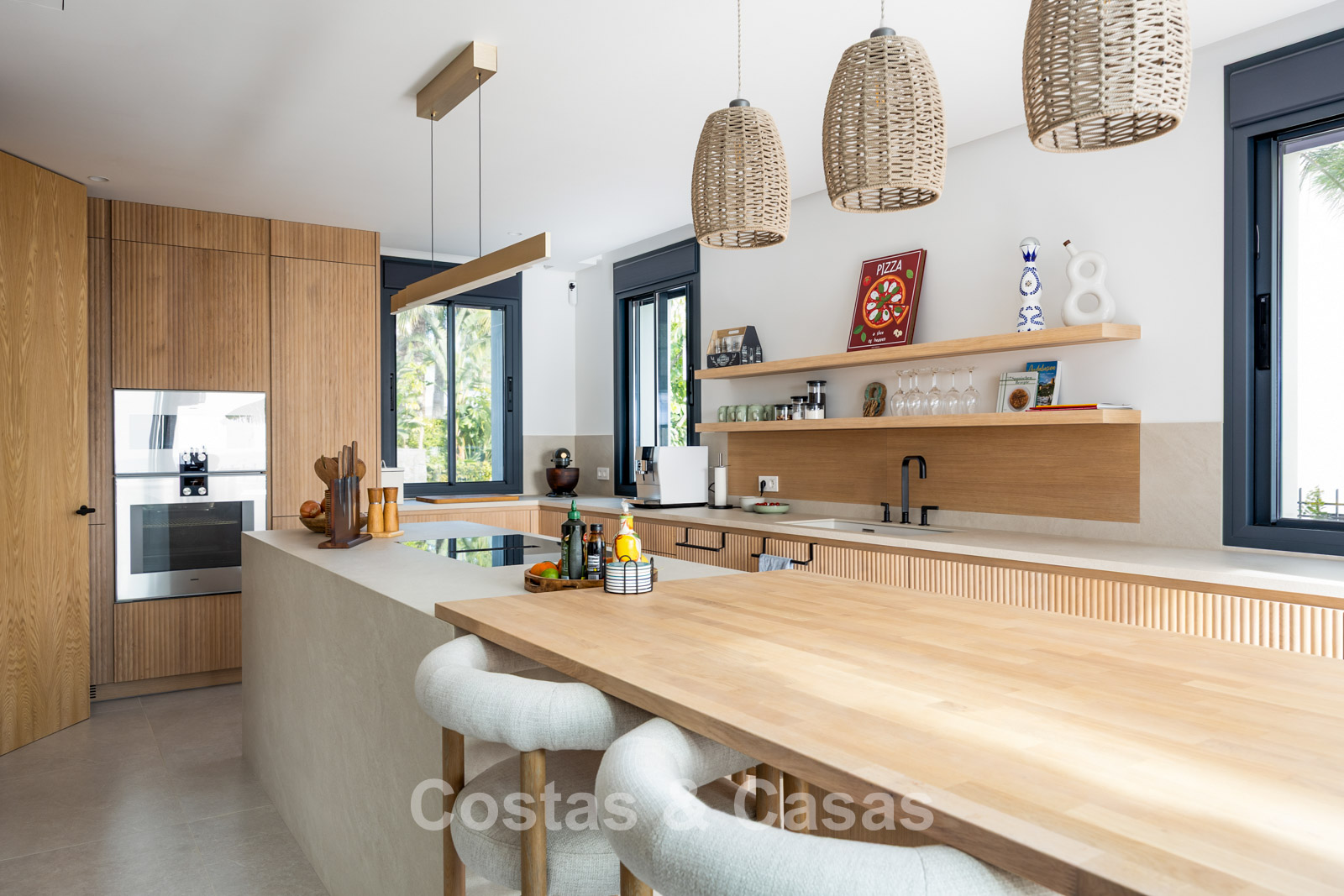 Amplia villa que combina la arquitectura andaluza tradicional con el confort moderno. Recientemente renovada por completo con un nivel de calidad excepcional, incorporando las últimas tecnologías y un excelente trabajo artesanal. Diseño interior moderno y cuidado hasta el último detalle. Grandes ventanales correderos con perfiles empotrados crean una transición fluida entre interior y exterior, permitiendo una abundante entrada de luz natural. Espacio de salón de concepto abierto con zona de TV y comedor integrado. Cocina de diseño a medida equipada con electrodomésticos Gaggenau de alta gama y una isla con barra de desayuno. Los cuatro dormitorios disponen de baño en suite y acabados de lujo. La planta inferior alberga una zona privada de bienestar y entretenimiento. Incluye un gimnasio totalmente equipado, sala de masajes y un bar versátil con sala de juegos. El garaje tiene capacidad para dos vehículos y cuenta con punto de carga para coche eléctrico.