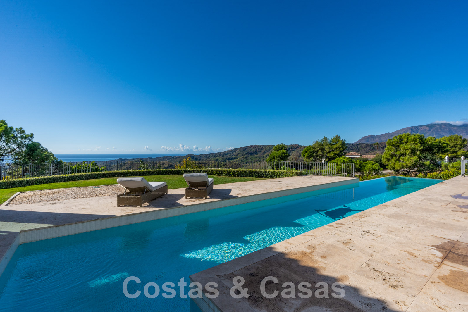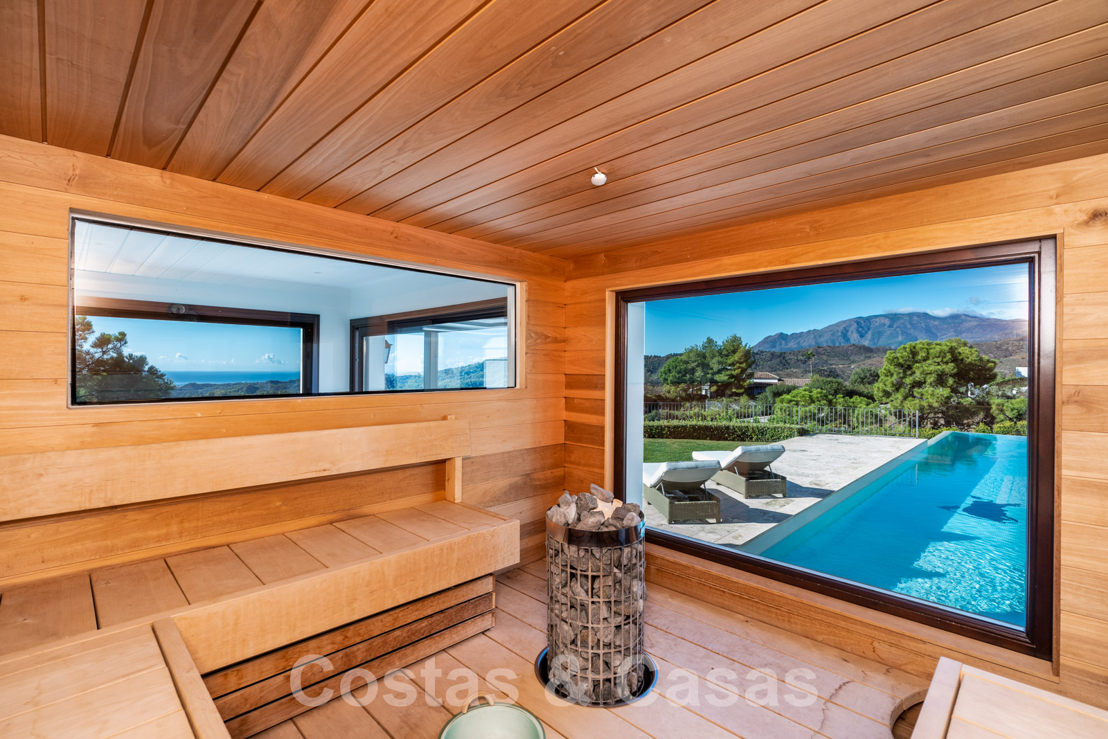 Amplia parcela inclinada en una posición elevada. Larga piscina de borde infinito con terrazas alrededor. Adyacente una construcción anexa equipada con una sauna, cuarto de ducha y trastero que posiblemente podría convertirse en un gimnasio. Terrazas cubiertas y descubiertas con espacio para instalar salones. Cocina exterior con barbacoa. Orientación sur.