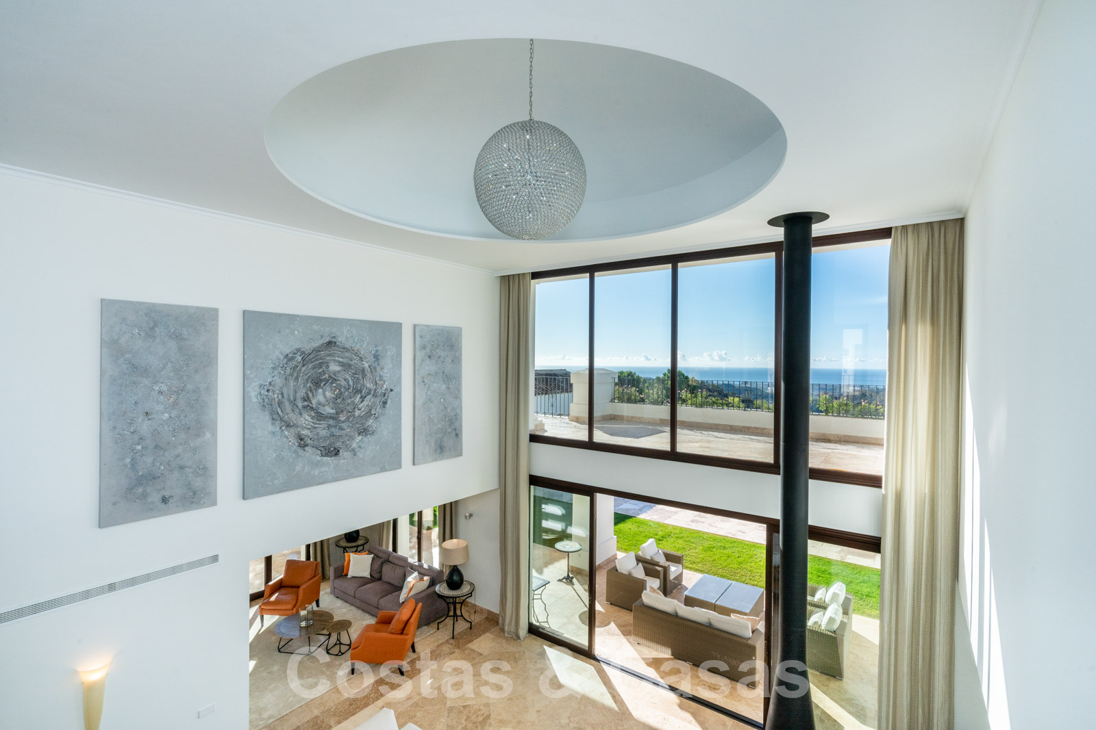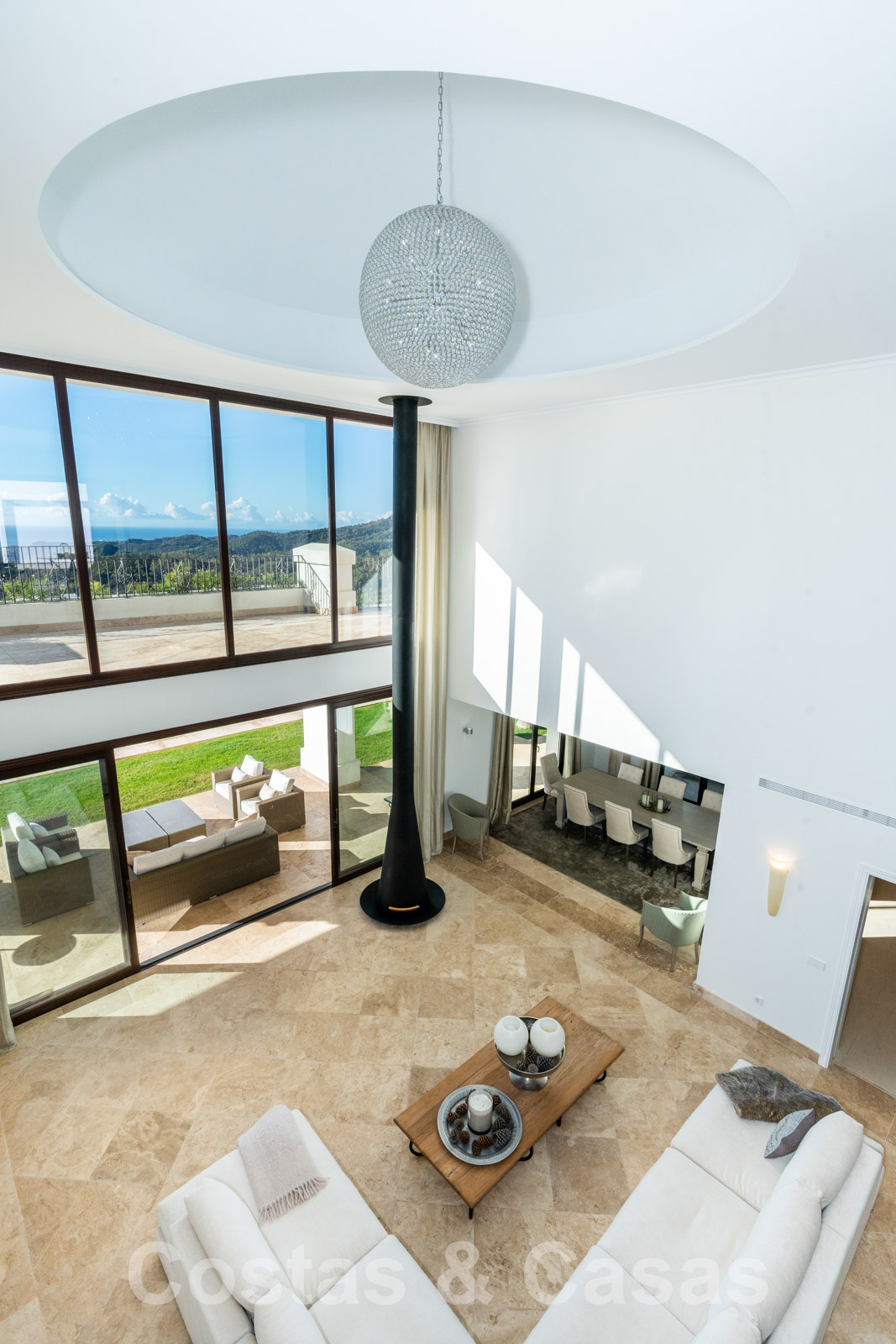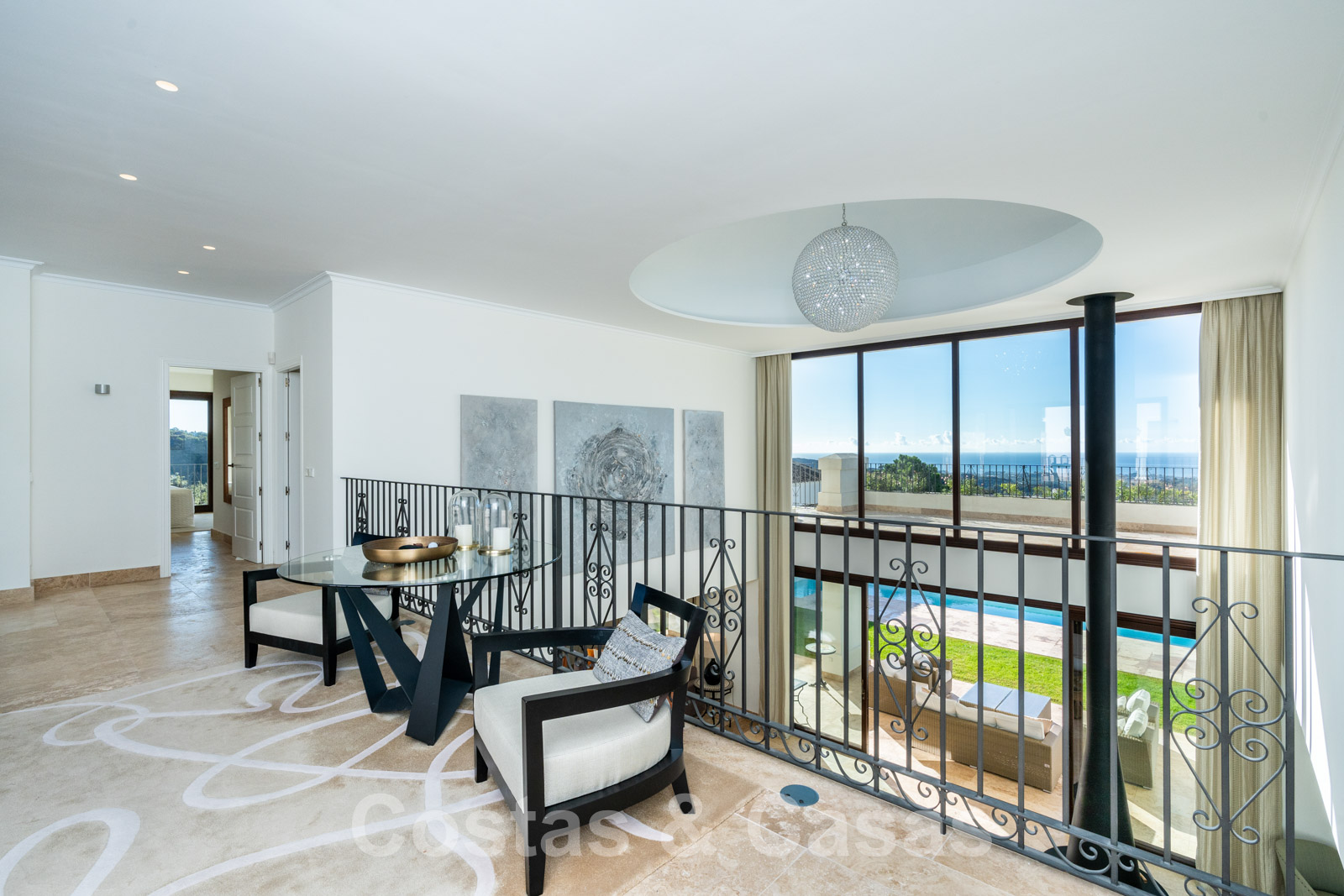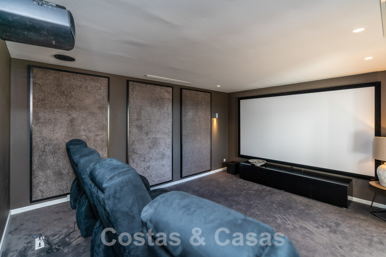 Espaciosa villa independiente de estilo arquitectónico clásico. Se caracteriza por un alto nivel de acabados. Gracias a la naturaleza descendente de la parcela, se entra en el hall de entrada de la villa en un nivel elevado e inmediatamente se mira hacia el imponente espacio de vida de doble altura con el Mediterráneo brillando en el fondo. En el nivel de entrada se encuentran 3 dormitorios en suite, incluida la suite principal, que cuenta con un gran vestidor. Los 3 dormitorios de este nivel elevado también disfrutan de una terraza privada. Una escalera desciende a la espaciosa sala de estar de la planta principal, equipada con una hermosa chimenea. Al lado hay una sala de TV/biblioteca. Amplia cocina totalmente equipada con una gran isla para sentarse y un rincón de desayuno. Lavadero. Comedor adyacente que posiblemente puede ser cerrado por puertas correderas. Impresionante cine. Suelos de mármol travertino. Garaje interior para 2 coches.