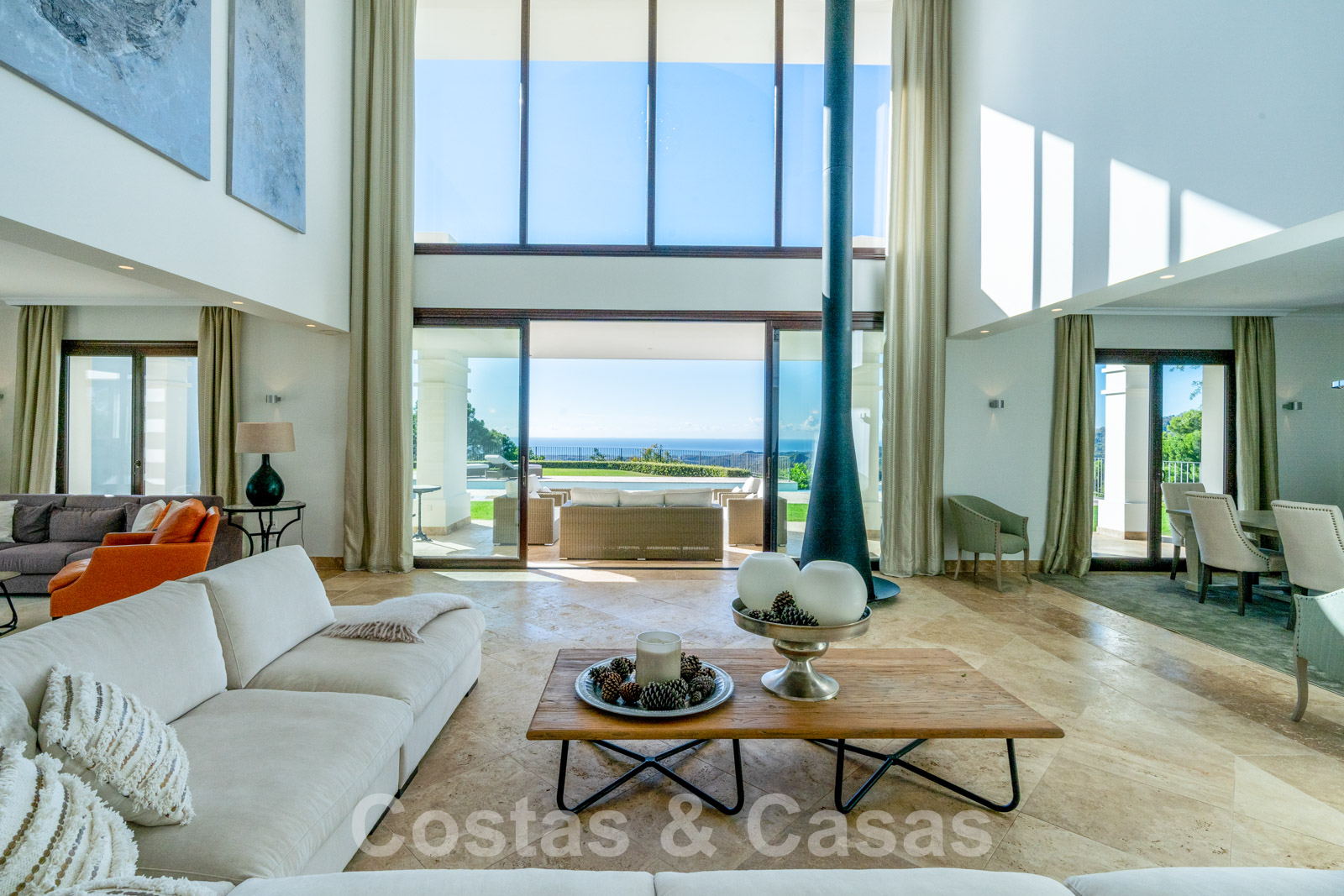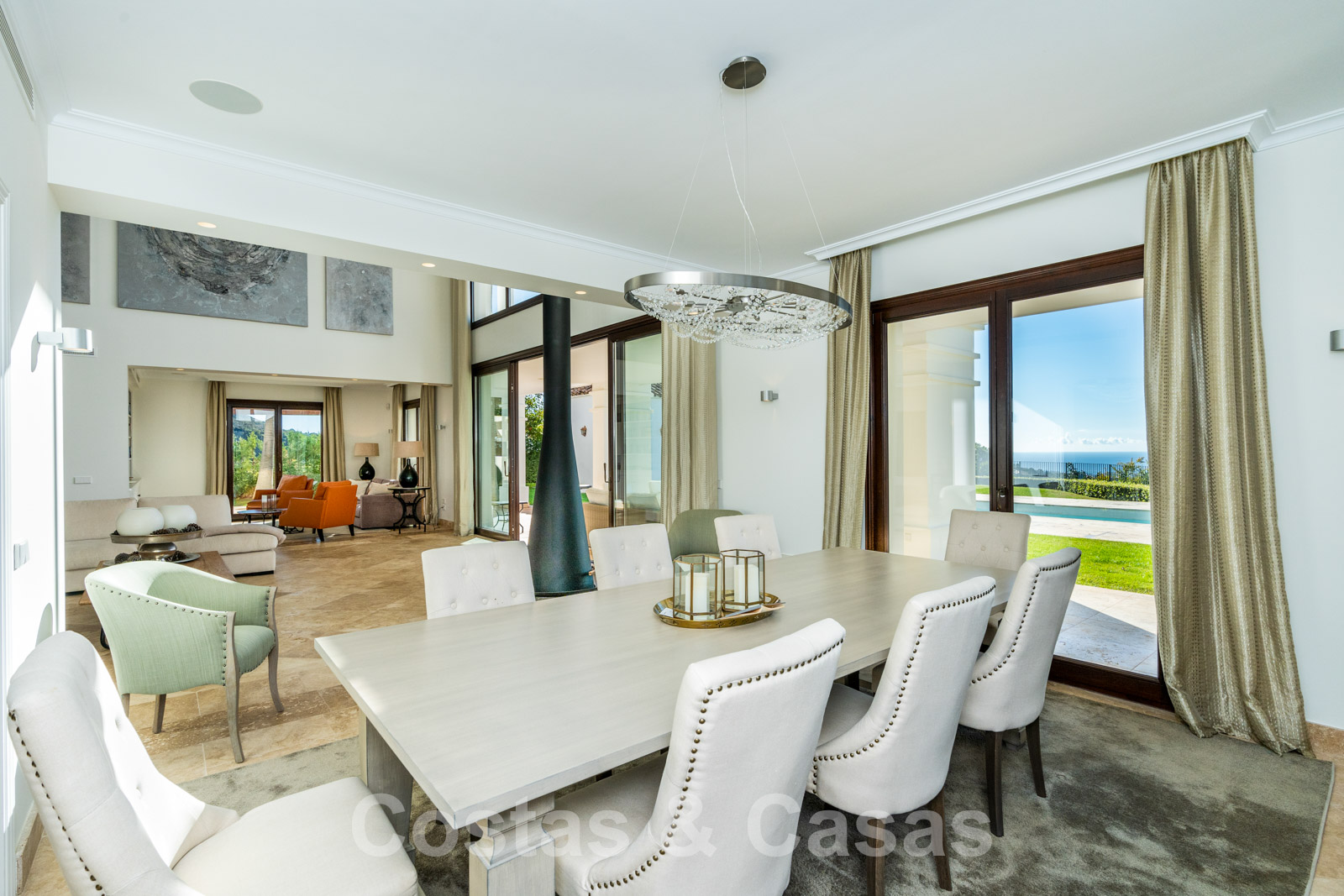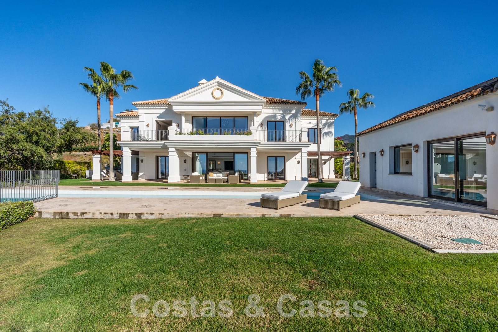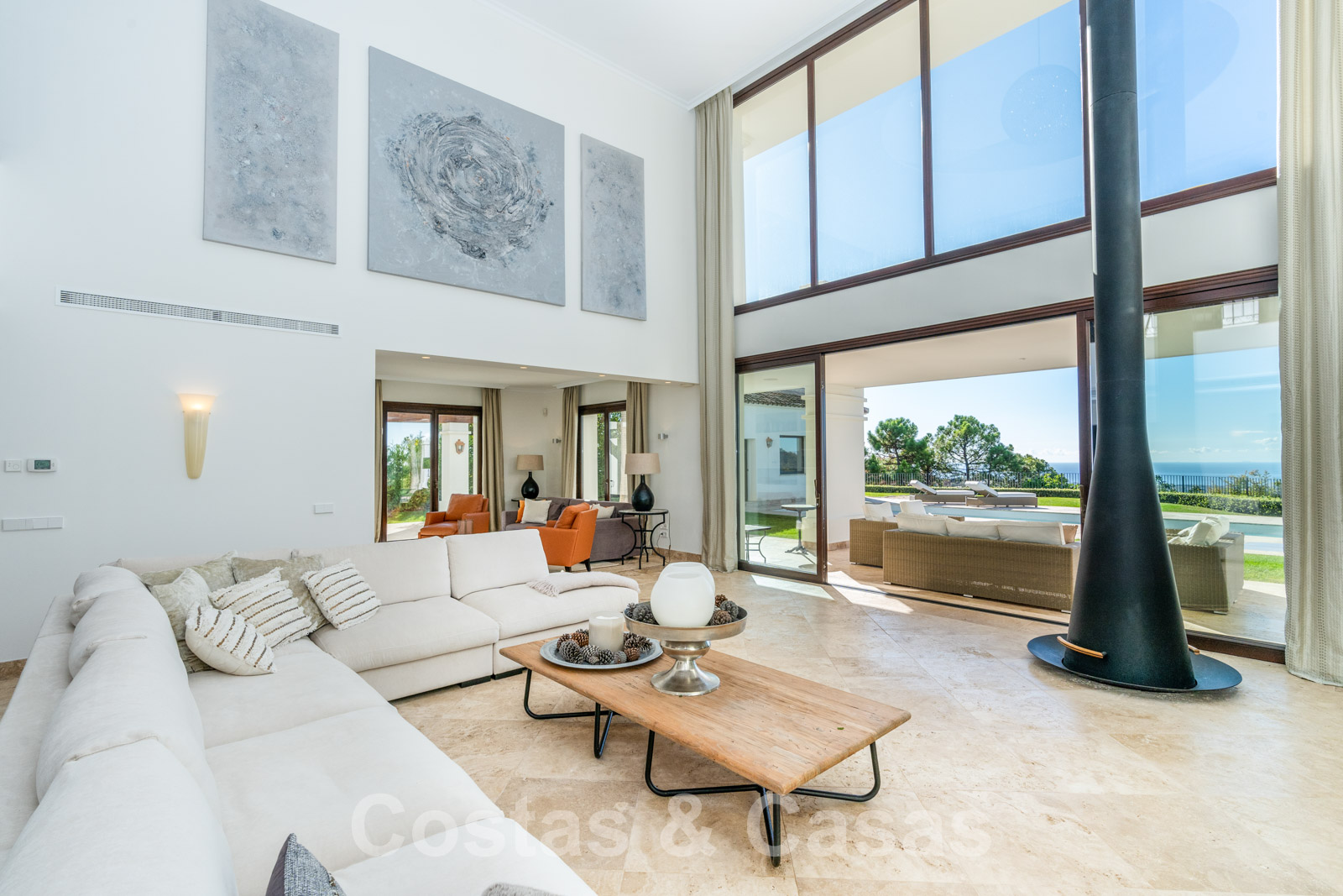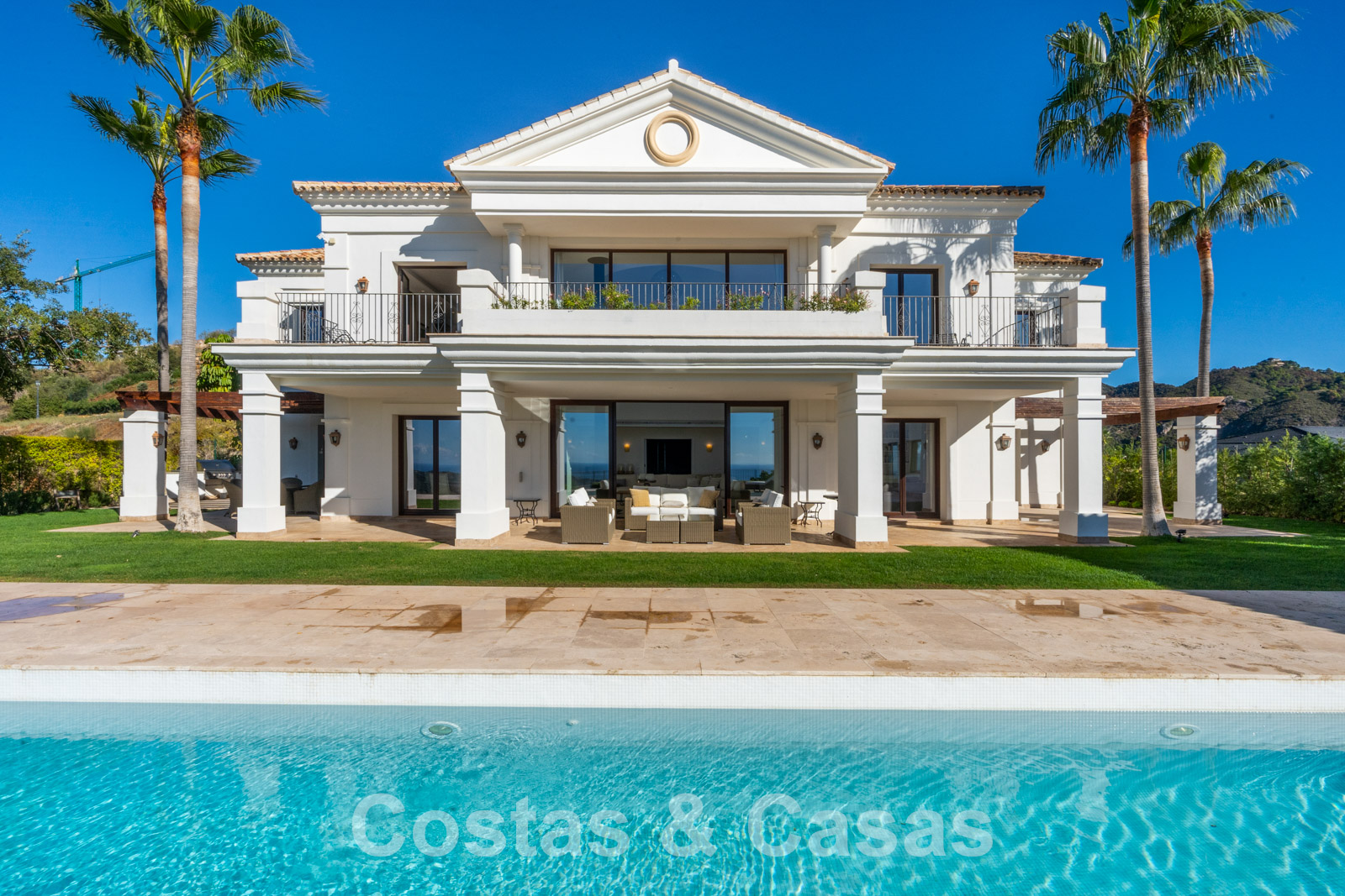 Espaciosa villa independiente de estilo arquitectónico clásico. Se caracteriza por un alto nivel de acabados. Gracias a la naturaleza descendente de la parcela, se entra en el hall de entrada de la villa en un nivel elevado e inmediatamente se mira hacia el imponente espacio de vida de doble altura con el Mediterráneo brillando en el fondo. En el nivel de entrada se encuentran 3 dormitorios en suite, incluida la suite principal, que cuenta con un gran vestidor. Los 3 dormitorios de este nivel elevado también disfrutan de una terraza privada. Una escalera desciende a la espaciosa sala de estar de la planta principal, equipada con una hermosa chimenea. Al lado hay una sala de TV/biblioteca. Amplia cocina totalmente equipada con una gran isla para sentarse y un rincón de desayuno. Lavadero. Comedor adyacente que posiblemente puede ser cerrado por puertas correderas. Impresionante cine. Suelos de mármol travertino. Garaje interior para 2 coches.