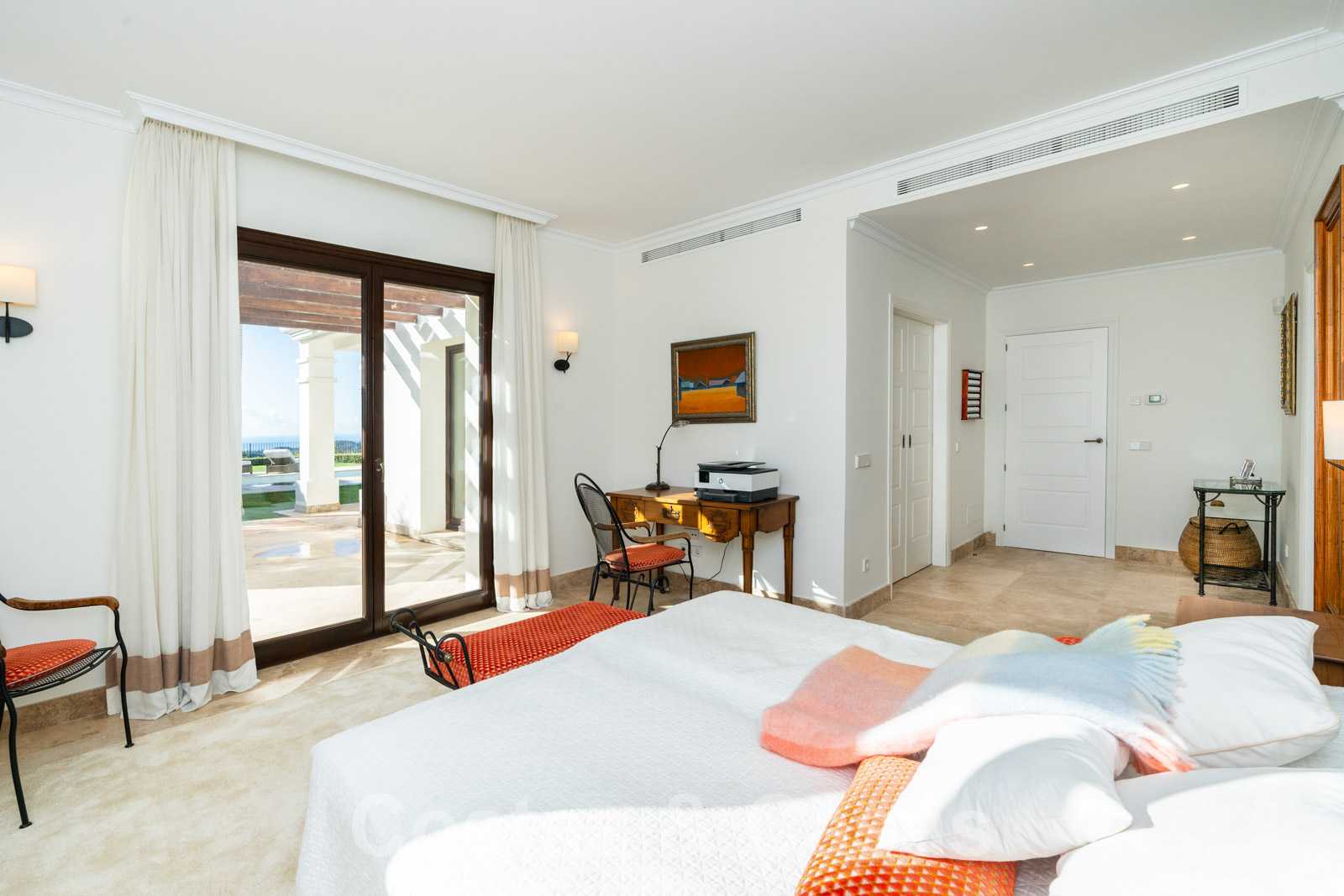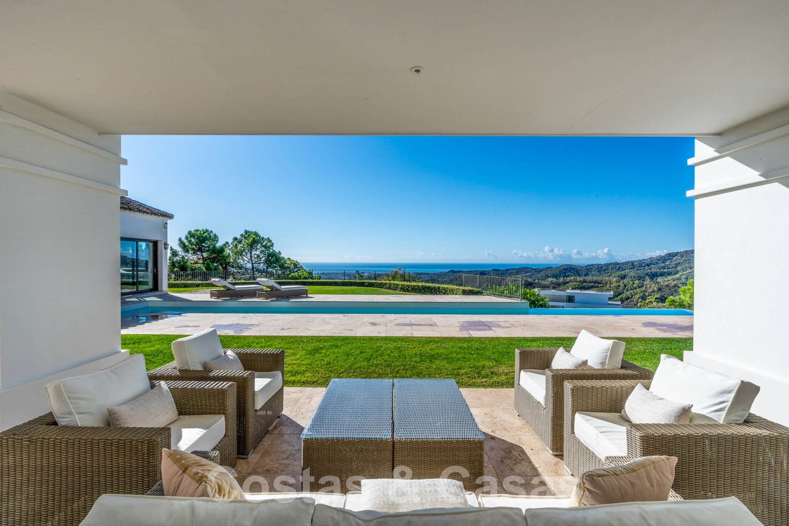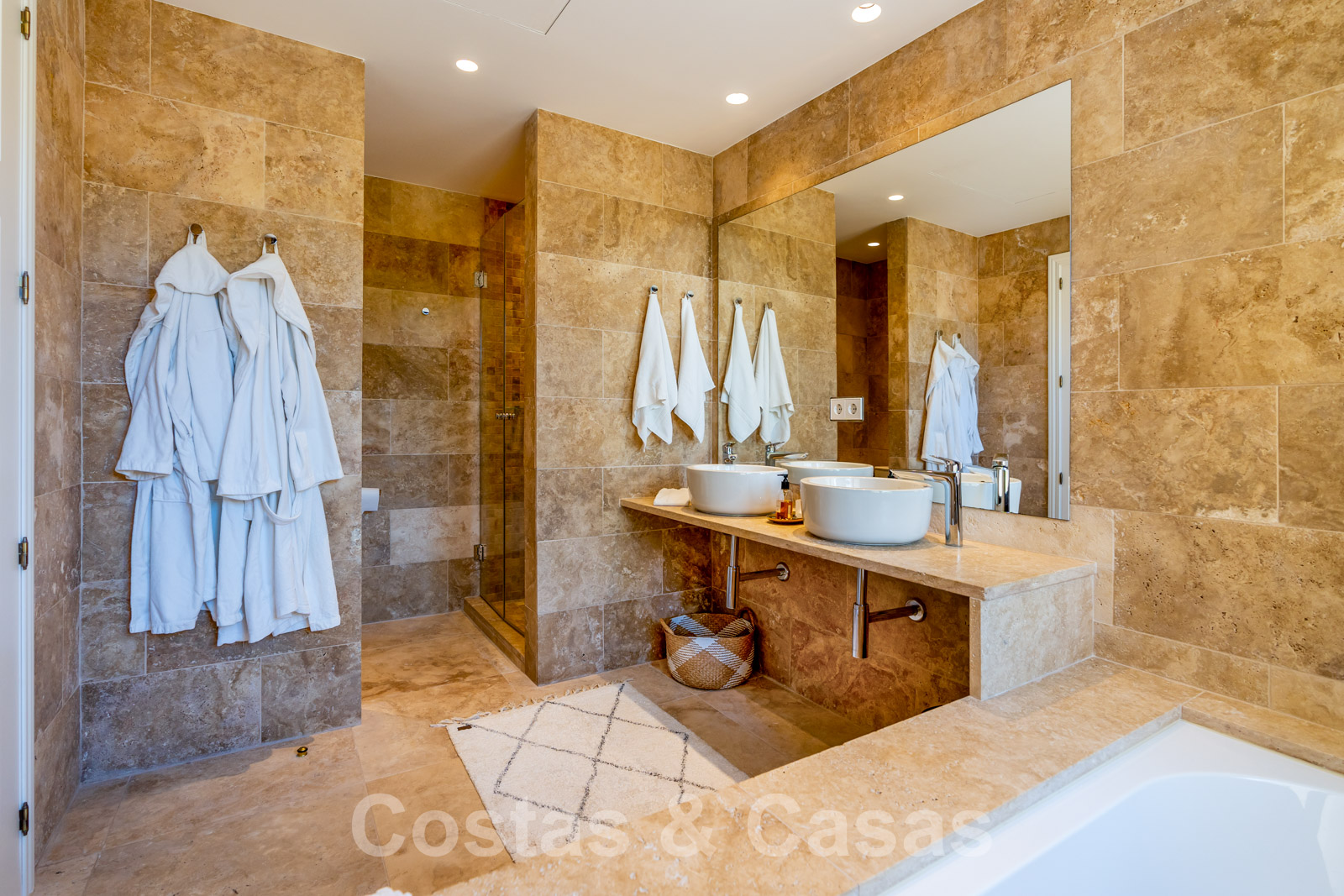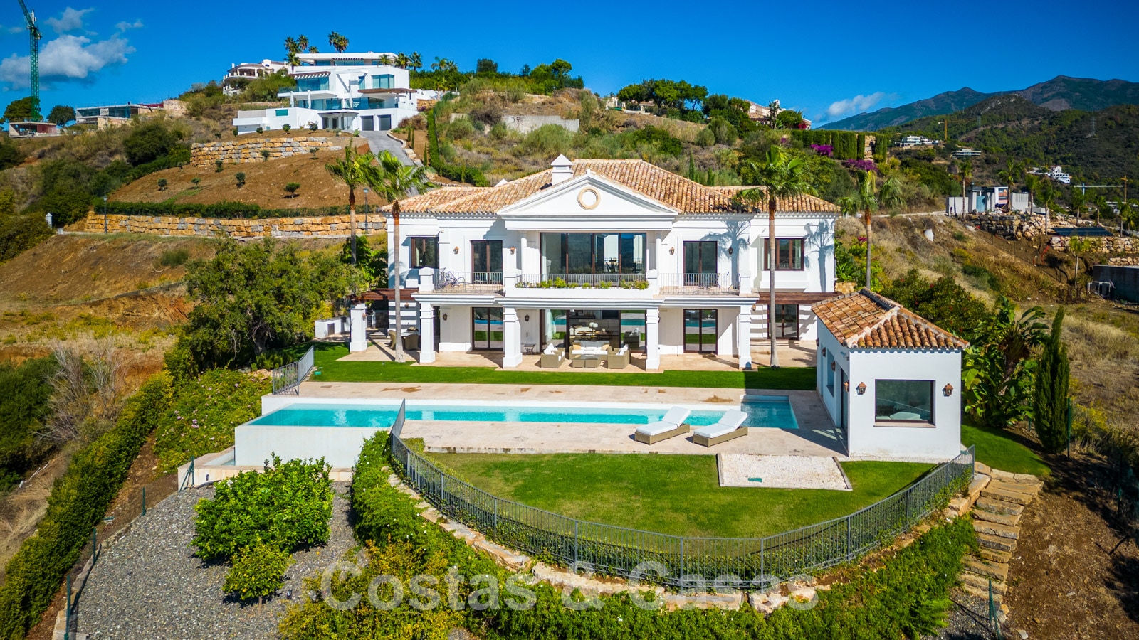 Espaciosa villa independiente de estilo arquitectónico clásico. Se caracteriza por un alto nivel de acabados. Gracias a la naturaleza descendente de la parcela, se entra en el hall de entrada de la villa en un nivel elevado e inmediatamente se mira hacia el imponente espacio de vida de doble altura con el Mediterráneo brillando en el fondo. En el nivel de entrada se encuentran 3 dormitorios en suite, incluida la suite principal, que cuenta con un gran vestidor. Los 3 dormitorios de este nivel elevado también disfrutan de una terraza privada. Una escalera desciende a la espaciosa sala de estar de la planta principal, equipada con una hermosa chimenea. Al lado hay una sala de TV/biblioteca. Amplia cocina totalmente equipada con una gran isla para sentarse y un rincón de desayuno. Lavadero. Comedor adyacente que posiblemente puede ser cerrado por puertas correderas. Impresionante cine. Suelos de mármol travertino. Garaje interior para 2 coches.