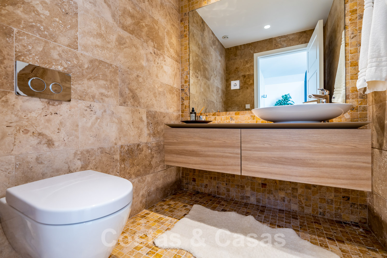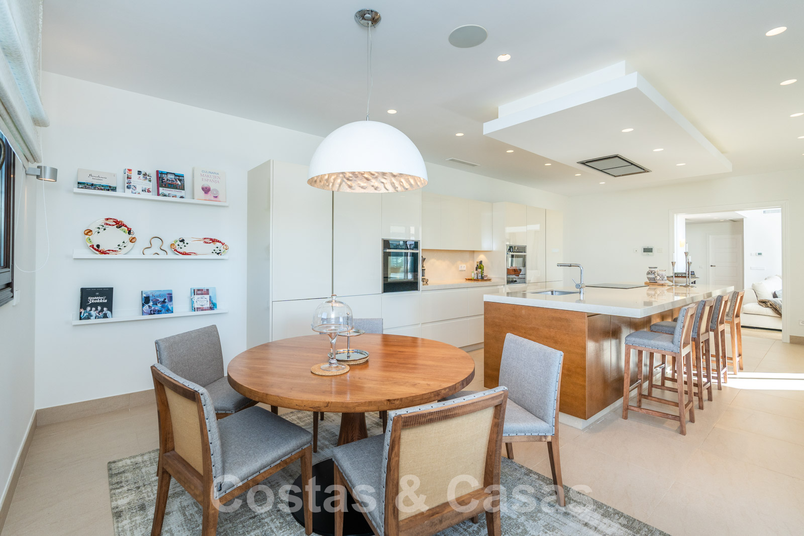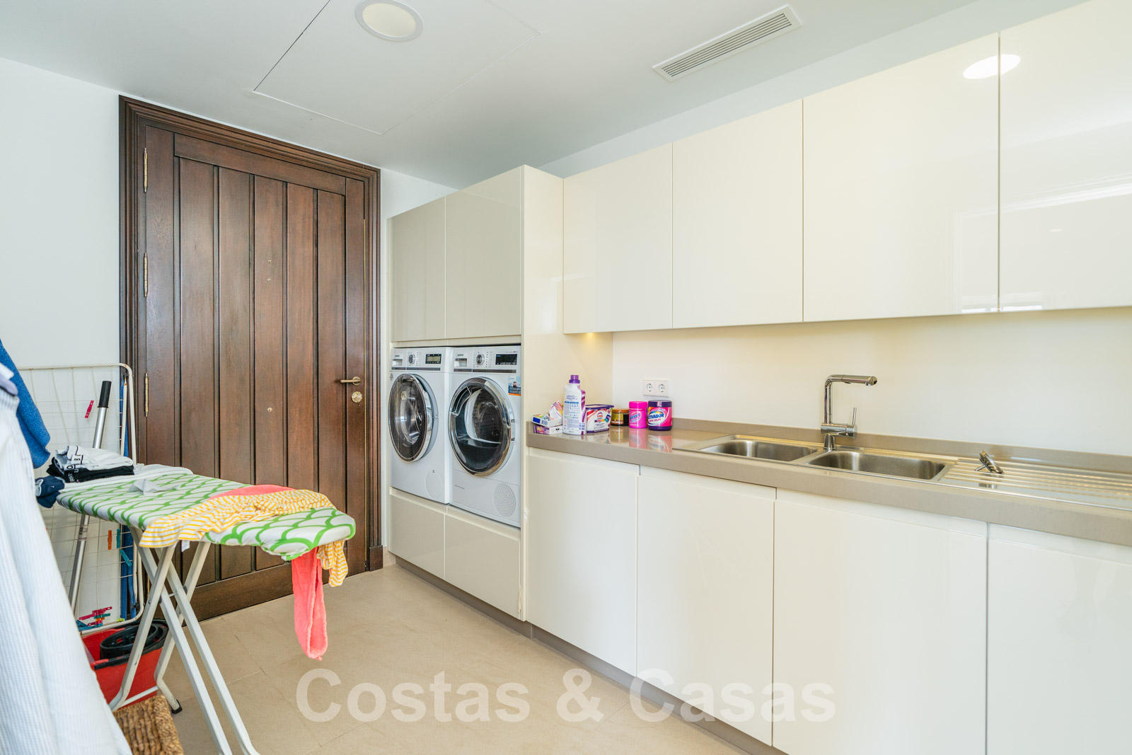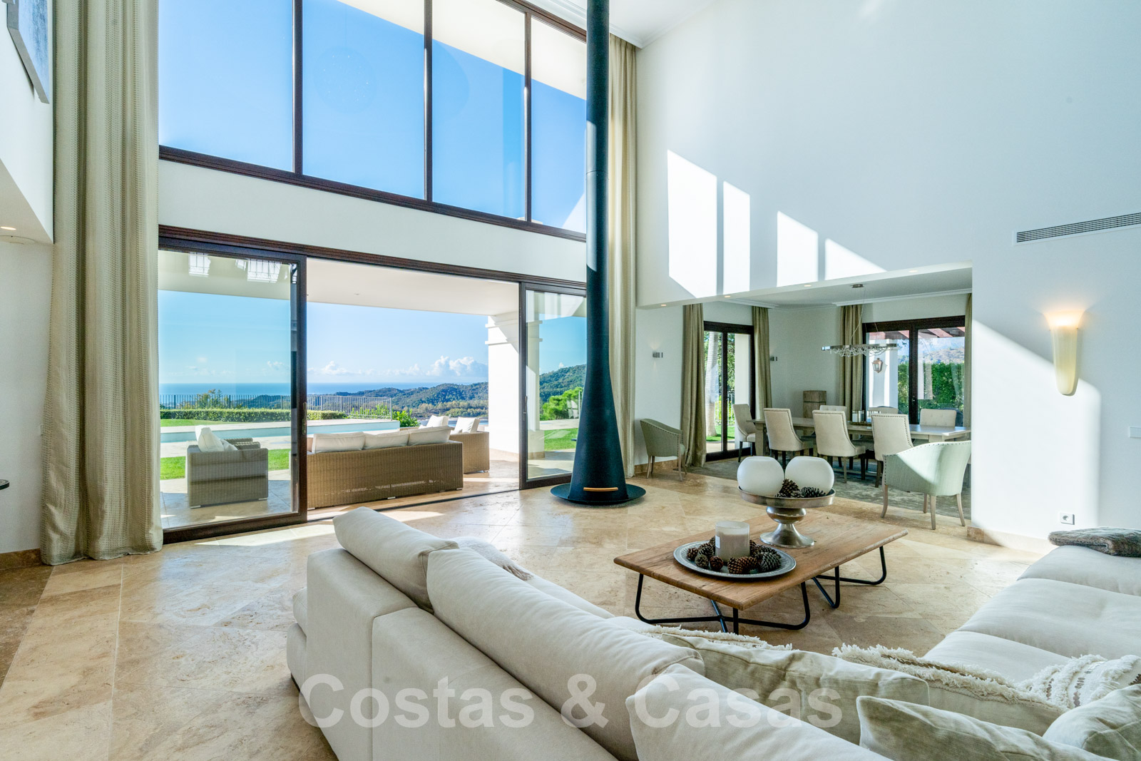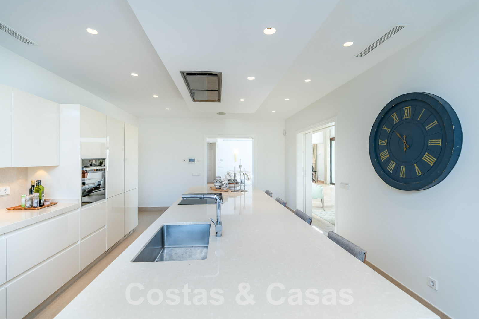 Espaciosa villa independiente de estilo arquitectónico clásico. Se caracteriza por un alto nivel de acabados. Gracias a la naturaleza descendente de la parcela, se entra en el hall de entrada de la villa en un nivel elevado e inmediatamente se mira hacia el imponente espacio de vida de doble altura con el Mediterráneo brillando en el fondo. En el nivel de entrada se encuentran 3 dormitorios en suite, incluida la suite principal, que cuenta con un gran vestidor. Los 3 dormitorios de este nivel elevado también disfrutan de una terraza privada. Una escalera desciende a la espaciosa sala de estar de la planta principal, equipada con una hermosa chimenea. Al lado hay una sala de TV/biblioteca. Amplia cocina totalmente equipada con una gran isla para sentarse y un rincón de desayuno. Lavadero. Comedor adyacente que posiblemente puede ser cerrado por puertas correderas. Impresionante cine. Suelos de mármol travertino. Garaje interior para 2 coches.