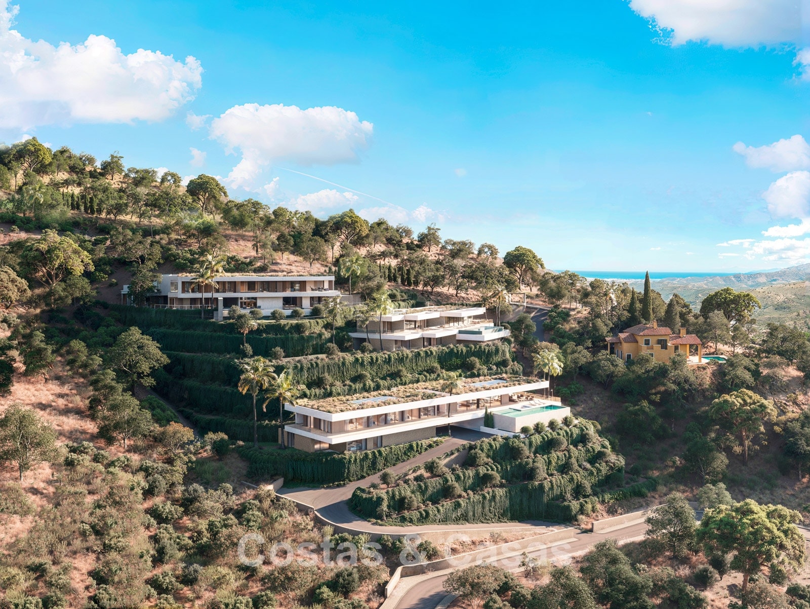 Vistas panorámicas fenomenales sobre el exuberante valle hacia el mar Mediterráneo.