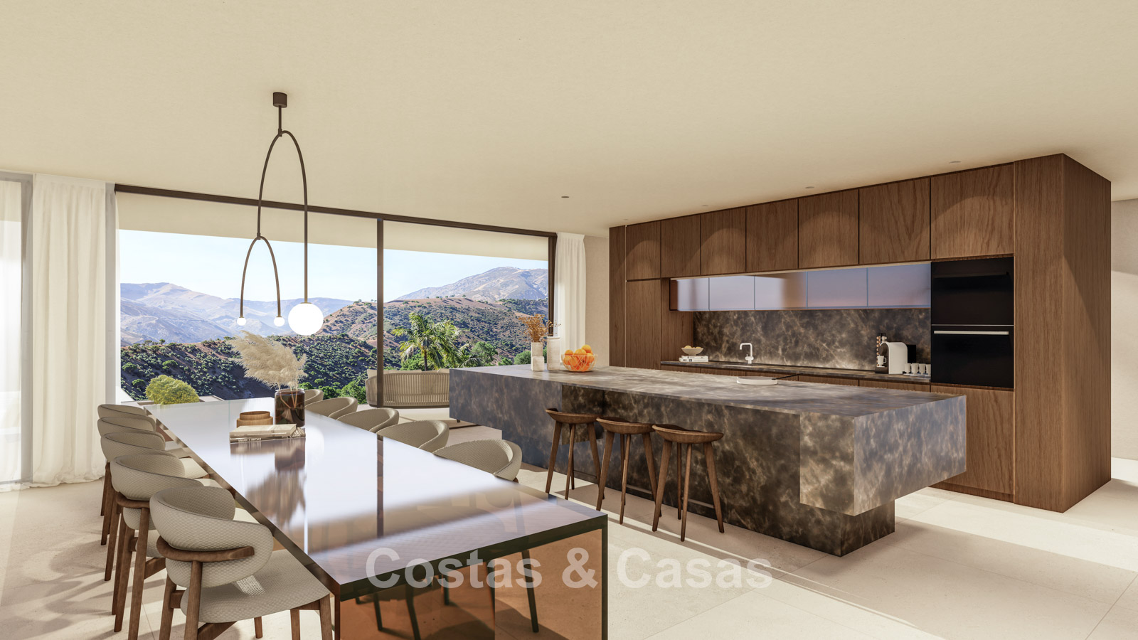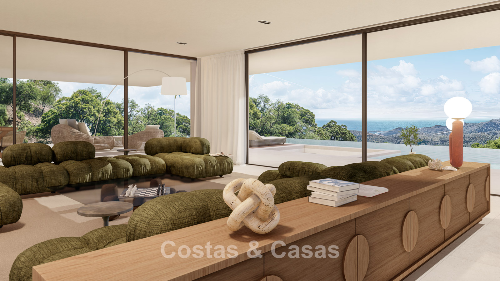 Las ventanas de suelo a techo llenan los interiores abiertos con luz natural y ofrecen vistas panorámicas del mar y el paisaje montañoso.