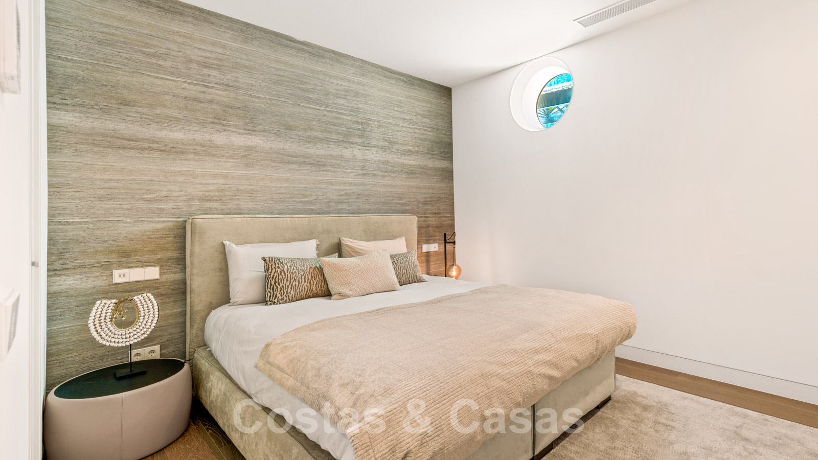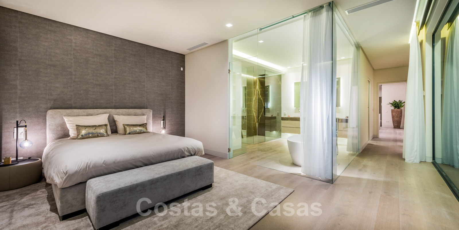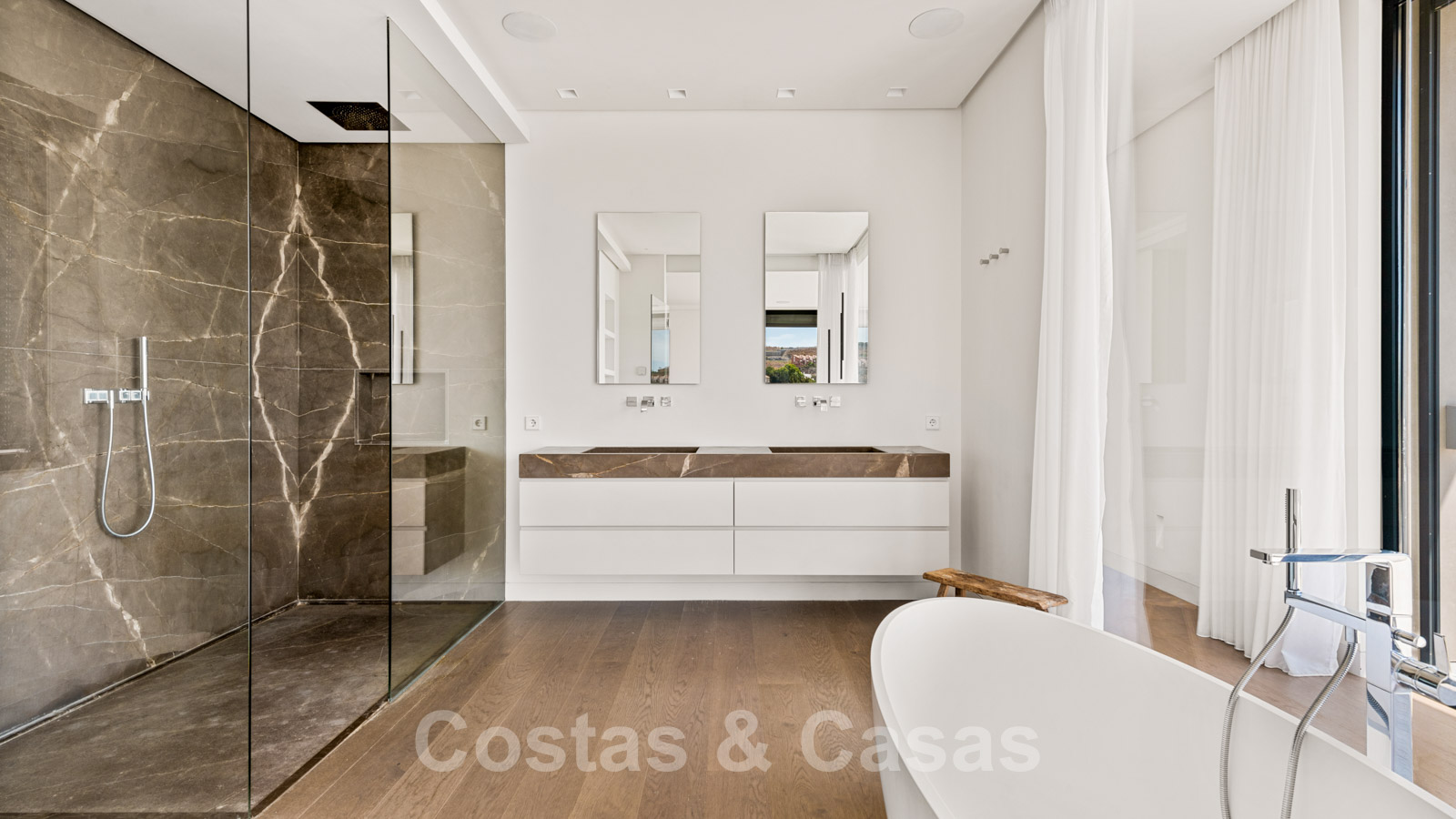 El dormitorio principal en suite con bañera independiente, tiene ventanas de suelo a techo que crean un espacio muy luminoso y dan acceso a la terraza privada.