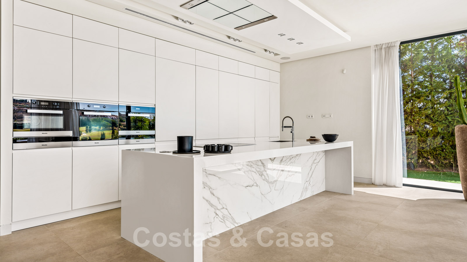 Cocina de diseño abierto con isla de mármol hecha a medida y completamente equipada con aparatos Miele.