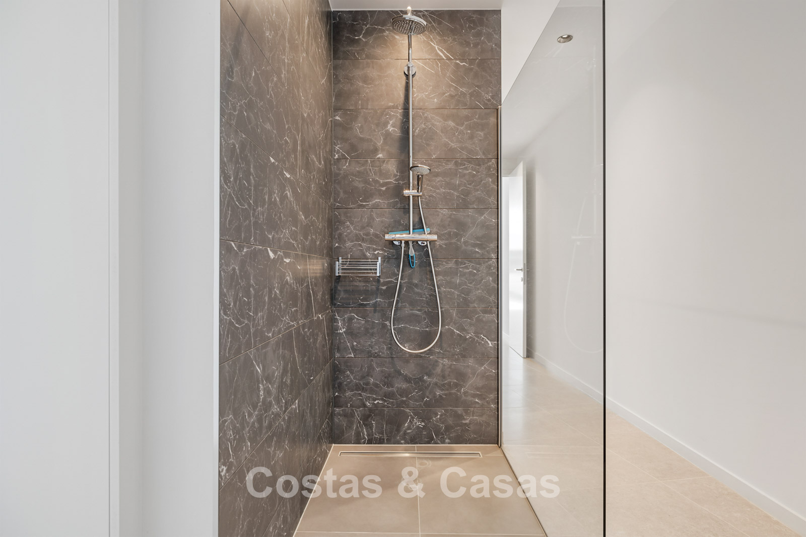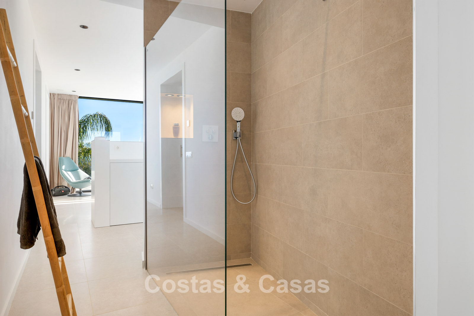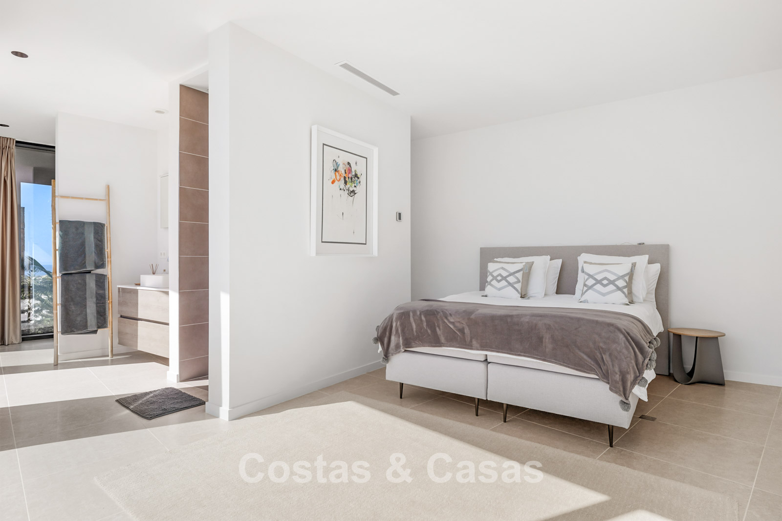 Villa independiente de nueva construcción de estilo arquitectónico modernista. Utilizando materiales de calidad y un ojo para el acabado sublime. Situada al sureste. Las ventanas corredizas de suelo a techo permiten la entrada de abundante luz natural, creando una casa amplia y luminosa. Sala de estar de planta abierta con sala de TV junto a la chimenea. La cocina y el comedor están diseñados con un diseño elegante y contemporáneo con mucha luz natural gracias a los grandes ventanales. La cocina estará equipada con electrodomésticos Miele y Bora de alta calidad y una isla central con barra de desayuno. Al lado hay un lavadero/trastero. Varias habitaciones tienen techo de doble altura, lo que proporciona ventilación adicional y una sensación de amplitud. 5 dormitorios cada uno con su propio baño y un aseo independiente. La suite principal de la planta superior ofrece un vestidor y una habitación contigua versátil, ideal para usar como oficina, sala de fitness o dormitorio adicional. Las baldosas de cerámica proporcionan una base neutra y lujosa. Lavandería equipada. Trastero. Garaje interior para un coche.