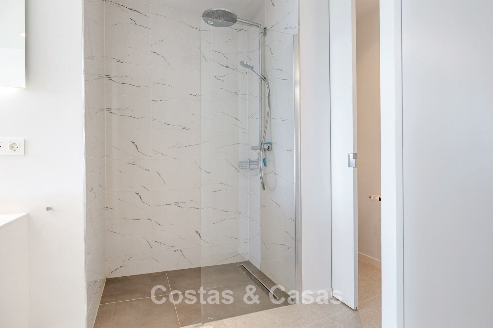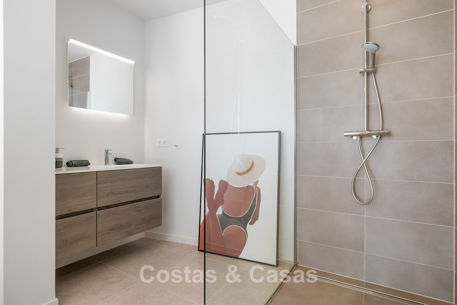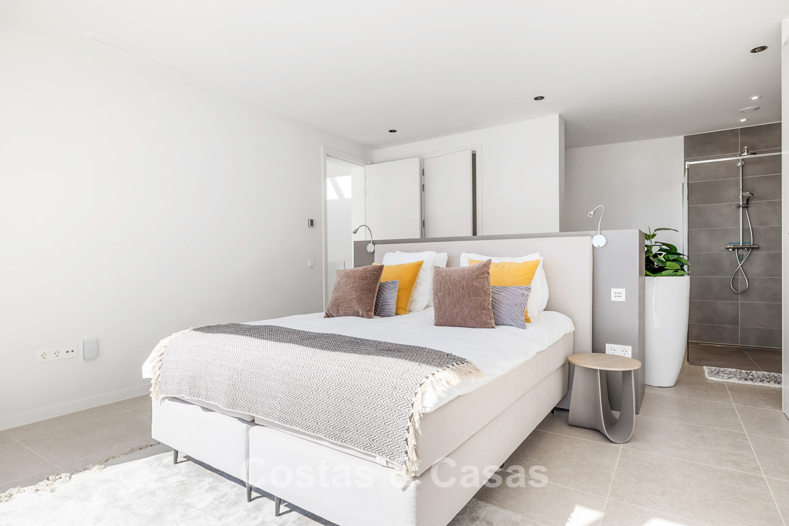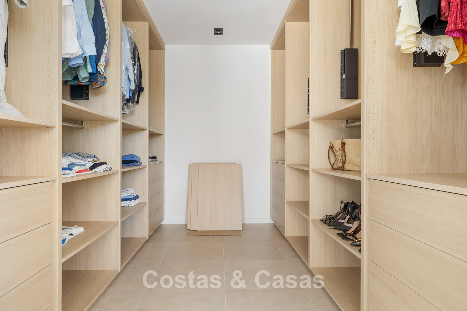 Villa independiente de nueva construcción de estilo arquitectónico modernista. Utilizando materiales de calidad y un ojo para el acabado sublime. Situada al sureste. Las ventanas corredizas de suelo a techo permiten la entrada de abundante luz natural, creando una casa amplia y luminosa. Sala de estar de planta abierta con sala de TV junto a la chimenea. La cocina y el comedor están diseñados con un diseño elegante y contemporáneo con mucha luz natural gracias a los grandes ventanales. La cocina estará equipada con electrodomésticos Miele y Bora de alta calidad y una isla central con barra de desayuno. Al lado hay un lavadero/trastero. Varias habitaciones tienen techo de doble altura, lo que proporciona ventilación adicional y una sensación de amplitud. 5 dormitorios cada uno con su propio baño y un aseo independiente. La suite principal de la planta superior ofrece un vestidor y una habitación contigua versátil, ideal para usar como oficina, sala de fitness o dormitorio adicional. Las baldosas de cerámica proporcionan una base neutra y lujosa. Lavandería equipada. Trastero. Garaje interior para un coche.