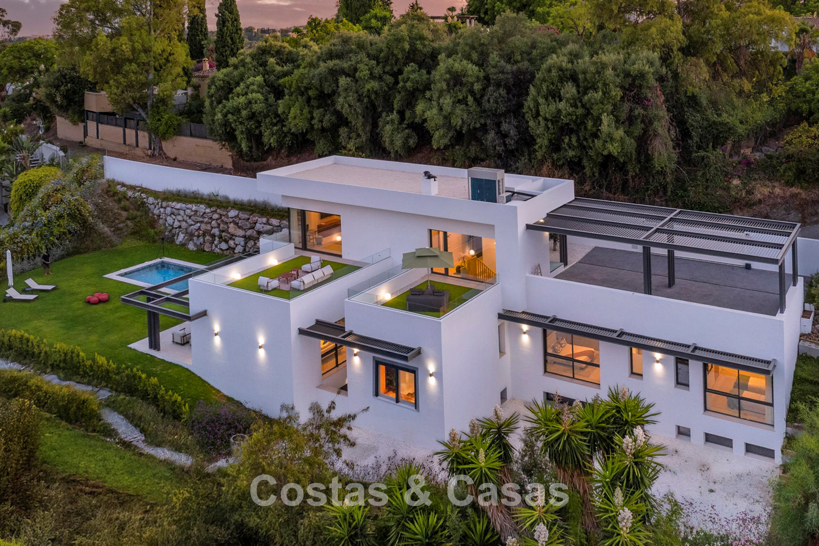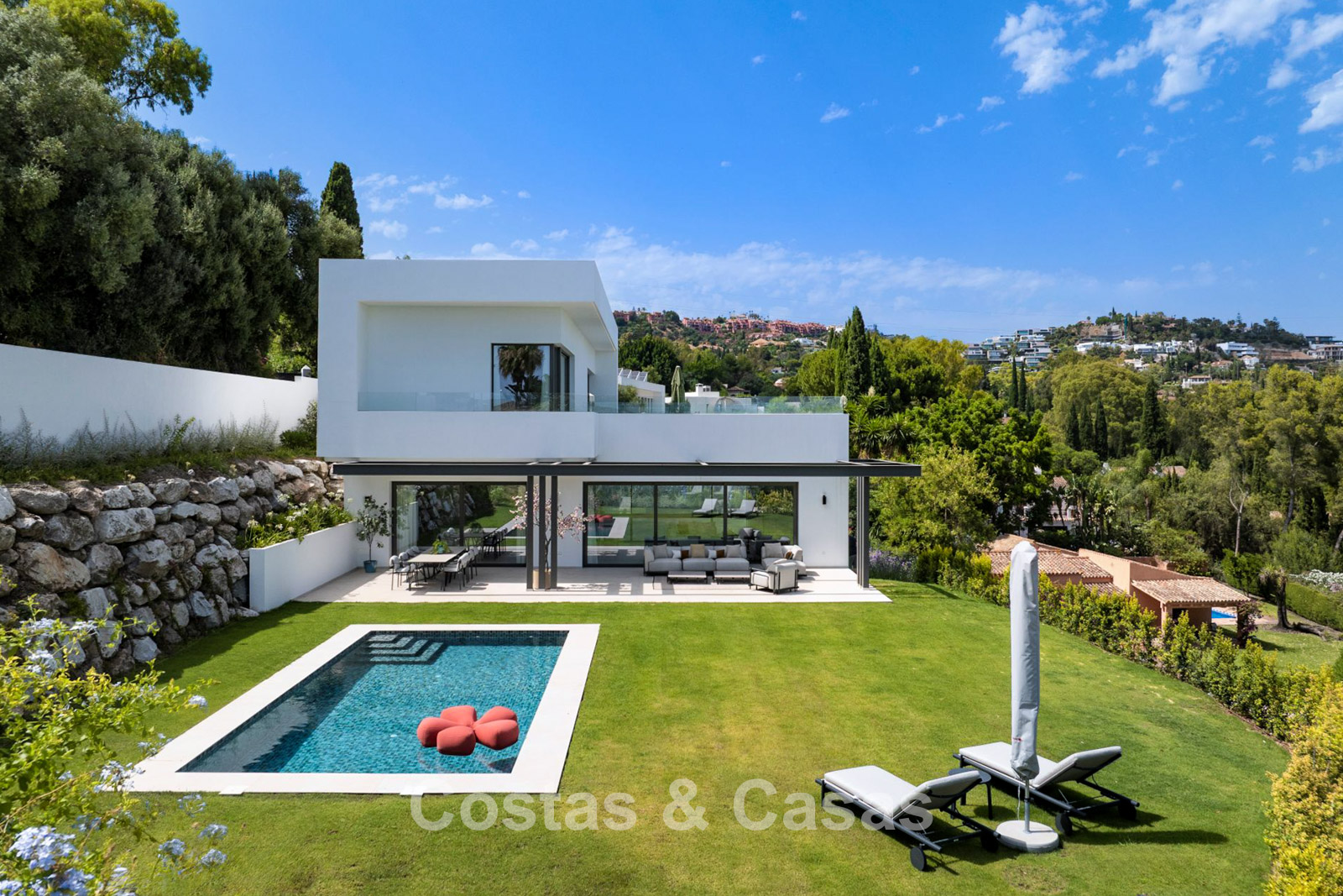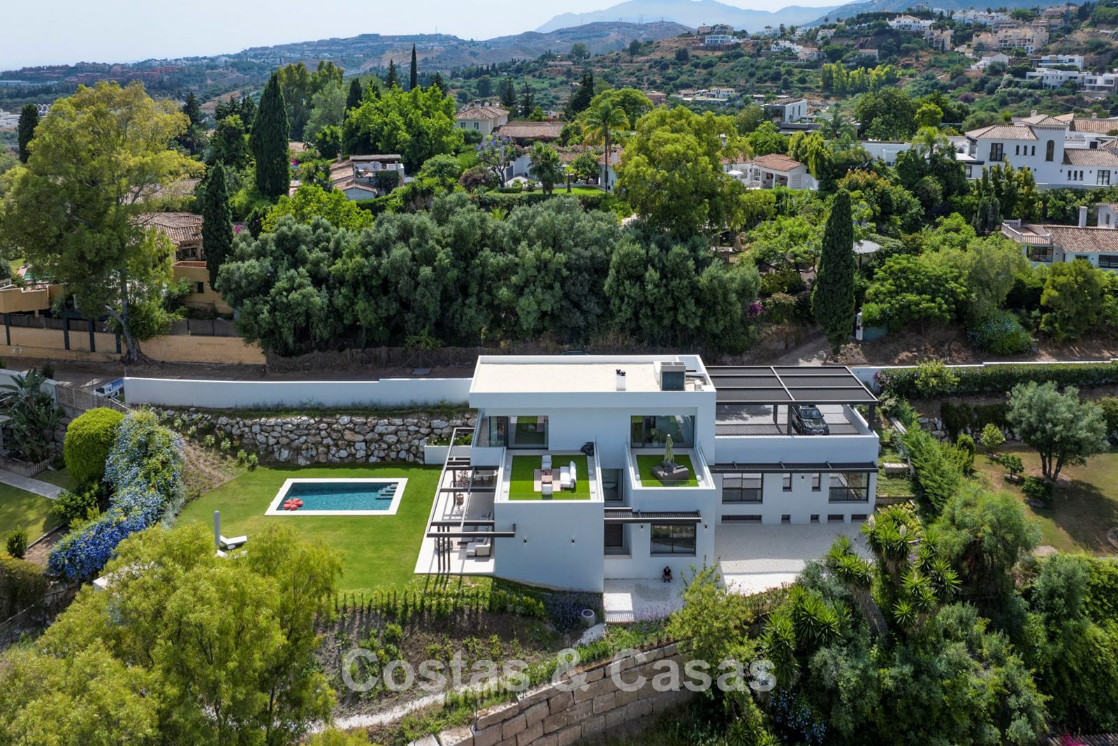 Una espaciosa parcela de casi 2.000 m², situada en una posición elevada. Precioso exterior ajardinado con un frondoso jardín y piscina infinita privada. Varias terrazas soleadas ofrecen la oportunidad de disfrutar del agradable clima mediterráneo. Orientación sur. Vistas panorámicas de los alrededores.