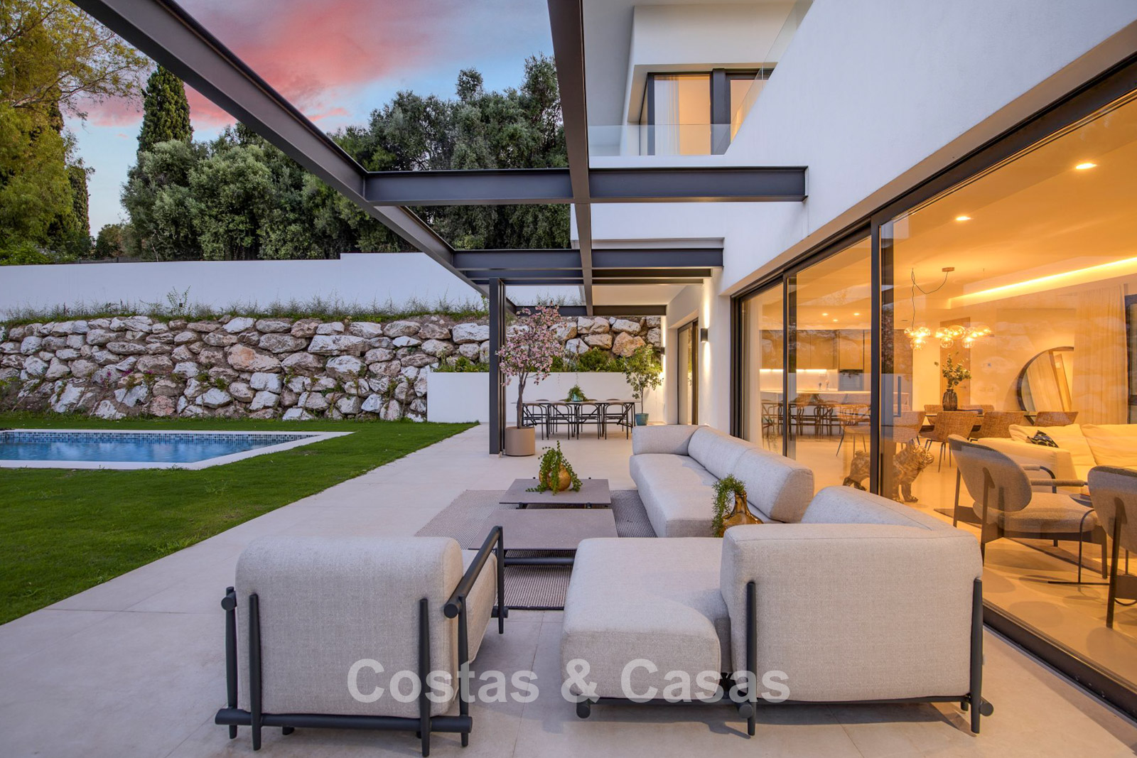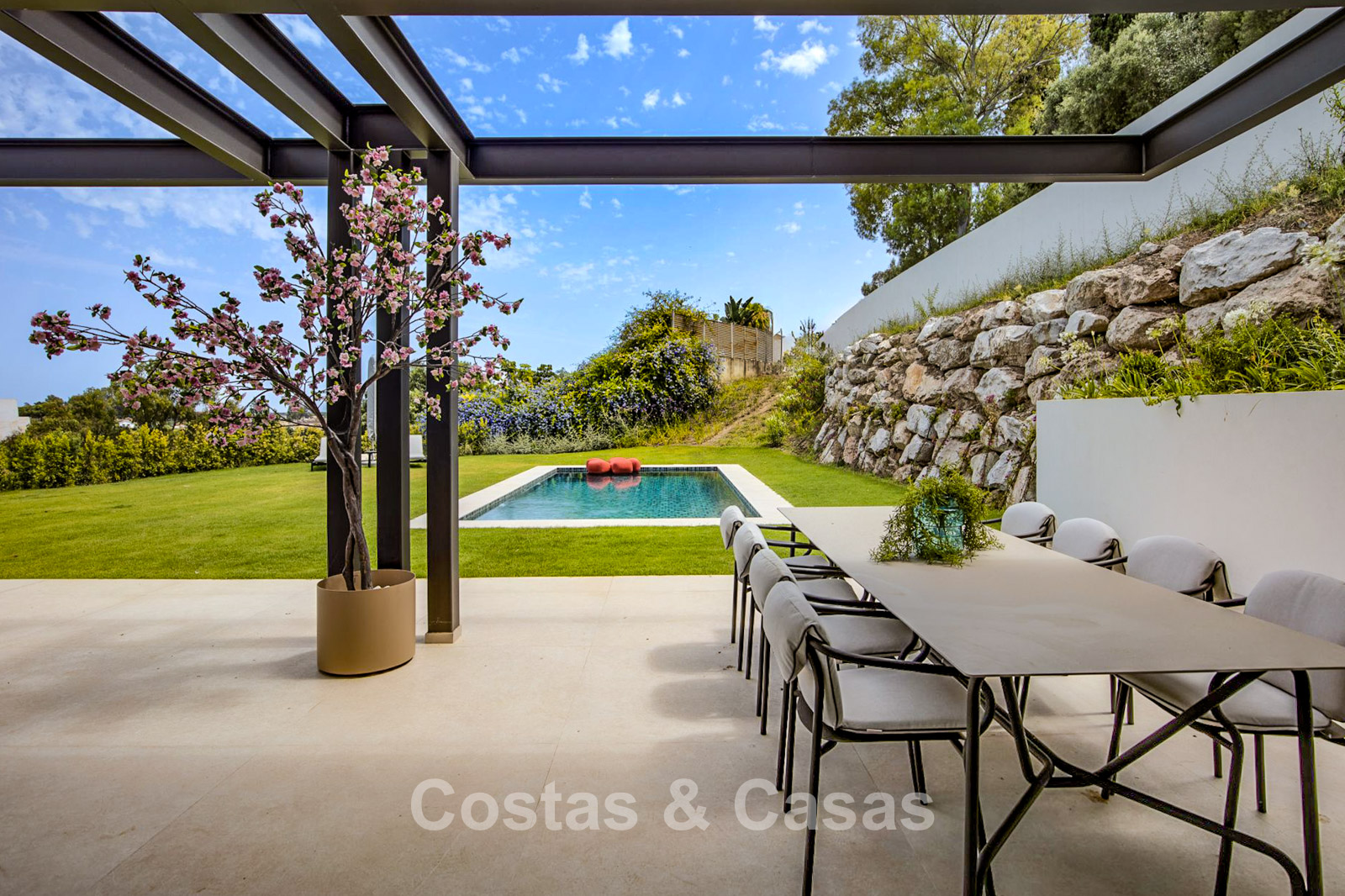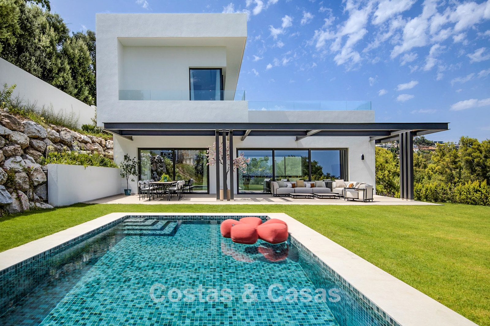 Una espaciosa parcela de casi 2.000 m², situada en una posición elevada. Precioso exterior ajardinado con un frondoso jardín y piscina infinita privada. Varias terrazas soleadas ofrecen la oportunidad de disfrutar del agradable clima mediterráneo. Orientación sur. Vistas panorámicas de los alrededores.