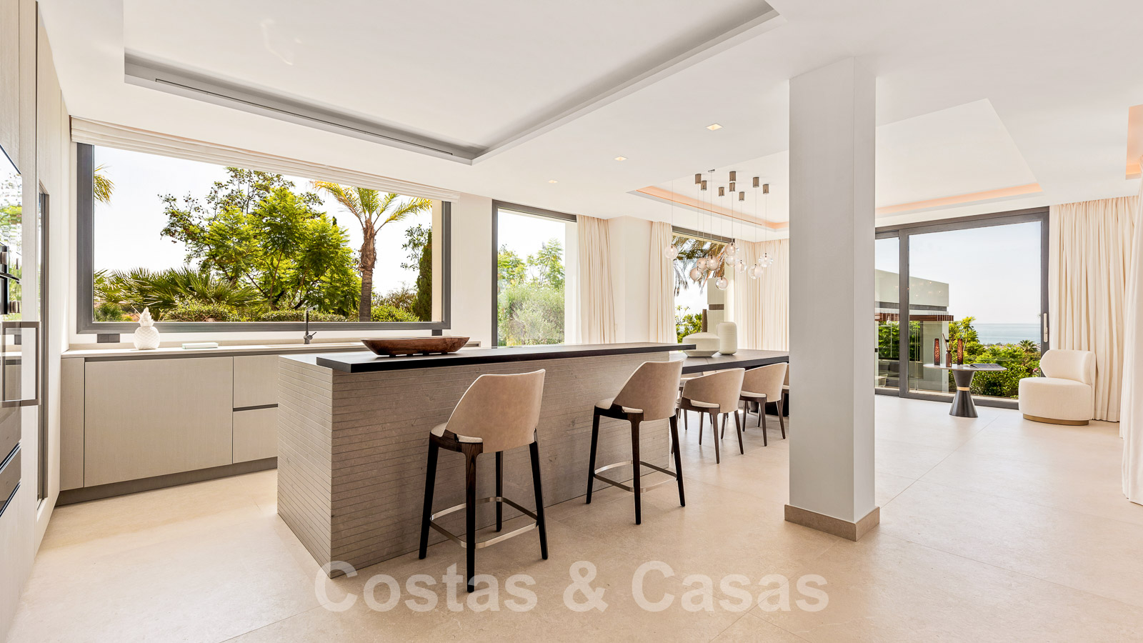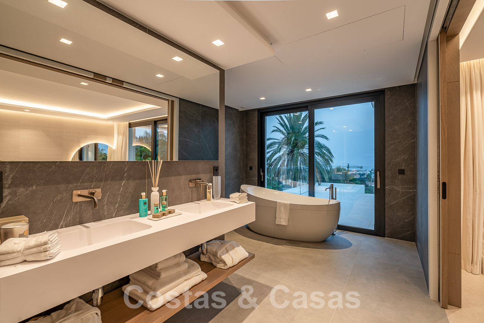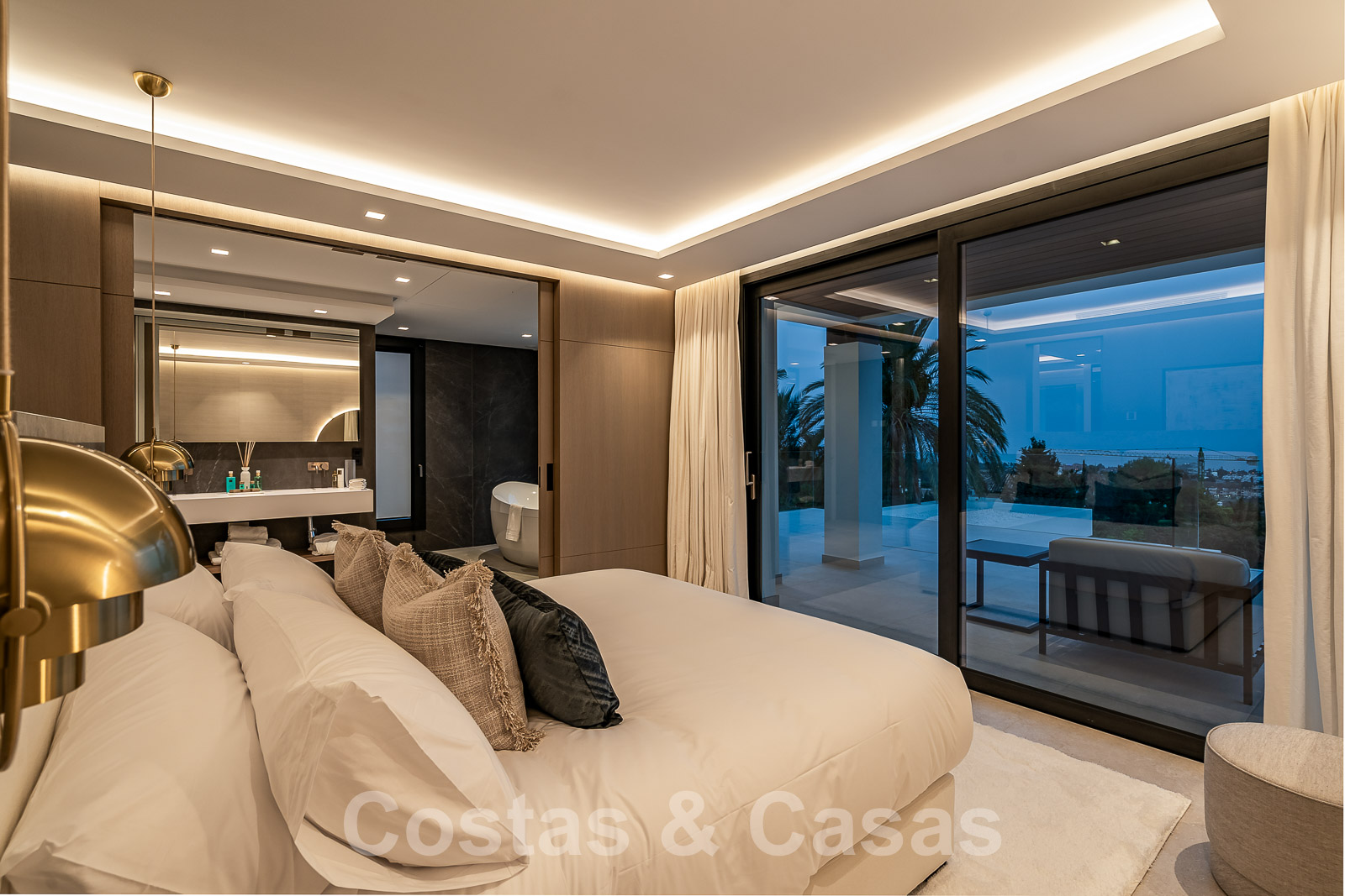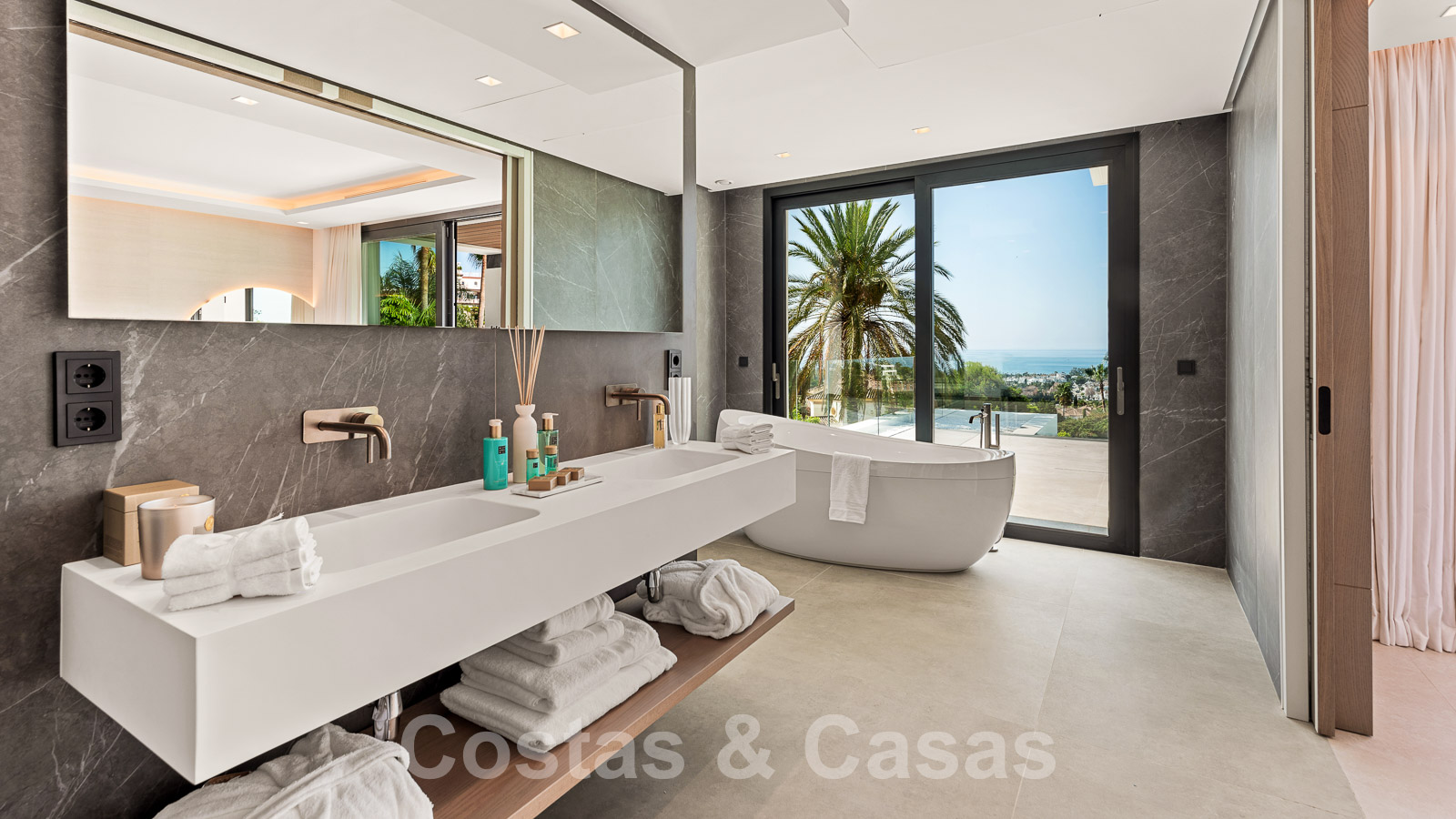 Lista para entrar a vivir, imponente villa nueva. Construida con materiales de alta calidad y acabados sofisticados. Diseño elegante y contemporáneo con un toque cálido. Amplio salón con sala de TV y comedor. Cocina abierta con isla, barra de desayuno y comedor. Un total de 4 dormitorios, 4 baños. La suite principal dispone de un espacioso vestidor con isla y también goza de una amplia terraza privada desde donde se disfruta de unas vistas espectaculares. Suelos de calidad en color crema. Ventanas correderas de suelo a techo en toda la villa que proporcionan estancias luminosas y ofrecen acceso a espacios exteriores. Instalaciones de spa en la planta inferior. Lavadero. Garaje interior para 3 coches.