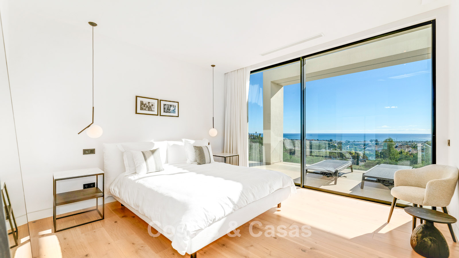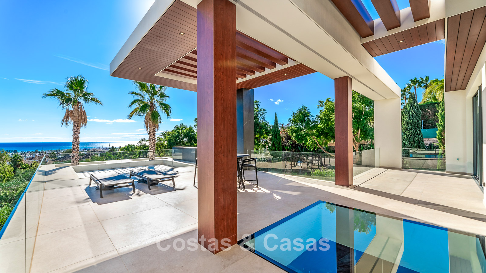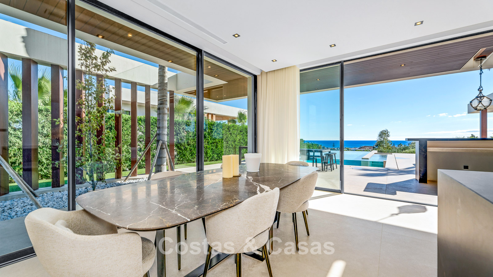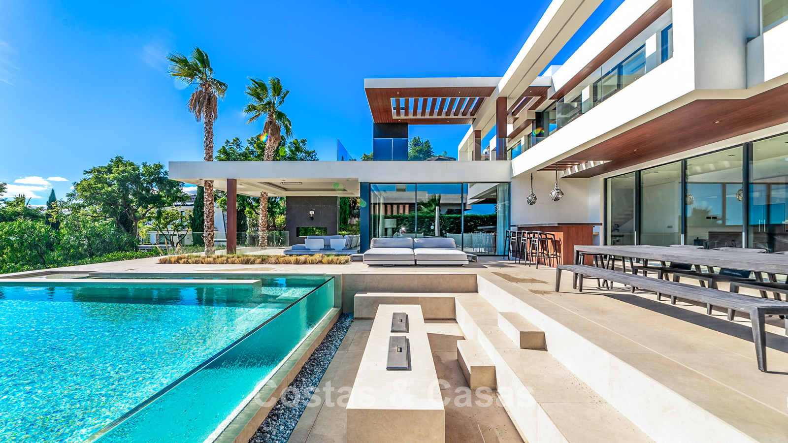 Aparcamiento para 2 coches. Fuente. Patio abierto con palmera. Majestuoso recibidor de doble altura con ascensor y escaleras. Un patio de cristal conecta todos los niveles de vida. Aseo de invitados. Dormitorio, en suite con acceso a la terraza cubierta. Bonita y espaciosa cocina abierta con una isla de cocción y una mesa. En el aterrizaje a la zona de estar, hay un armario empotrado y una hermosa pared de vinos. Amplio salón con chimenea. Terraza cubierta con cocina/bar exterior y zona de comedor. 2ª terraza cubierta con gran salón, chimenea y TV. Terraza abierta con tumbonas. Piscina infinita con lounge adyacente hundido y una chimenea central.