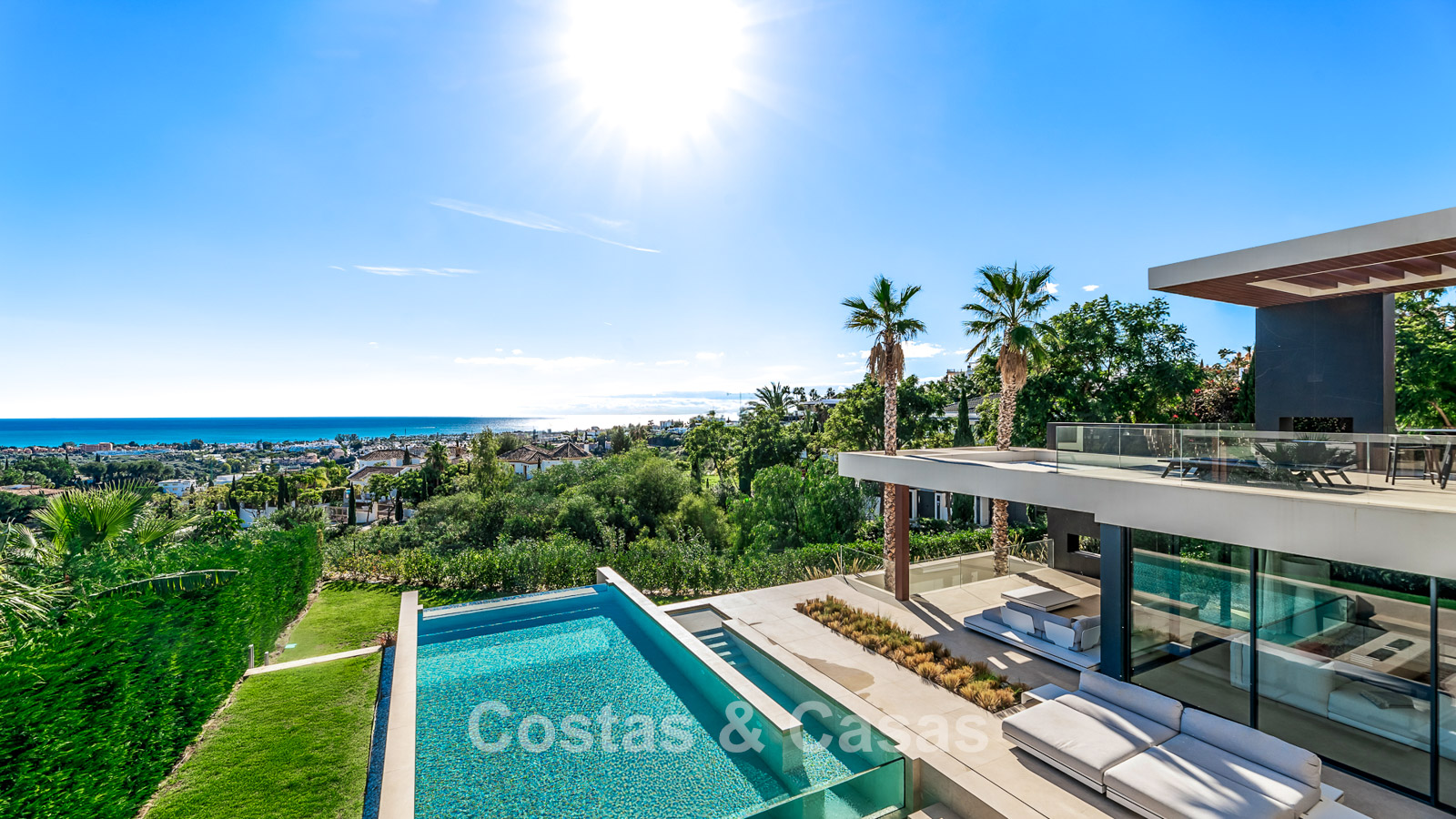Elegante villa de diseño en venta con vistas panorámicas al golf y al mar en un resort de golf de cinco estrellas en Marbella - Benahavís