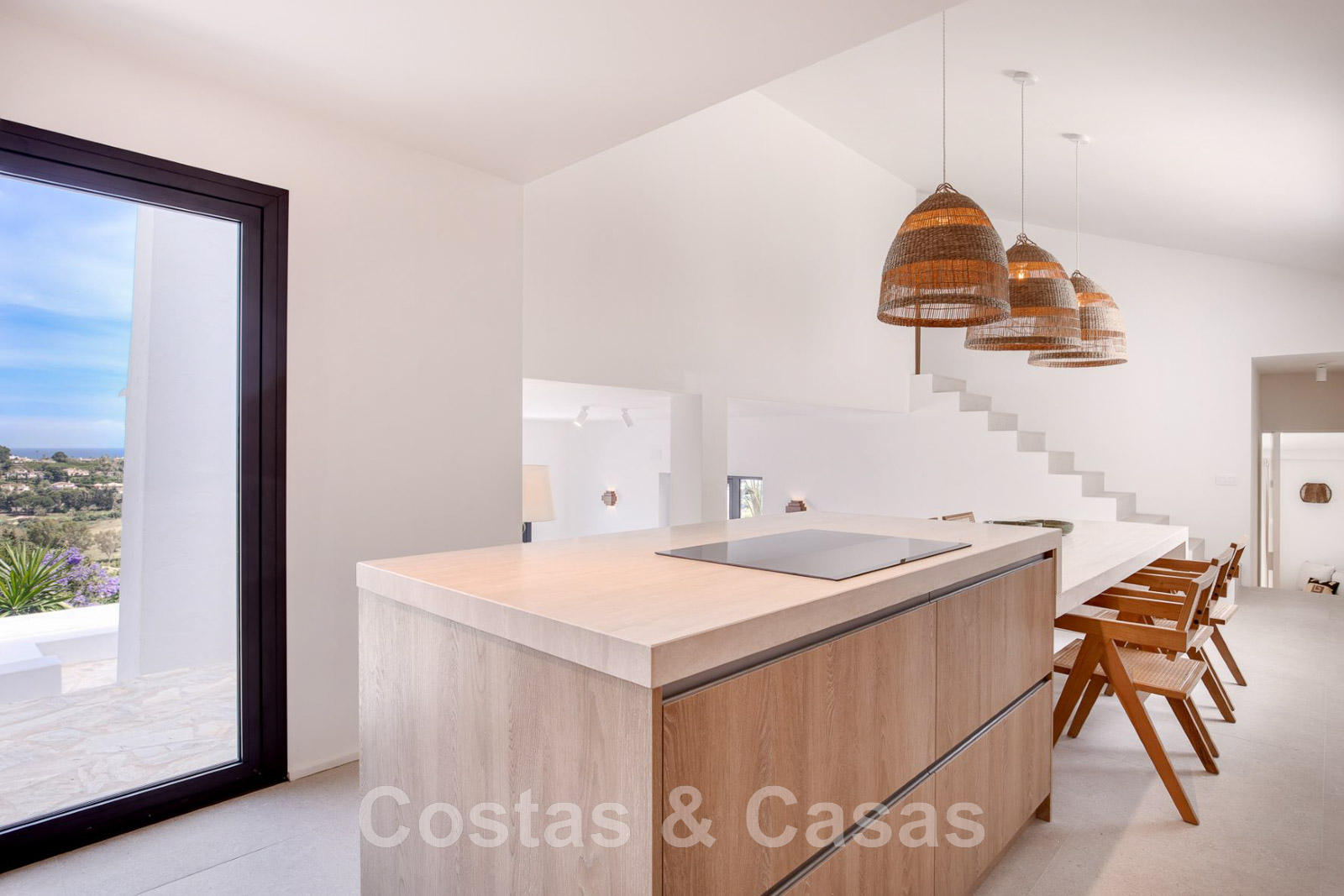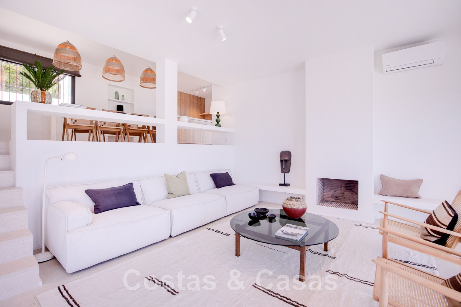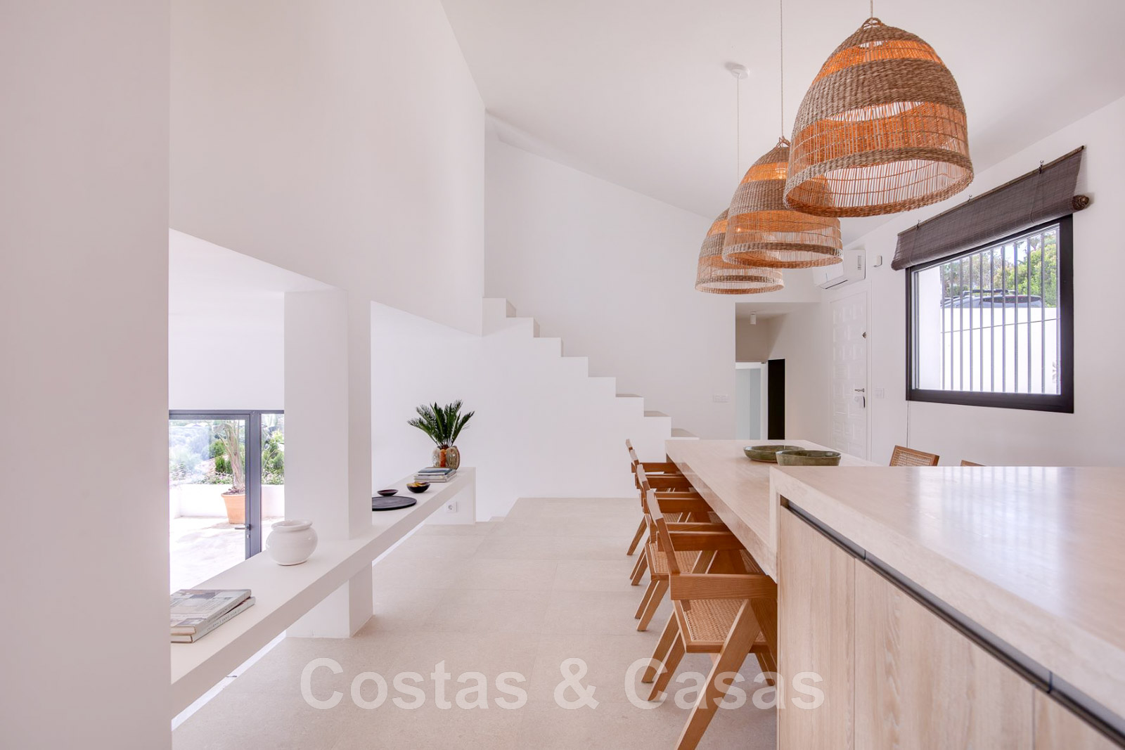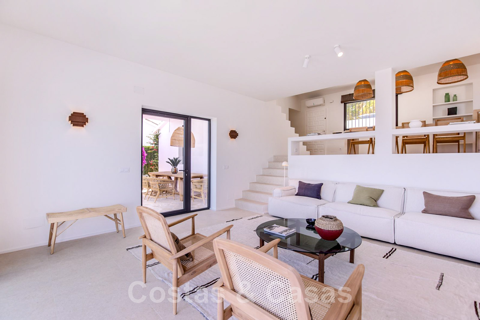 Villa de estilo mediterráneo recientemente renovada. Acabado en materiales de alta calidad. Interior acogedor con tonos neutros y atributos boho. Camino de entrada que conduce a la puerta principal y a unas escaleras exteriores que dan acceso a la terraza superior. Sala de estar con chimenea y altillo dispuesto como cocina. Amplia cocina abierta con isla de cocción y mesa grande. Desde el salón se accede a las terrazas cubiertas y descubiertas a través de una alta ventana corredera. Mucha luz natural. 4 dormitorios, 3 baños. Suelo interior de cerámica de color crema y suelo exterior de piedra natural.