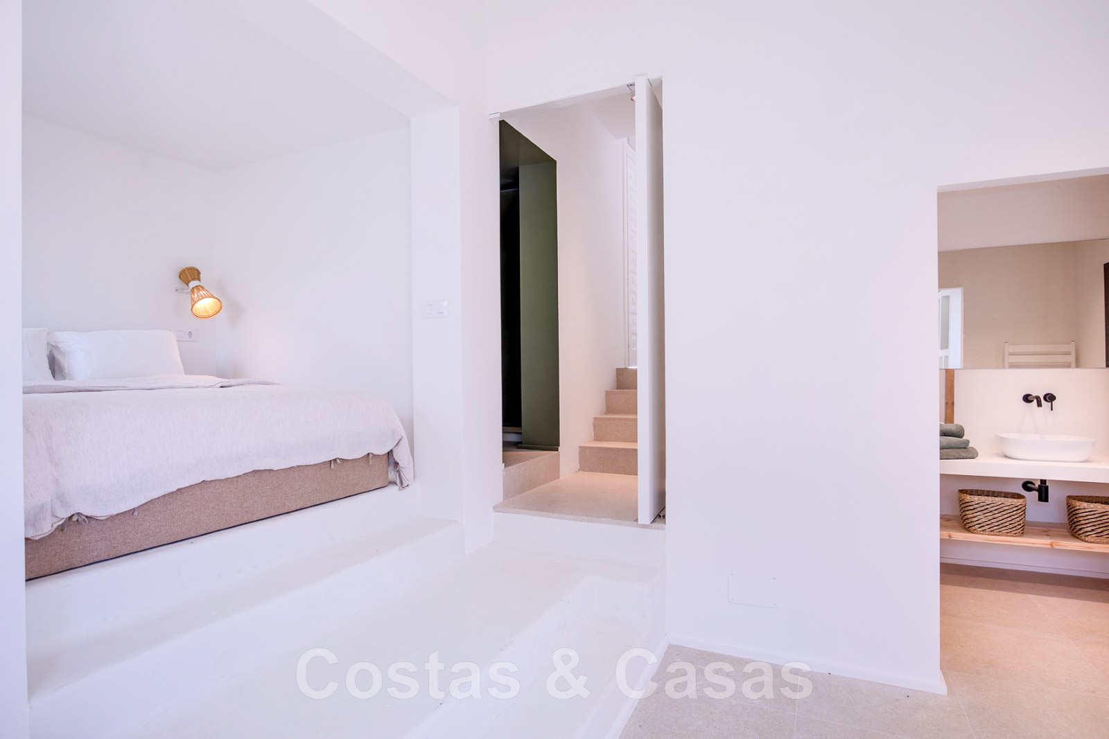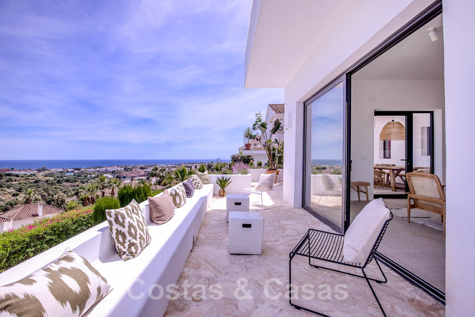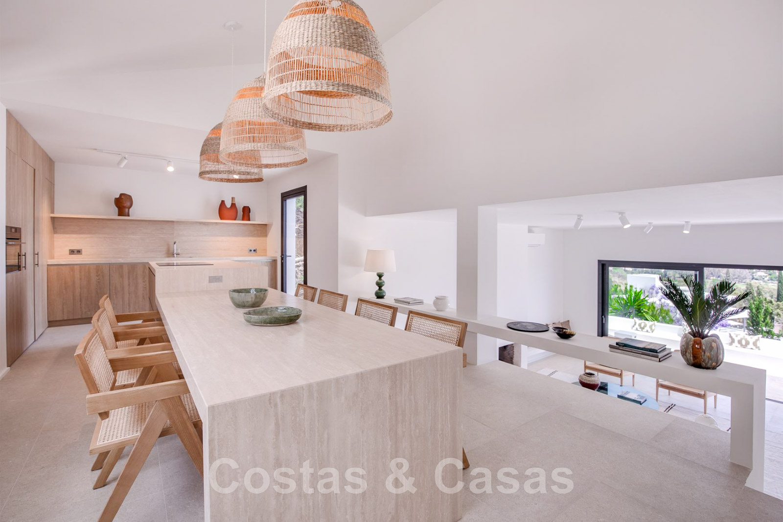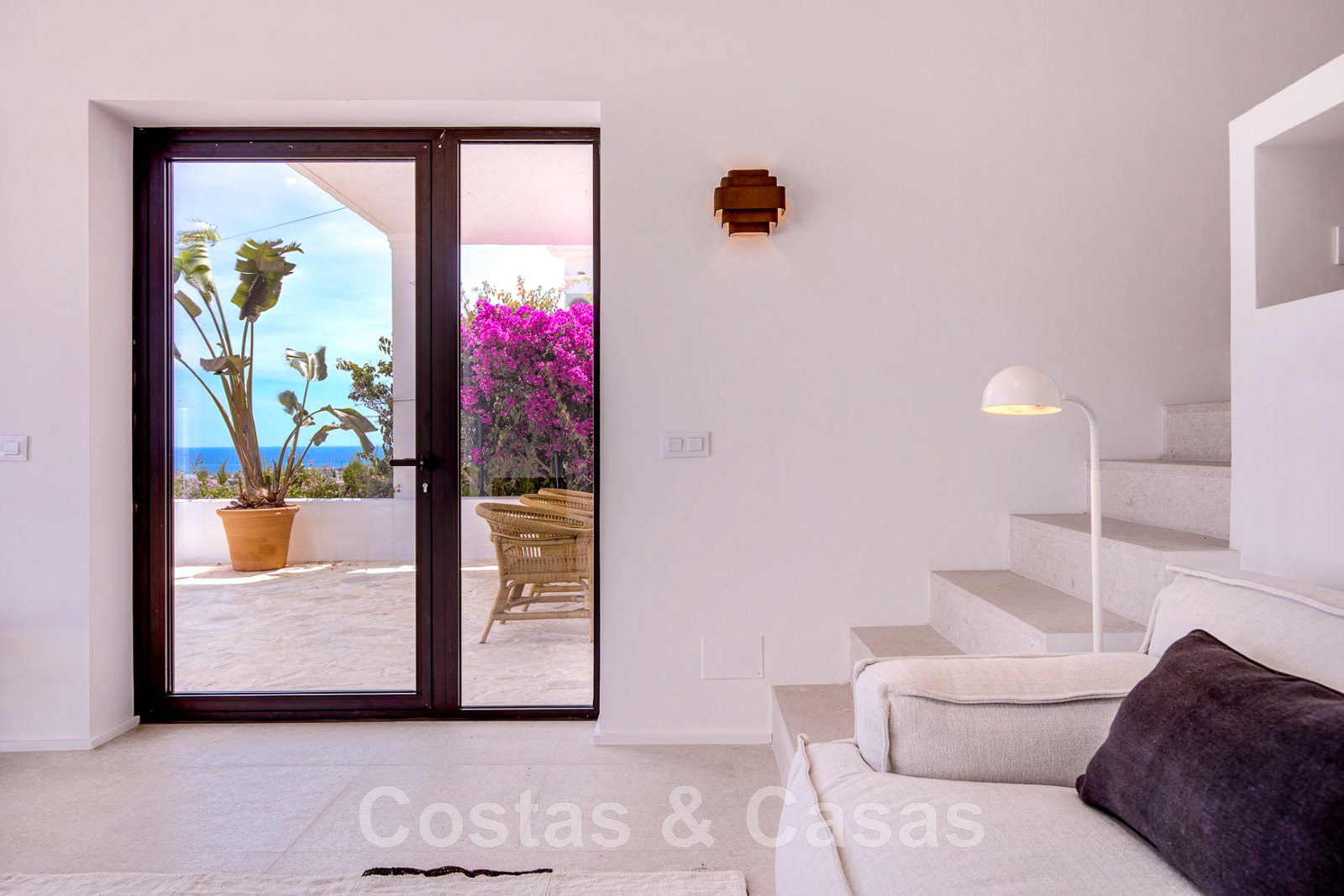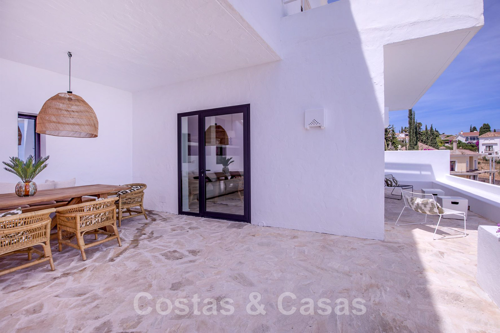 Villa de estilo mediterráneo recientemente renovada. Acabado en materiales de alta calidad. Interior acogedor con tonos neutros y atributos boho. Camino de entrada que conduce a la puerta principal y a unas escaleras exteriores que dan acceso a la terraza superior. Sala de estar con chimenea y altillo dispuesto como cocina. Amplia cocina abierta con isla de cocción y mesa grande. Desde el salón se accede a las terrazas cubiertas y descubiertas a través de una alta ventana corredera. Mucha luz natural. 4 dormitorios, 3 baños. Suelo interior de cerámica de color crema y suelo exterior de piedra natural.