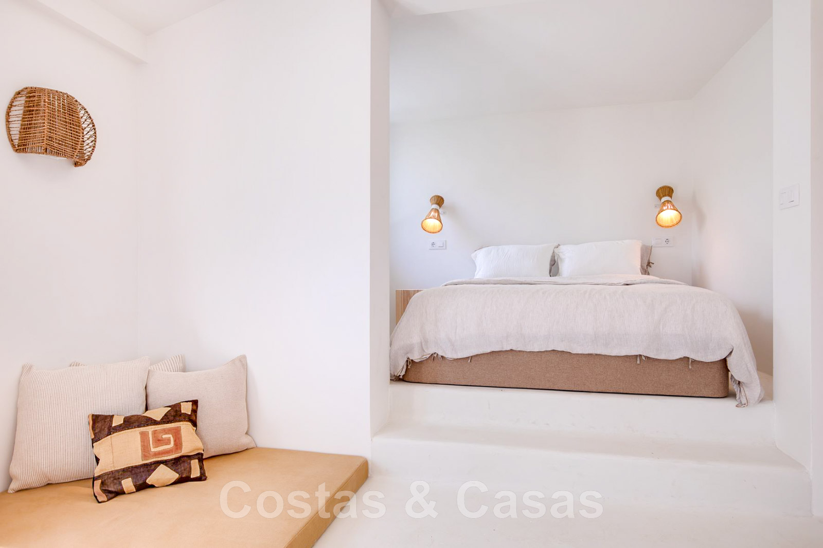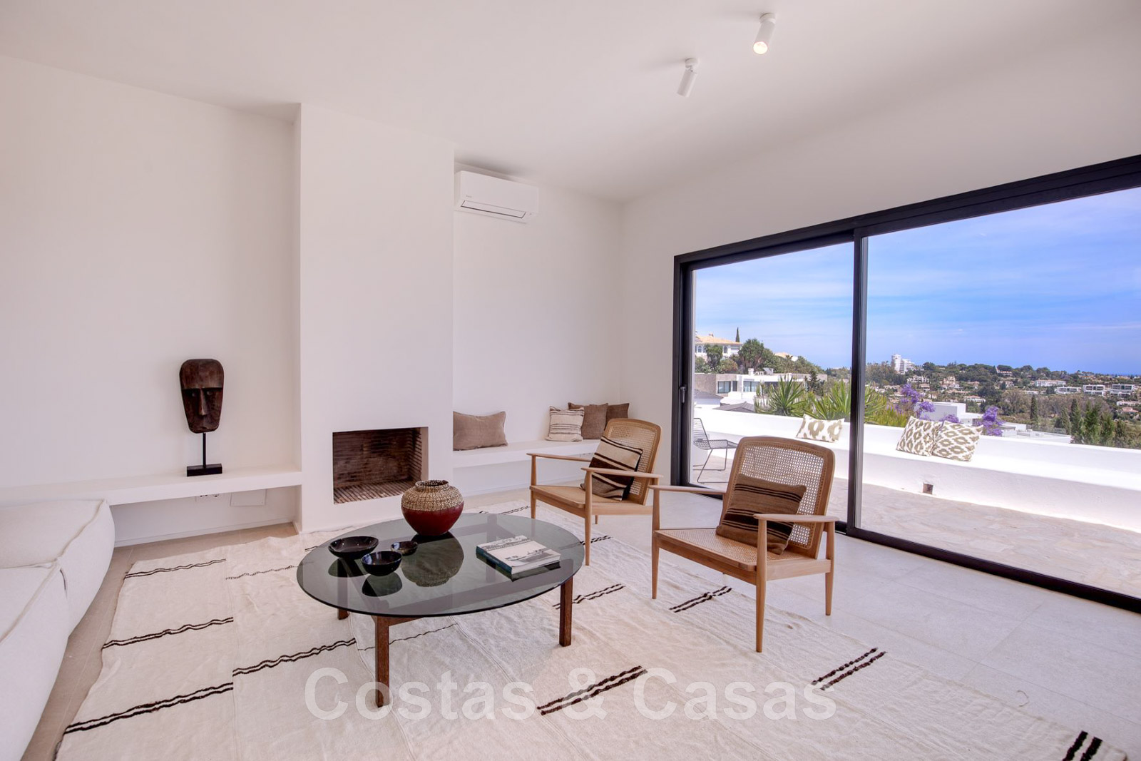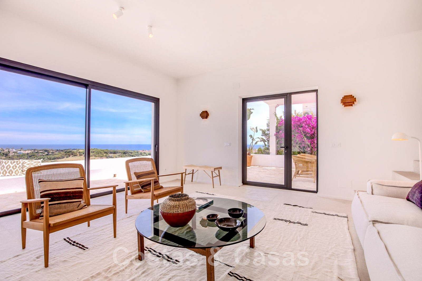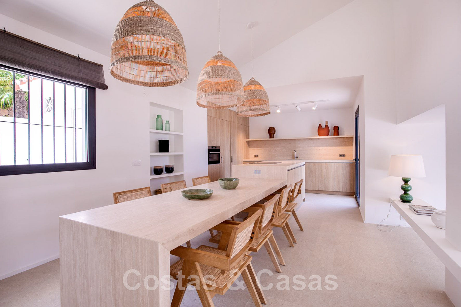 Villa de estilo mediterráneo recientemente renovada. Acabado en materiales de alta calidad. Interior acogedor con tonos neutros y atributos boho. Camino de entrada que conduce a la puerta principal y a unas escaleras exteriores que dan acceso a la terraza superior. Sala de estar con chimenea y altillo dispuesto como cocina. Amplia cocina abierta con isla de cocción y mesa grande. Desde el salón se accede a las terrazas cubiertas y descubiertas a través de una alta ventana corredera. Mucha luz natural. 4 dormitorios, 3 baños. Suelo interior de cerámica de color crema y suelo exterior de piedra natural.