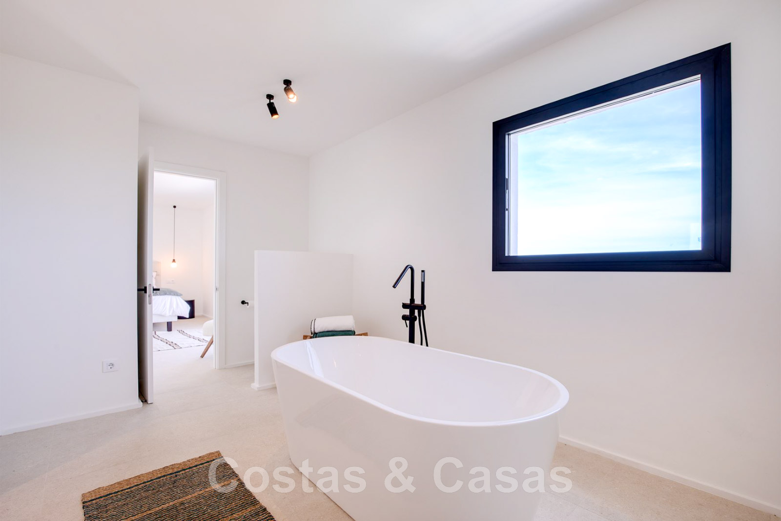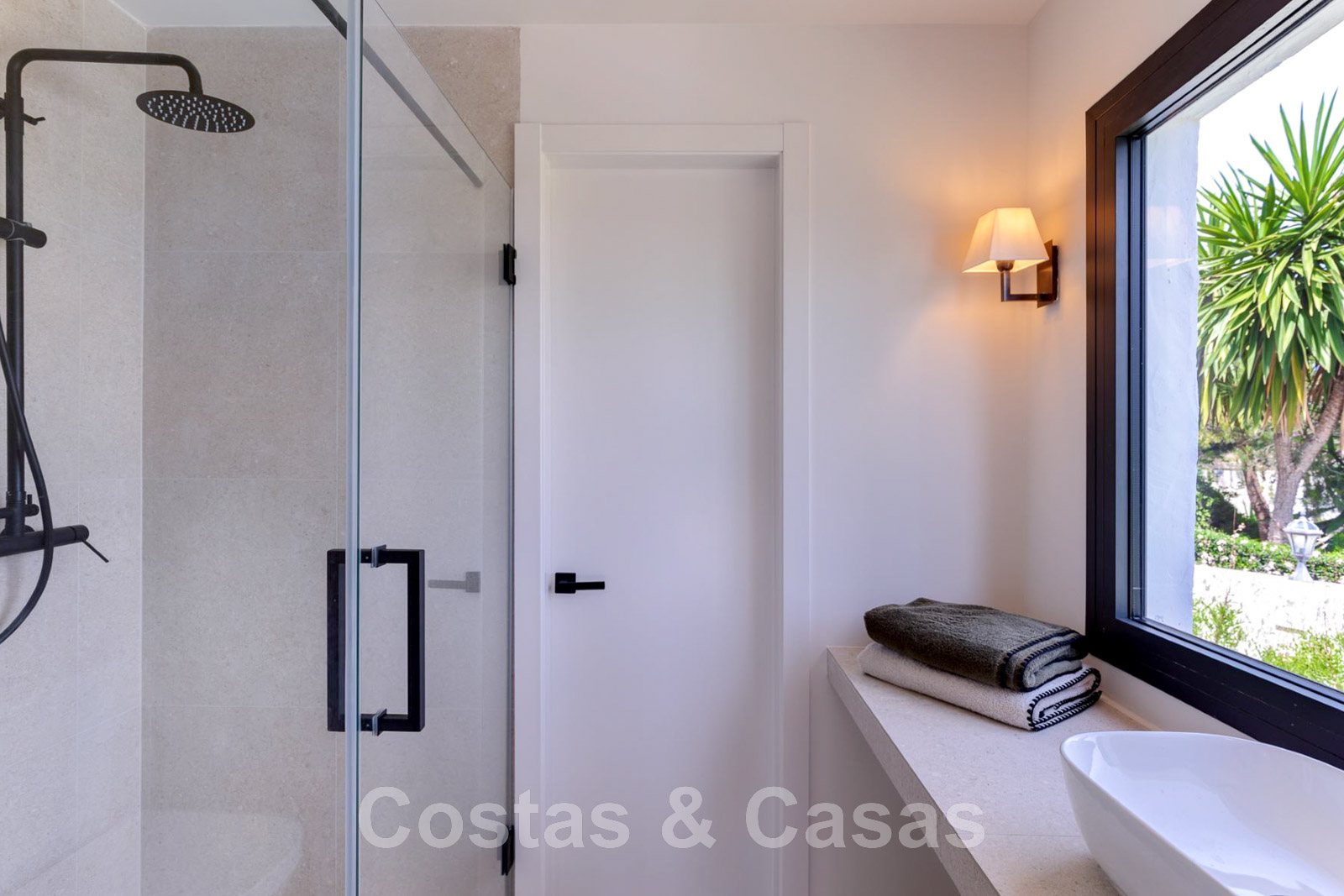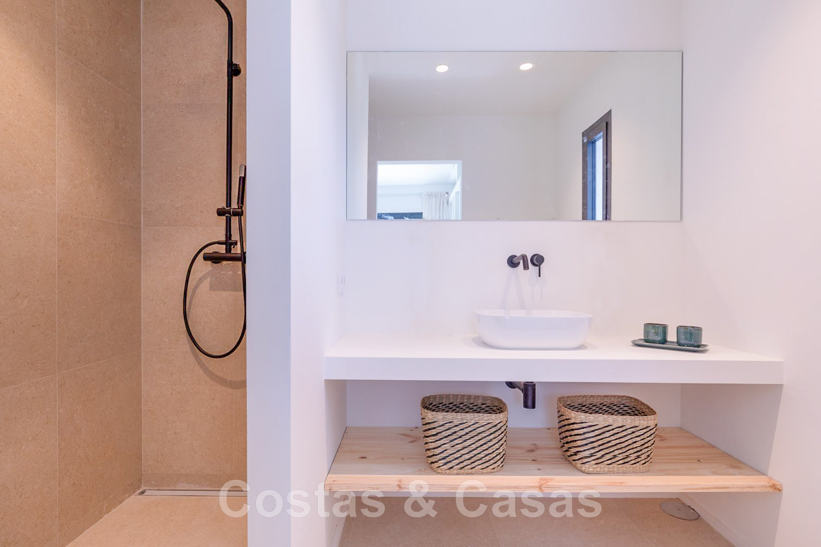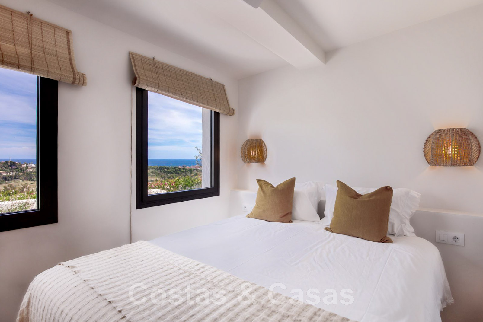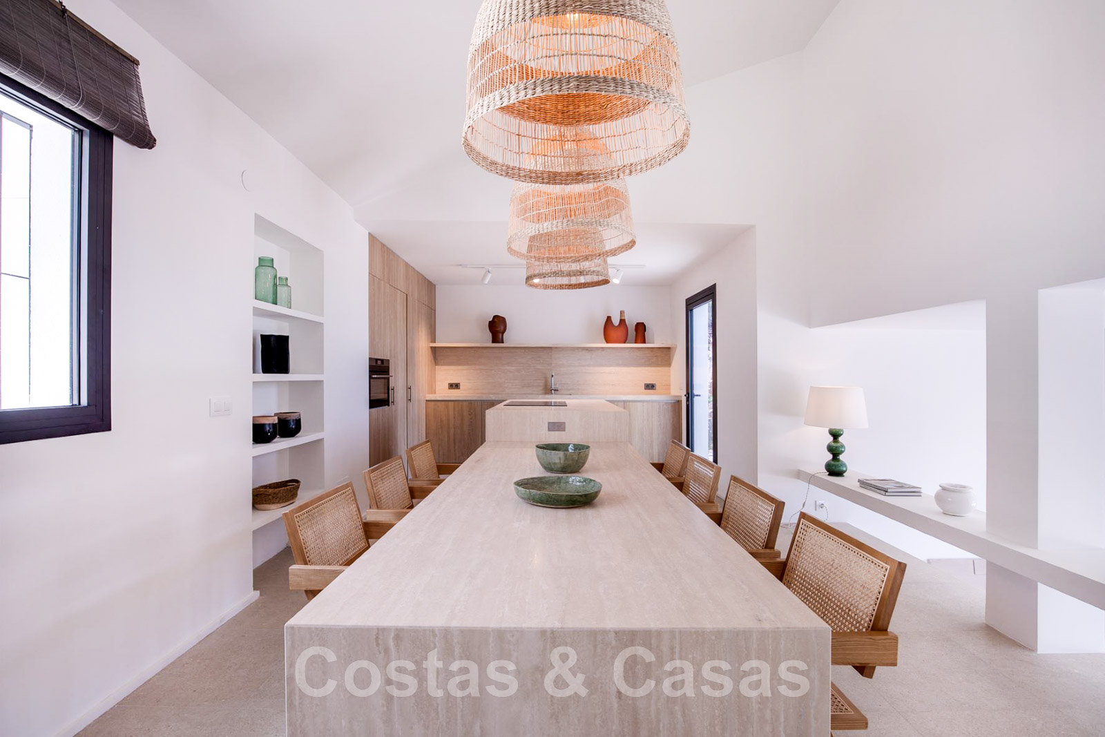 Villa de estilo mediterráneo recientemente renovada. Acabado en materiales de alta calidad. Interior acogedor con tonos neutros y atributos boho. Camino de entrada que conduce a la puerta principal y a unas escaleras exteriores que dan acceso a la terraza superior. Sala de estar con chimenea y altillo dispuesto como cocina. Amplia cocina abierta con isla de cocción y mesa grande. Desde el salón se accede a las terrazas cubiertas y descubiertas a través de una alta ventana corredera. Mucha luz natural. 4 dormitorios, 3 baños. Suelo interior de cerámica de color crema y suelo exterior de piedra natural.