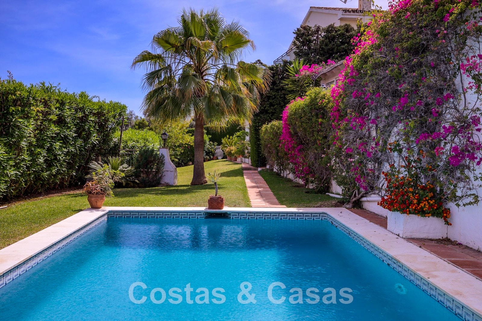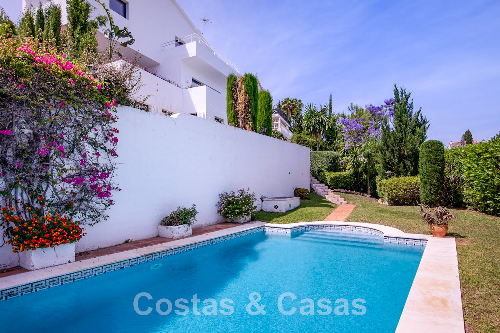 Parcela elevada. Jardín bien cuidado con zonas verdes. Gran piscina comunitaria rodeada de césped. Comunidad cerrada de 4 villas. Atractivas terrazas cubiertas y descubiertas con zonas de relax. Vista de 180° sobre el valle del golf y el mar Mediterráneo. Orientación sur.