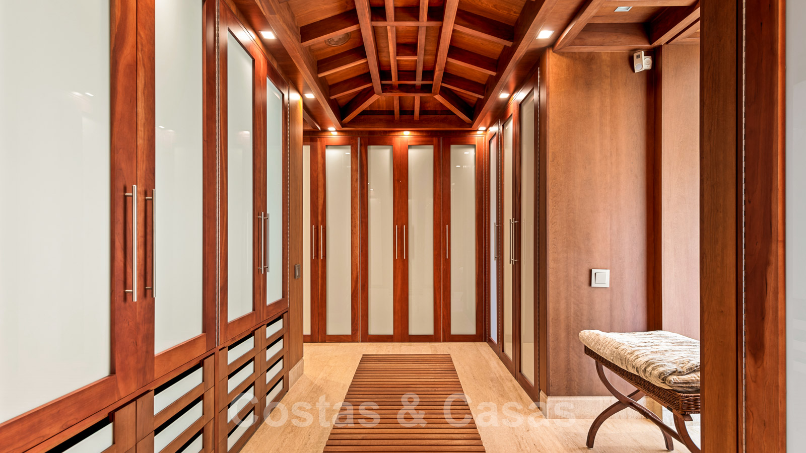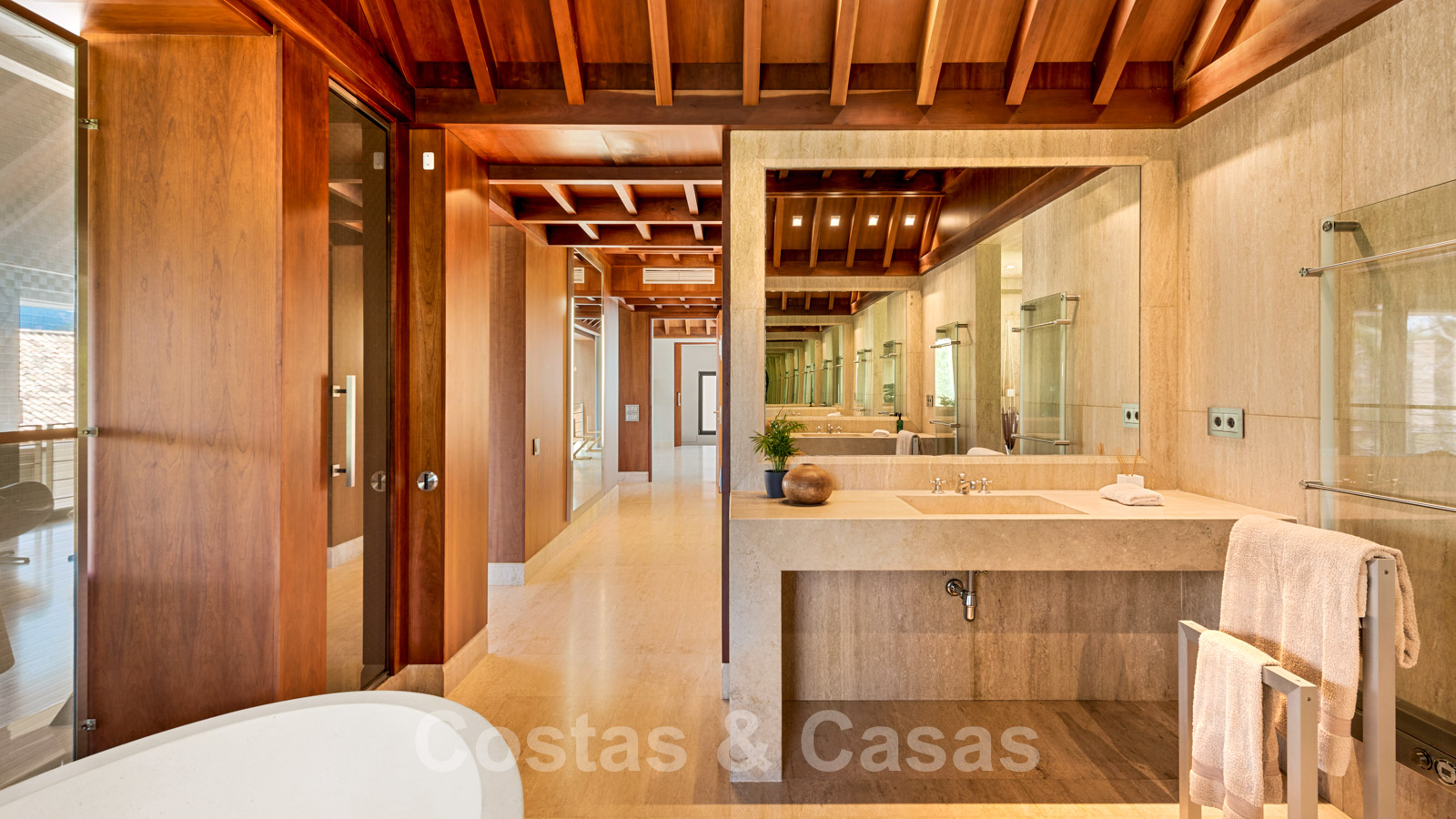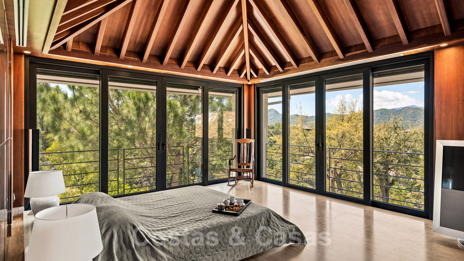 Varias habitaciones tienen techos altos, modernos y abovedados con vigas de madera.