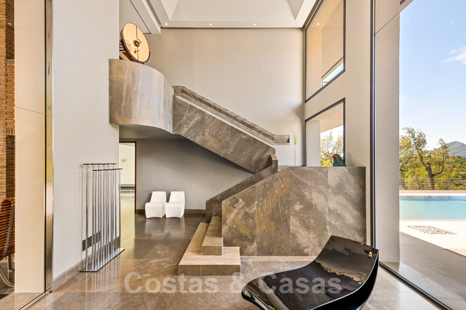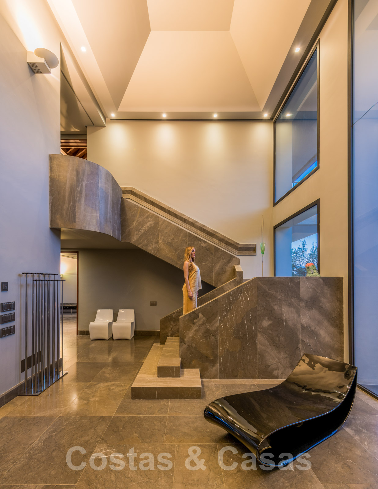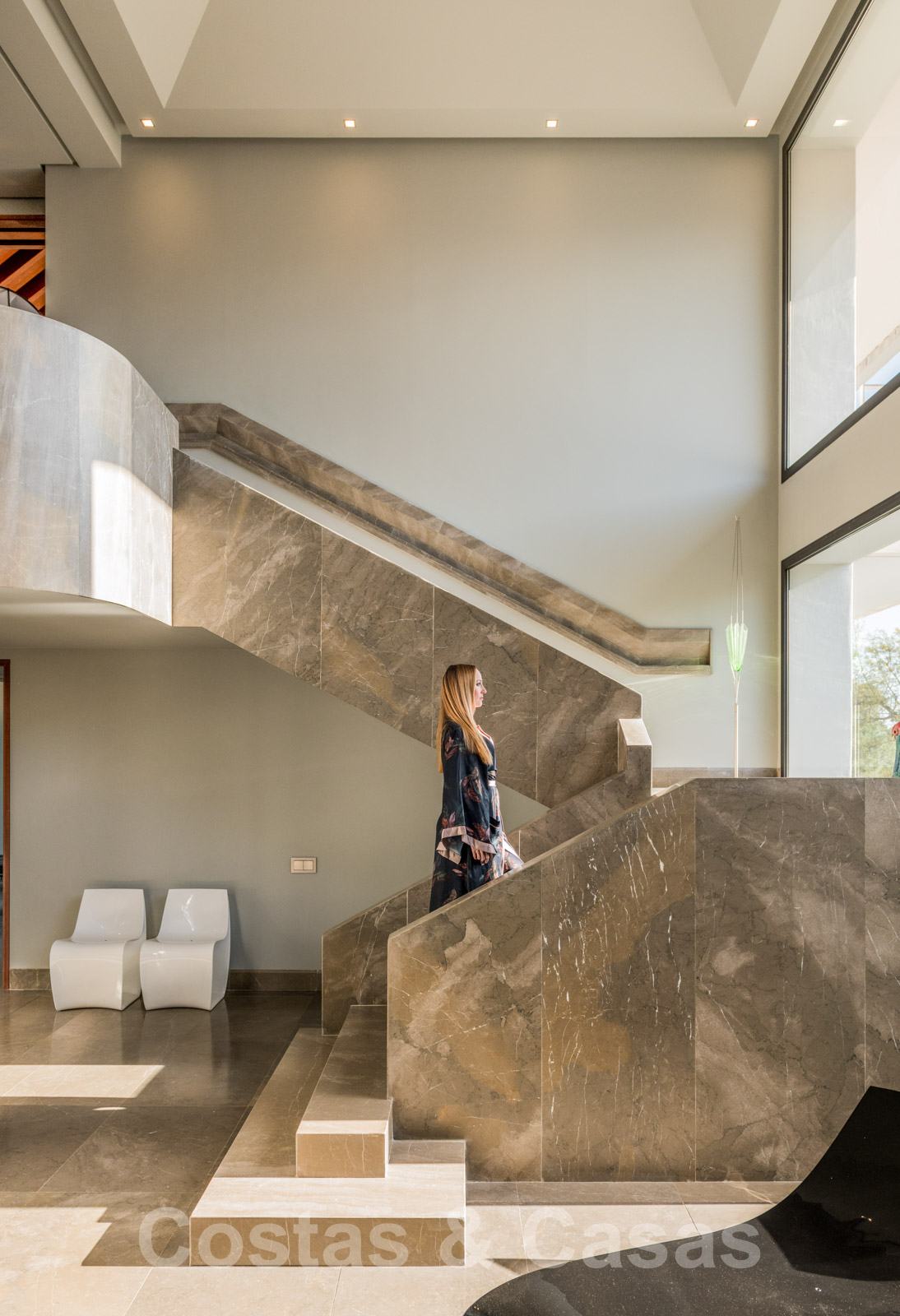 Recibidor de doble altura con escaleras de mármol arquitectónico.