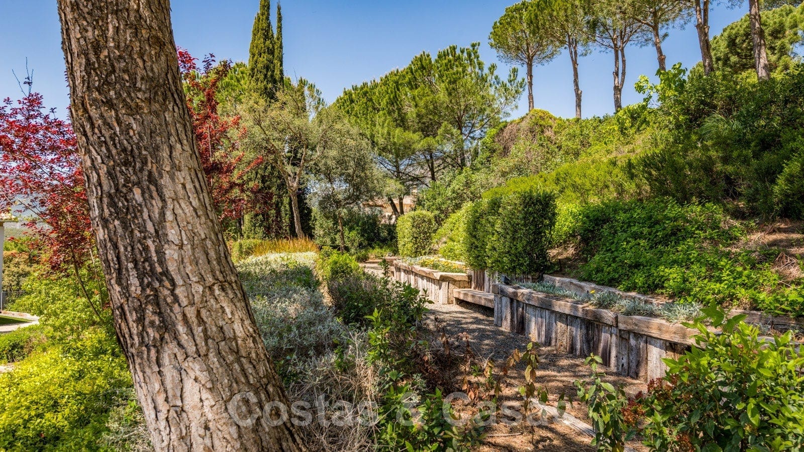 Jardín mediterráneo muy cuidado con una amplia zona de césped.