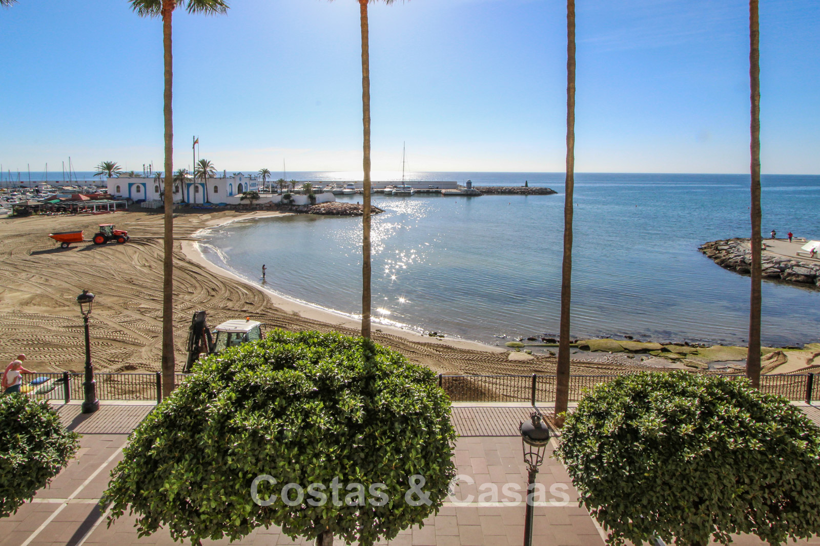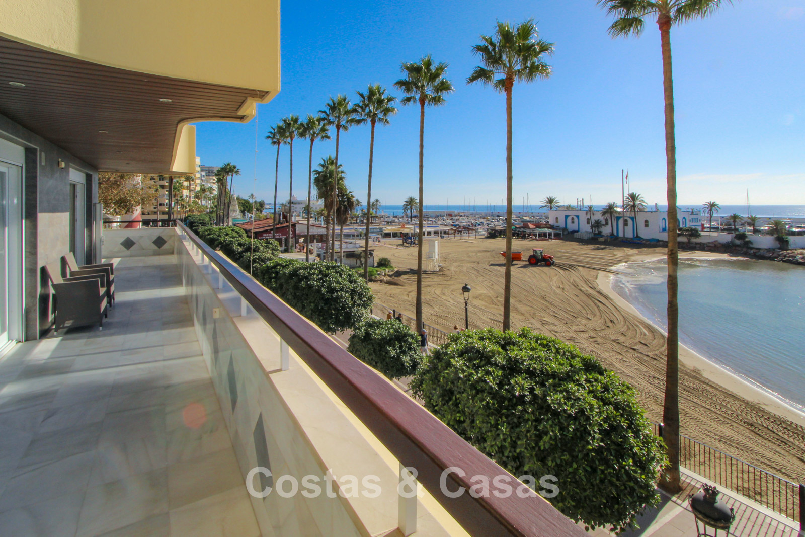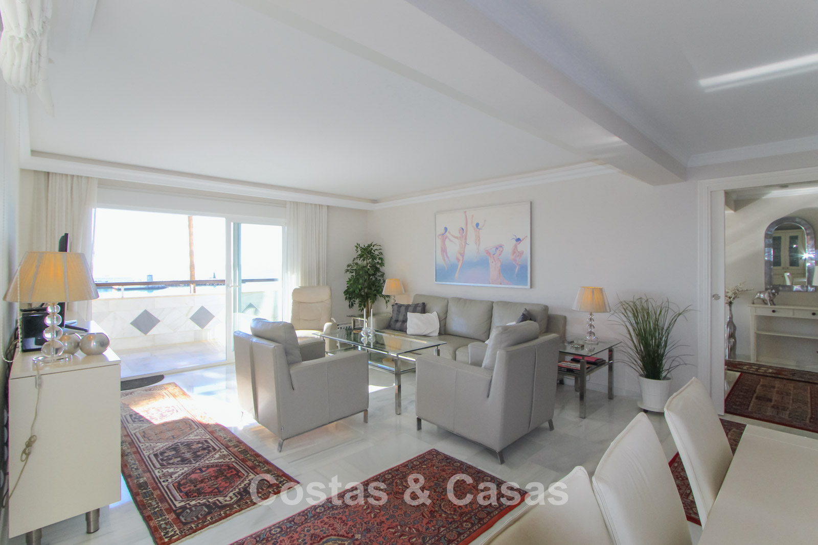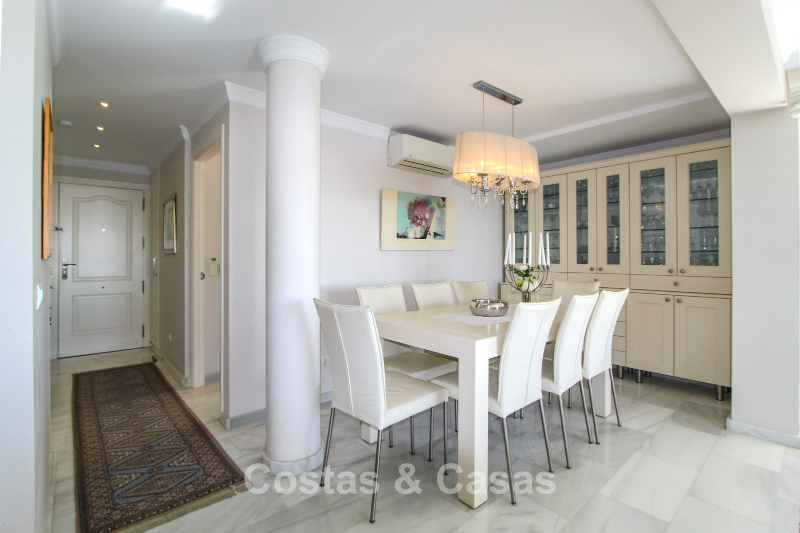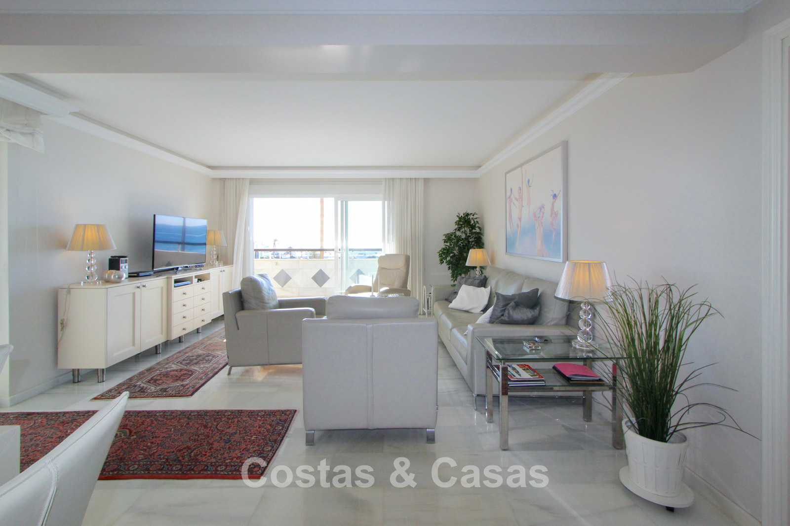 El apartamento de playa se creó combinando 2 apartamentos separados. Apartamento en esquina situado en el 2a planta. El apartamento fue renovado teniendo en cuenta la luz óptima, la sensación de amplitud y el máximo confort. Orientación suroeste. Vistas fenomenales de la playa y del puerto de Marbella. Las altas ventanas corredizas generan abundante luz natural y se abren a la terraza orientada al sur. Sala de estar diáfana con comedor integrado. Cocina equipada con mucho espacio de almacenamiento y una isla central con asientos. Al lado hay un lavadero/cuarto de servicio. 3 dormitorios, 3 baños. Suelos de mármol. Existe la posibilidad de alquilar un trastero y una plaza de aparcamiento subterráneo.