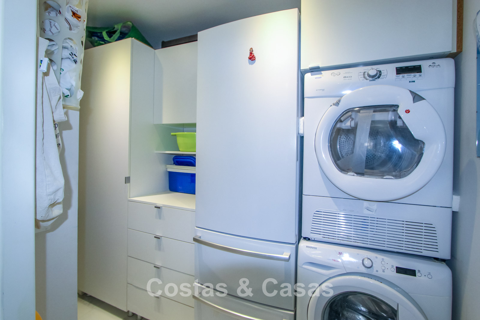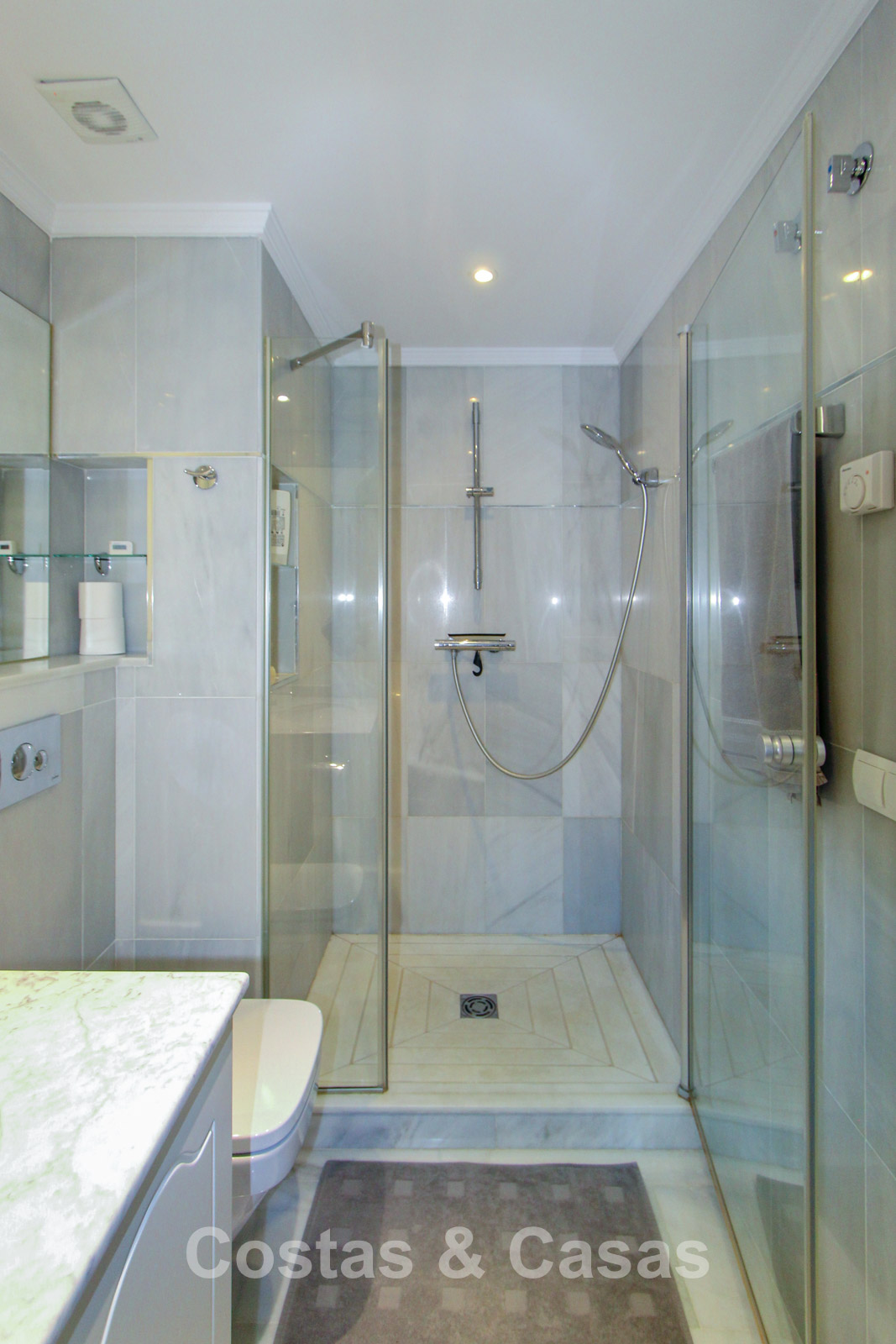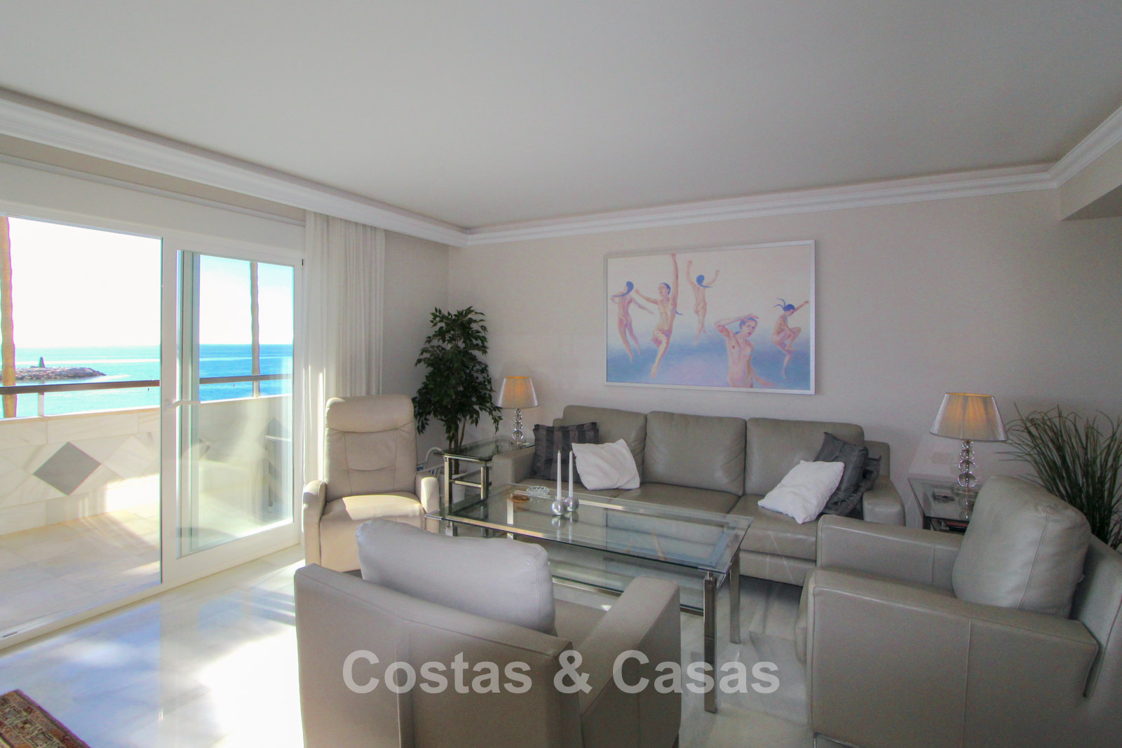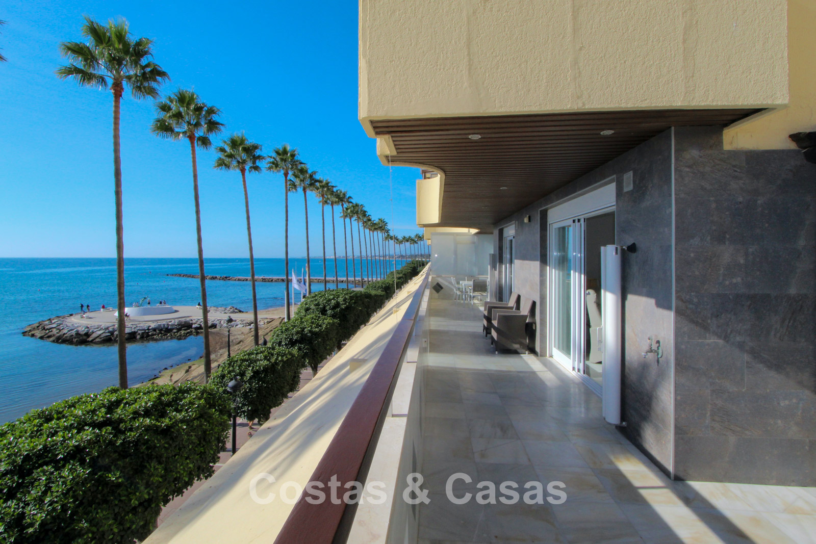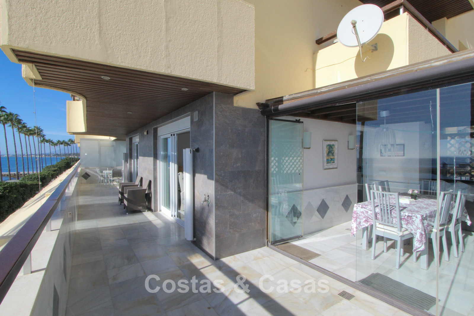 El apartamento de playa se creó combinando 2 apartamentos separados. Apartamento en esquina situado en el 2a planta. El apartamento fue renovado teniendo en cuenta la luz óptima, la sensación de amplitud y el máximo confort. Orientación suroeste. Vistas fenomenales de la playa y del puerto de Marbella. Las altas ventanas corredizas generan abundante luz natural y se abren a la terraza orientada al sur. Sala de estar diáfana con comedor integrado. Cocina equipada con mucho espacio de almacenamiento y una isla central con asientos. Al lado hay un lavadero/cuarto de servicio. 3 dormitorios, 3 baños. Suelos de mármol. Existe la posibilidad de alquilar un trastero y una plaza de aparcamiento subterráneo.