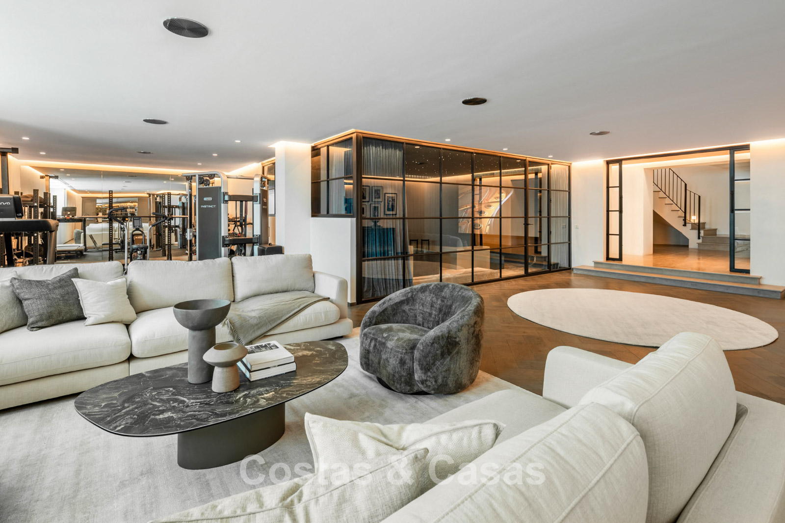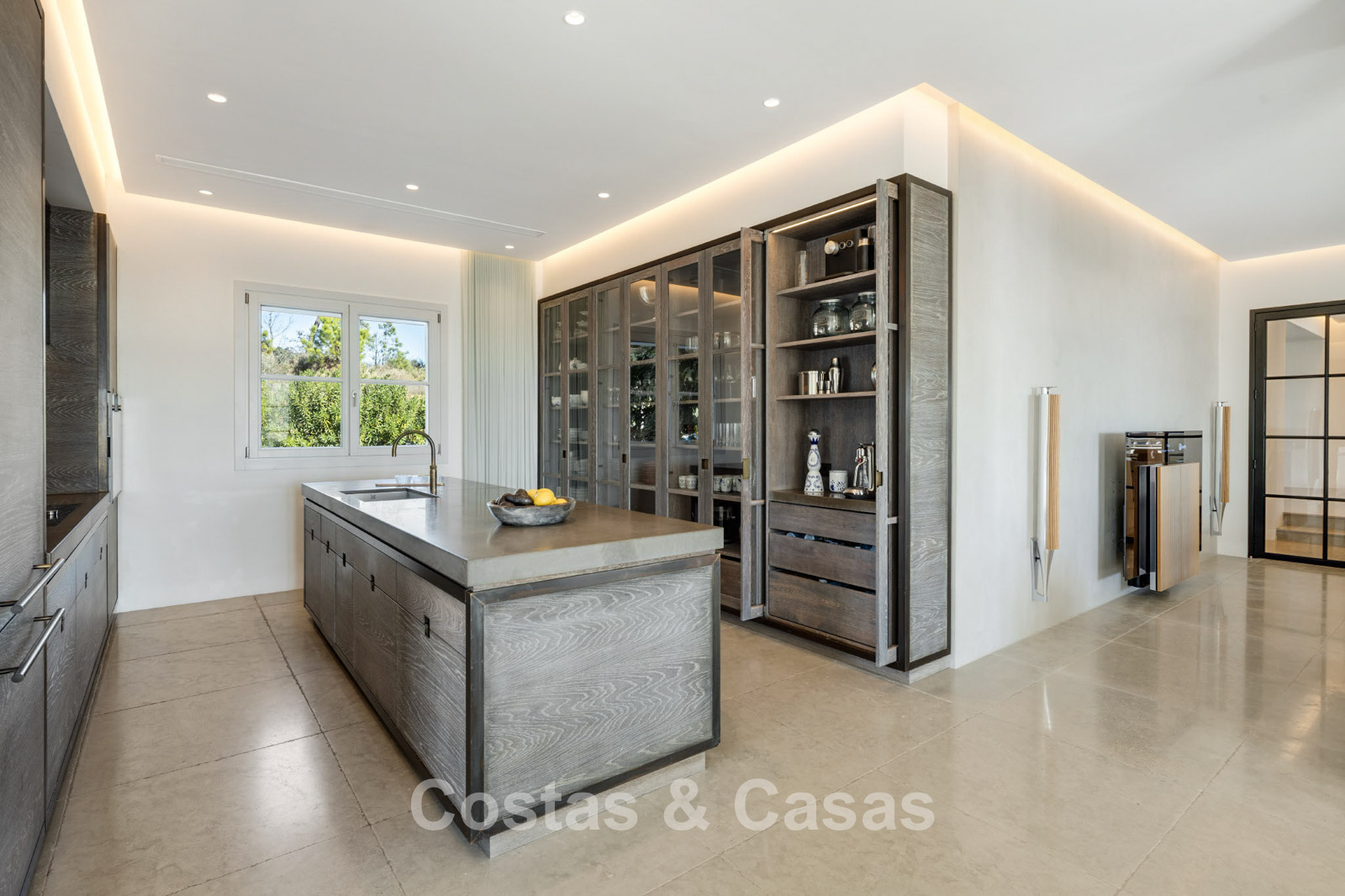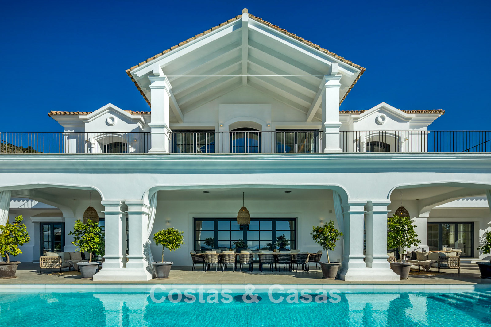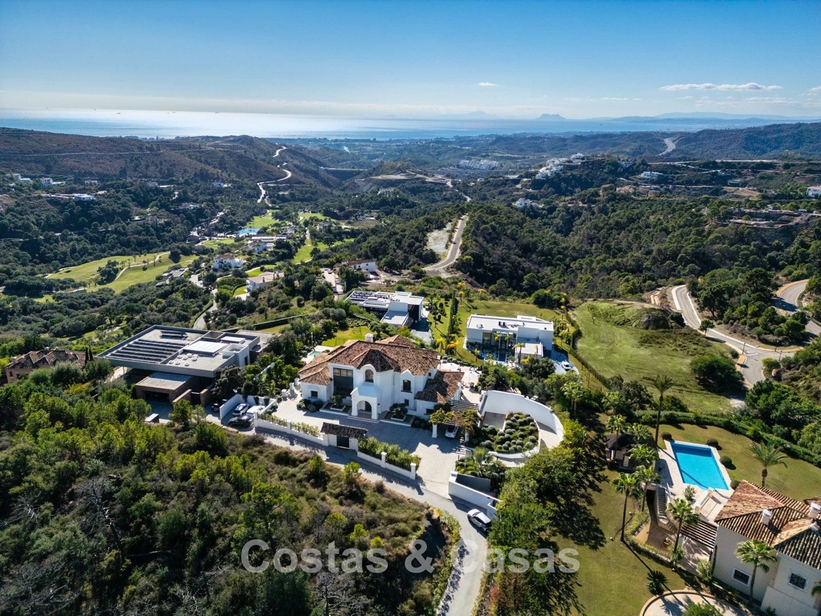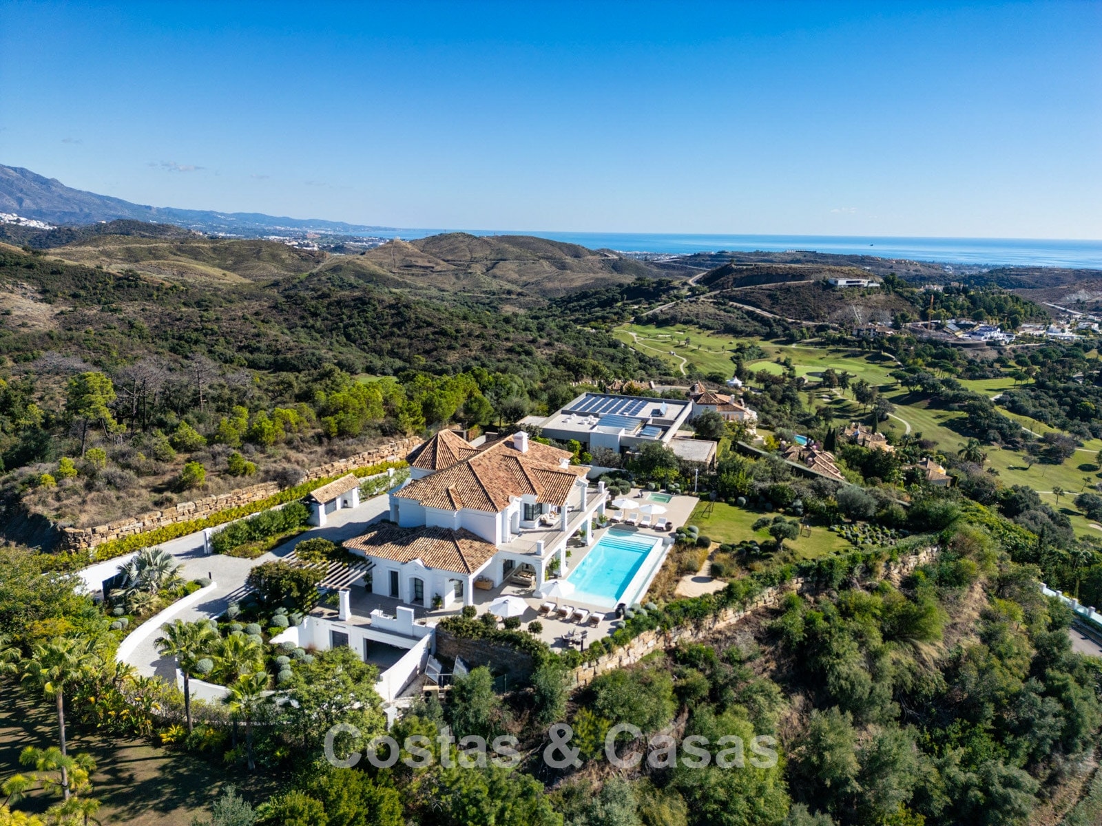 Villa independiente de estilo andaluz clásico combinada con lujo contemporáneo y simetría. Construida con materiales de alta calidad y detalles cuidadosamente pensados. Grandes ventanales que aportan abundante luz natural y una perfecta conexión entre interior y exterior, maximizando las vistas. El elegante interior desprende un diseño de lujo chic con materiales refinados y sutiles acentos. Amplio salón de TV contiguo al comedor. Cocina de concepto abierto con estética escandinava, equipada con electrodomésticos Gaggenau y una isla central. 7 dormitorios, 6 baños. En la planta inferior, zona chill-out con bar, junto a un gimnasio totalmente equipado y sauna. Cine en casa tipo loft con techo estrellado y sistema Bang & Olufsen. Lavadero equipado con electrodomésticos Miele. Suelos de baldosas de gran formato y alta calidad. Garaje cerrado para 2 coches. 2 cocheras cubiertas. Amplio espacio de aparcamiento para hasta 10 vehículos.
