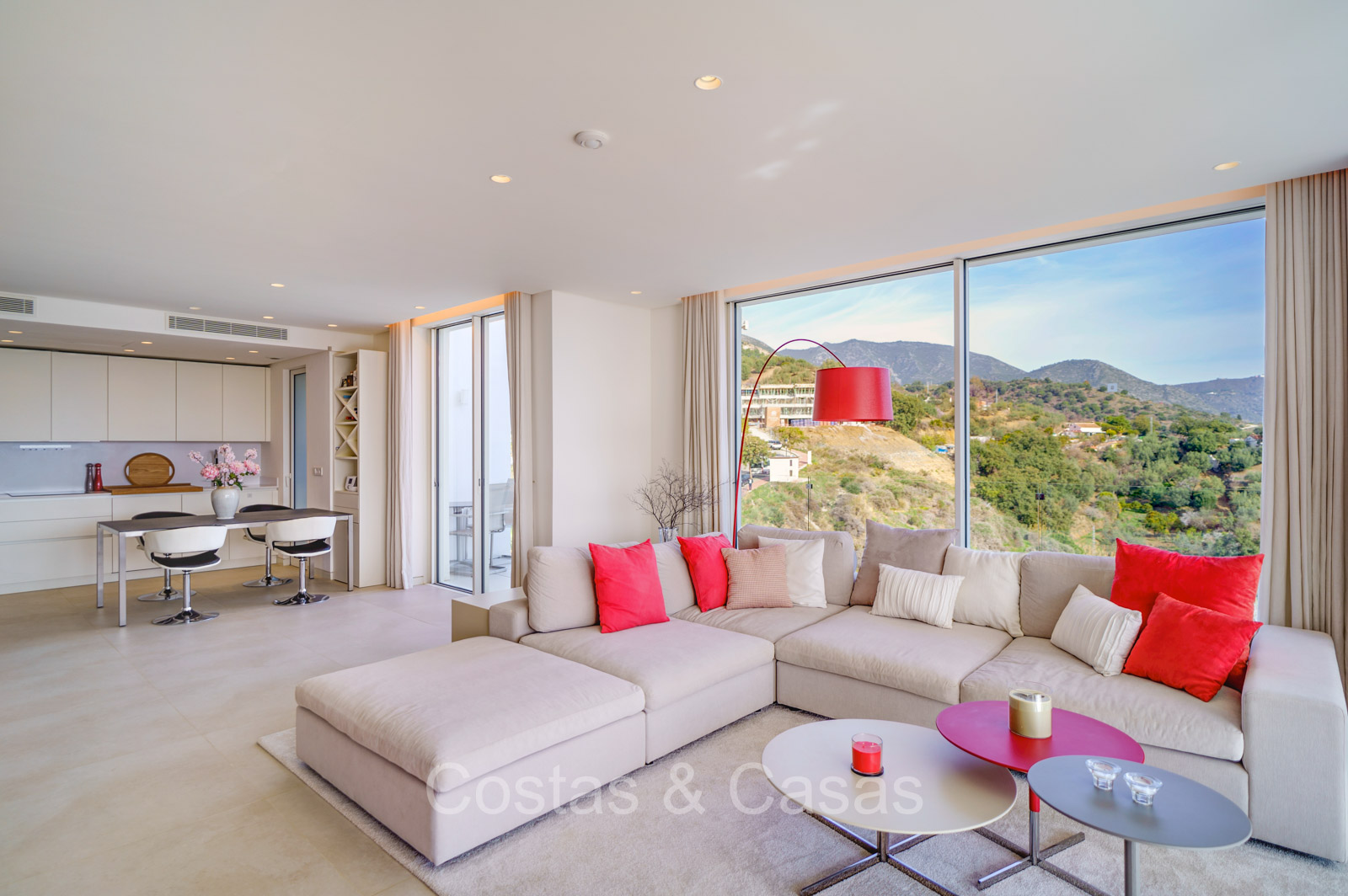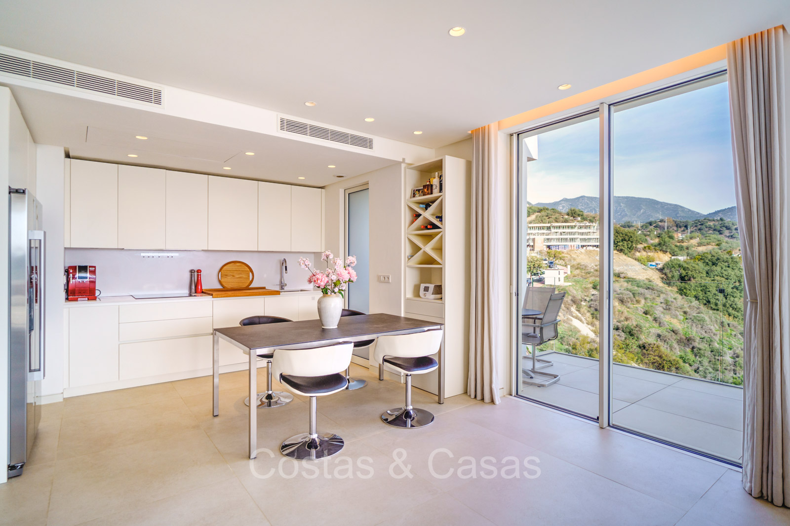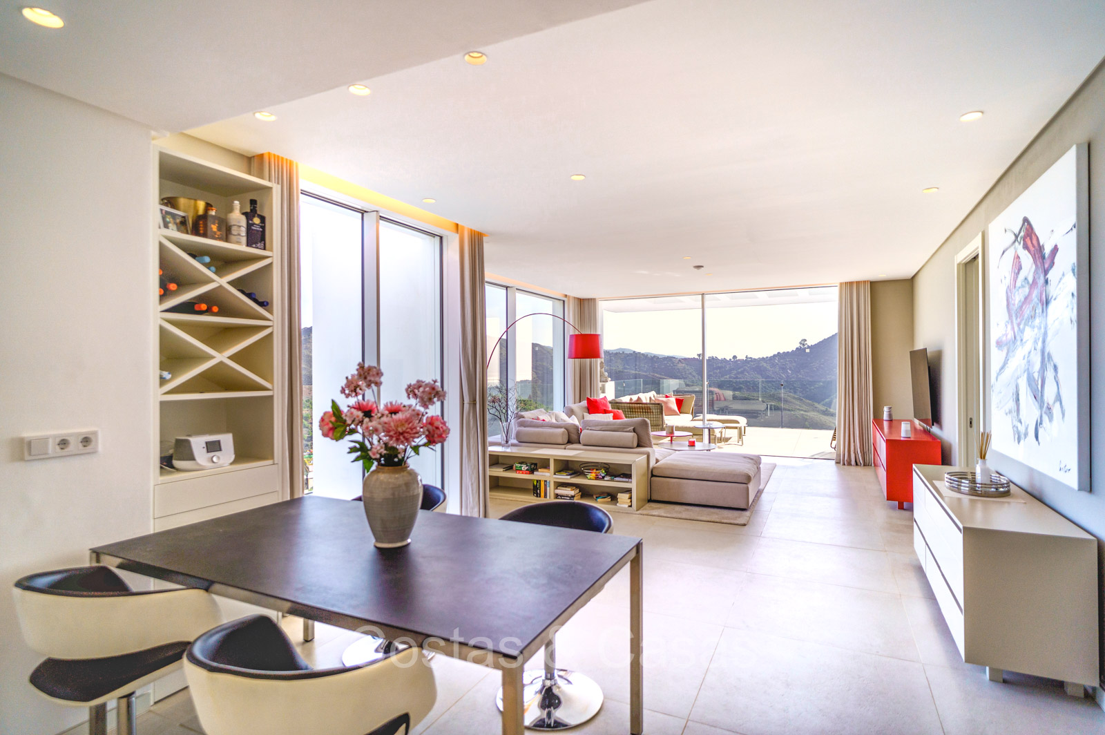 Amplio apartamento de estilo moderno y contemporáneo. Utilizando materiales de calidad. Ubicado al sureste. Impresionantes vistas al mar Mediterráneo y al paisaje de montaña. Las ventanas corredizas de suelo a techo con marcos empotrados brindan un flujo perfecto entre los espacios interiores y exteriores y también crean un interior aireado y muy luminoso. Espacio habitable de planta abierta. Cocina totalmente equipada con electrodomésticos Siemens de alta calidad. Lavadero independiente con lavadora y secadora. 3 dormitorios, 2 baños y aseo independiente. Suelos de baldosas color crema. 2 trasteros de 9m² cada uno. Garaje interior para 2 coches.