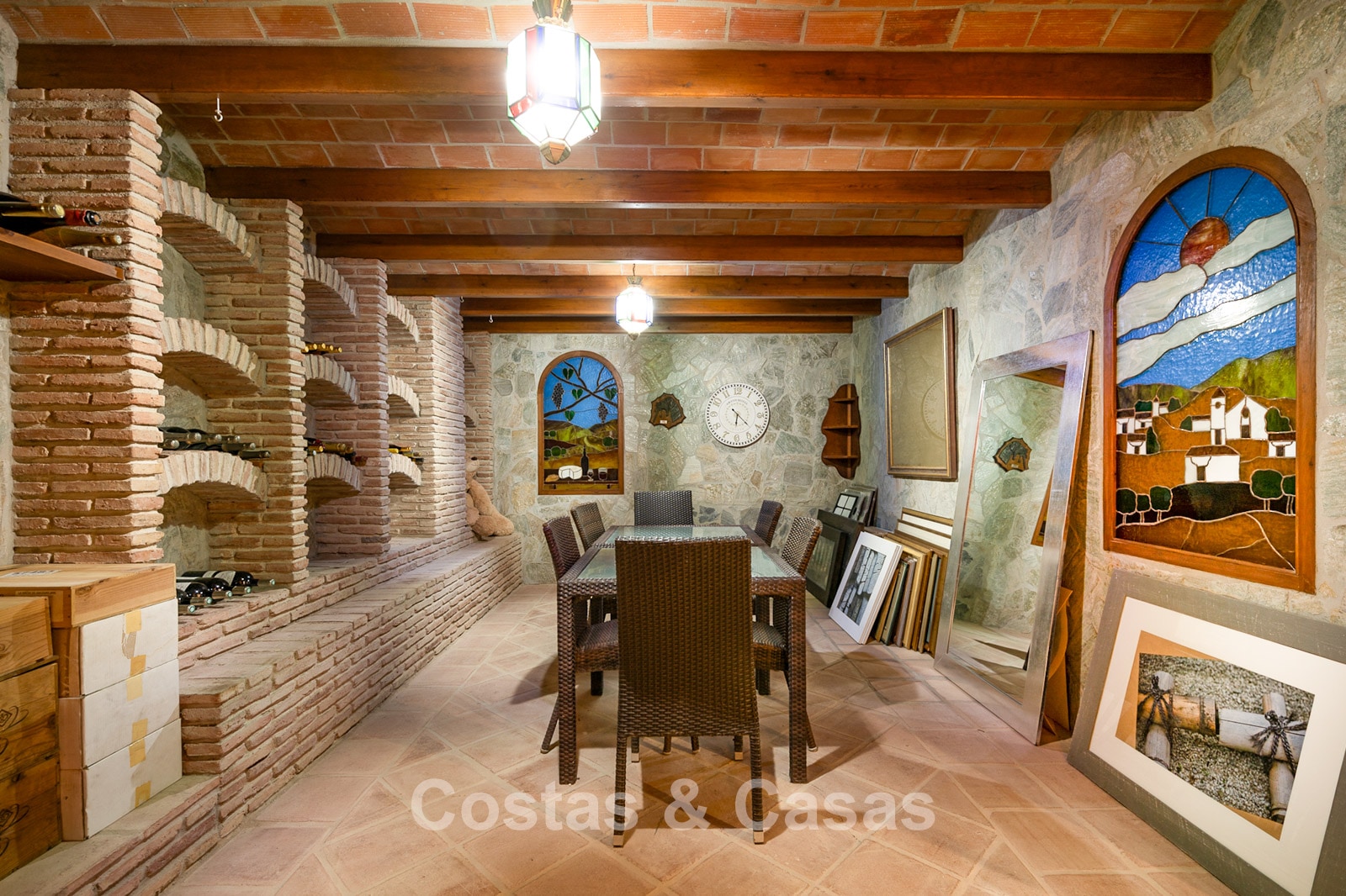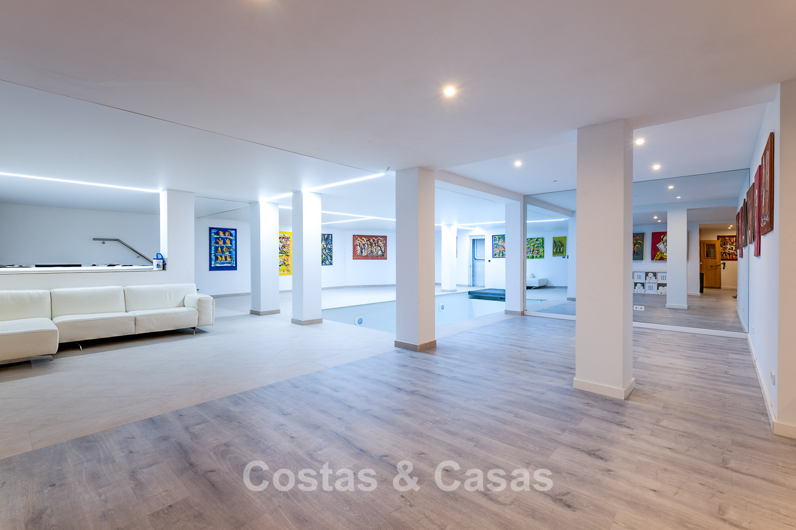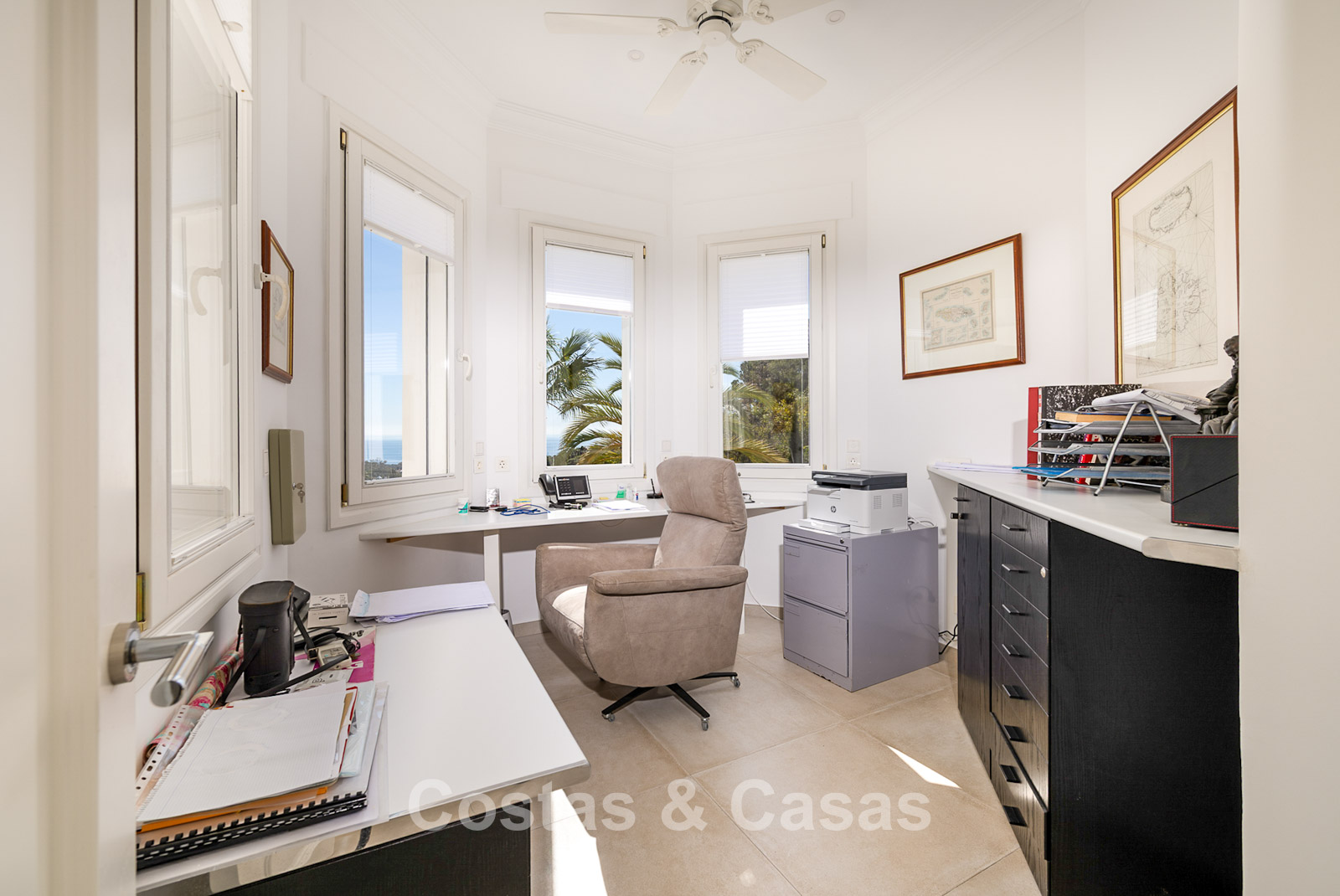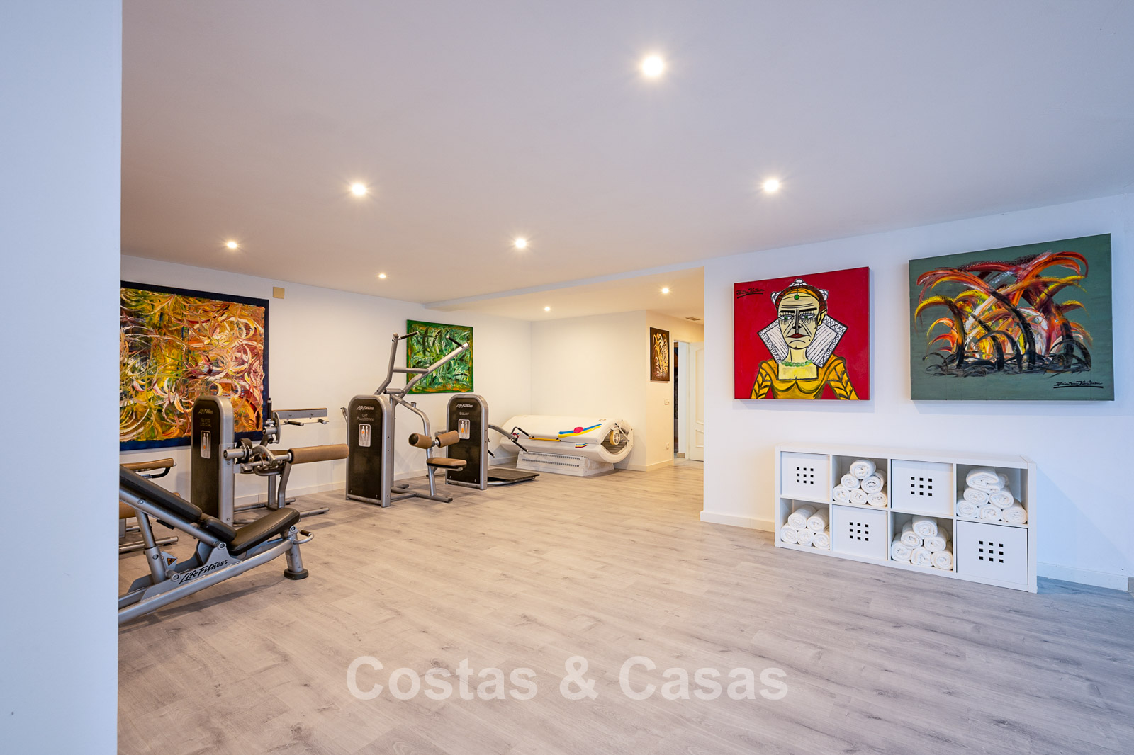 Impresionante villa de estilo clásico-moderno distribuida en varias plantas. Recientemente renovada con un diseño contemporáneo y gran atención al detalle. Acabados de alta calidad y materiales de lujo. Patio andaluz modernizado con entrada de doble altura y grandes ventanales arqueados. Amplia zona de estar con salón formal y acogedores espacios de descanso. Cocina totalmente equipada con electrodomésticos modernos integrados. 9 dormitorios, cada uno con baño en suite y armarios empotrados. La suite principal cuenta con una gran terraza privada con espectaculares vistas al litoral. Apartamento independiente para invitados con cocina y salón, ideal para personal o visitas. Espacio de oficina/exposición. Planta baja con gimnasio profesional, sauna, jacuzzi y piscina interior. Bodega tradicional. Amplio espacio de almacenamiento y lavandería independiente. Sala técnica. Sótano sin terminar, personalizable. Garaje privado para 2 coches y aparcamiento adicional dentro de la parcela cerrada.