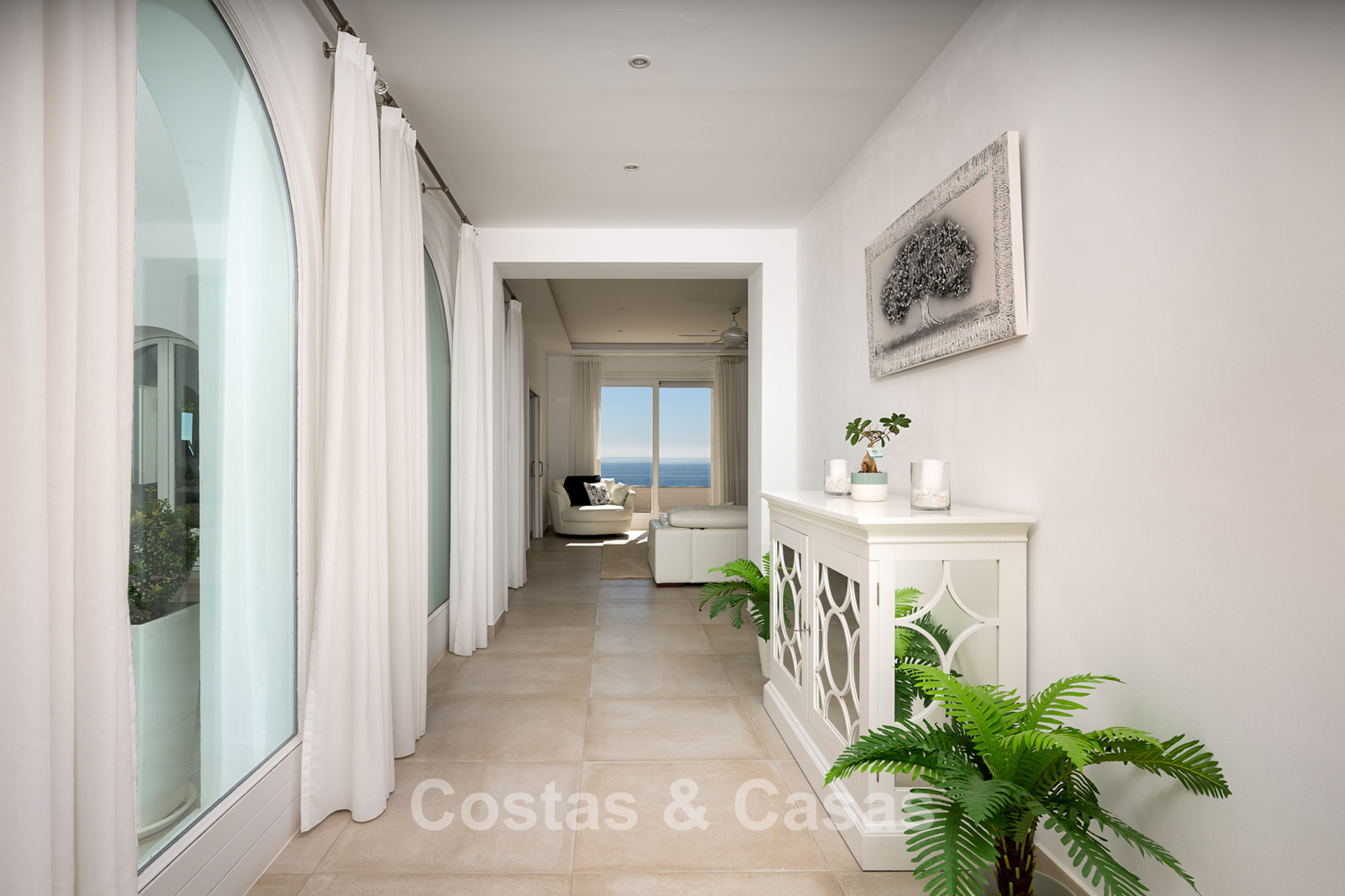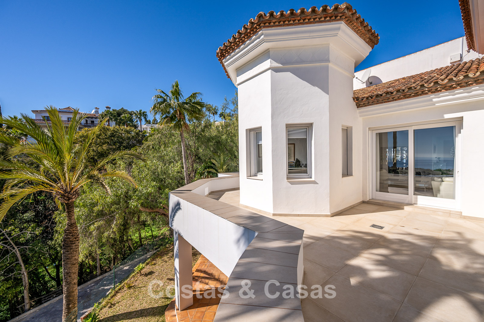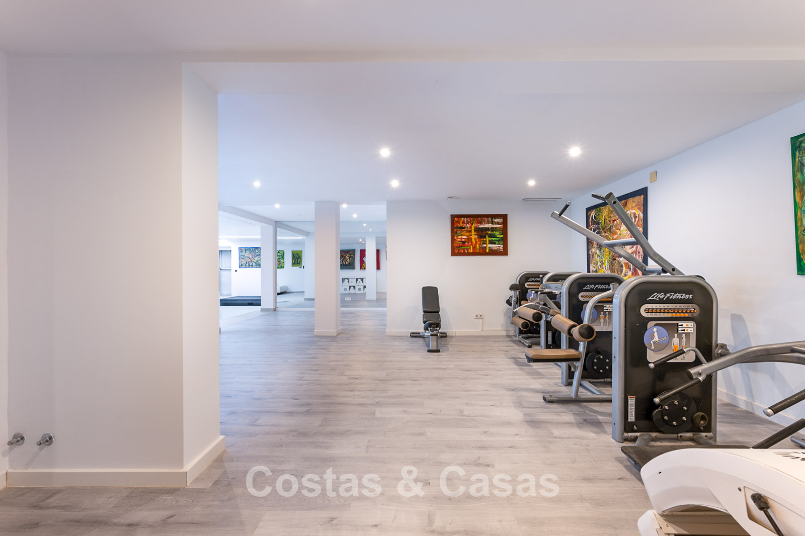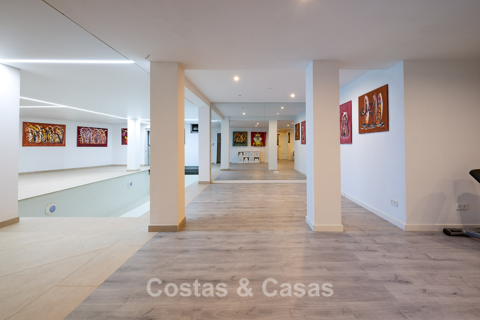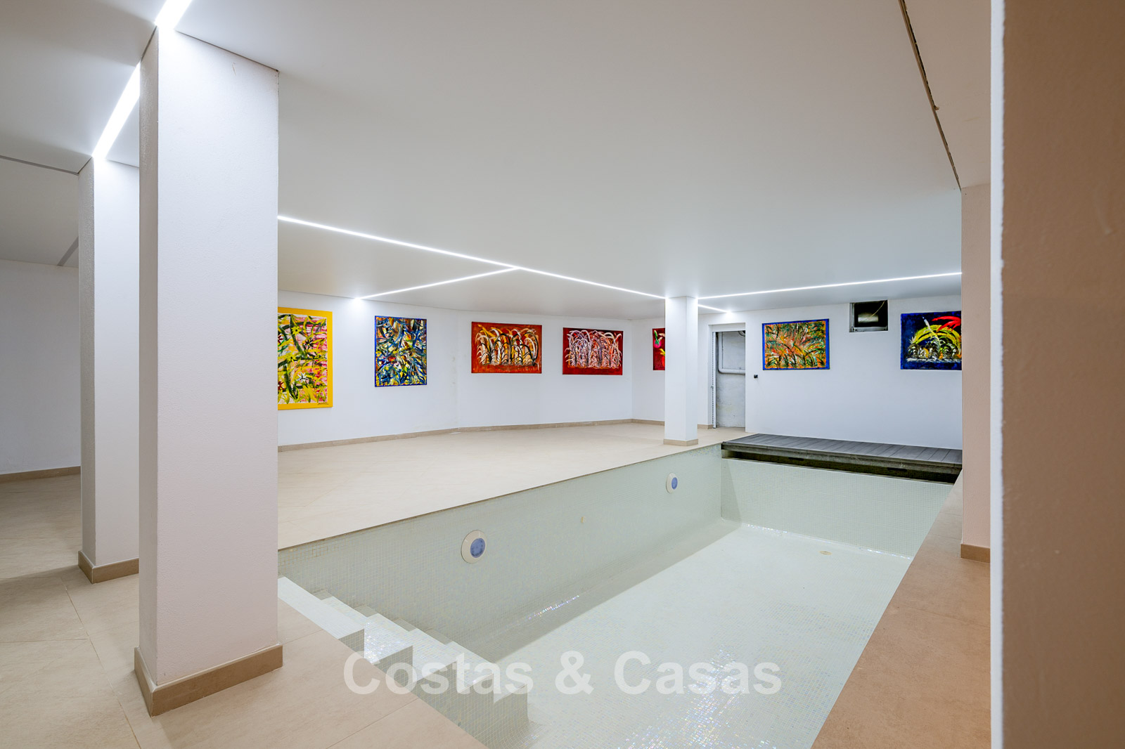 Impresionante villa de estilo clásico-moderno distribuida en varias plantas. Recientemente renovada con un diseño contemporáneo y gran atención al detalle. Acabados de alta calidad y materiales de lujo. Patio andaluz modernizado con entrada de doble altura y grandes ventanales arqueados. Amplia zona de estar con salón formal y acogedores espacios de descanso. Cocina totalmente equipada con electrodomésticos modernos integrados. 9 dormitorios, cada uno con baño en suite y armarios empotrados. La suite principal cuenta con una gran terraza privada con espectaculares vistas al litoral. Apartamento independiente para invitados con cocina y salón, ideal para personal o visitas. Espacio de oficina/exposición. Planta baja con gimnasio profesional, sauna, jacuzzi y piscina interior. Bodega tradicional. Amplio espacio de almacenamiento y lavandería independiente. Sala técnica. Sótano sin terminar, personalizable. Garaje privado para 2 coches y aparcamiento adicional dentro de la parcela cerrada.