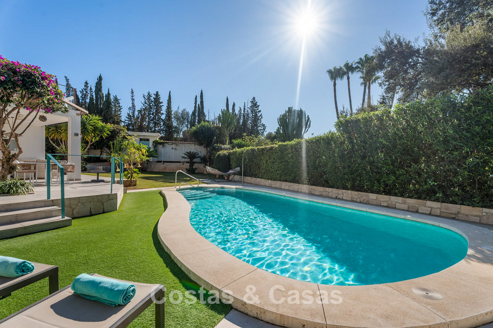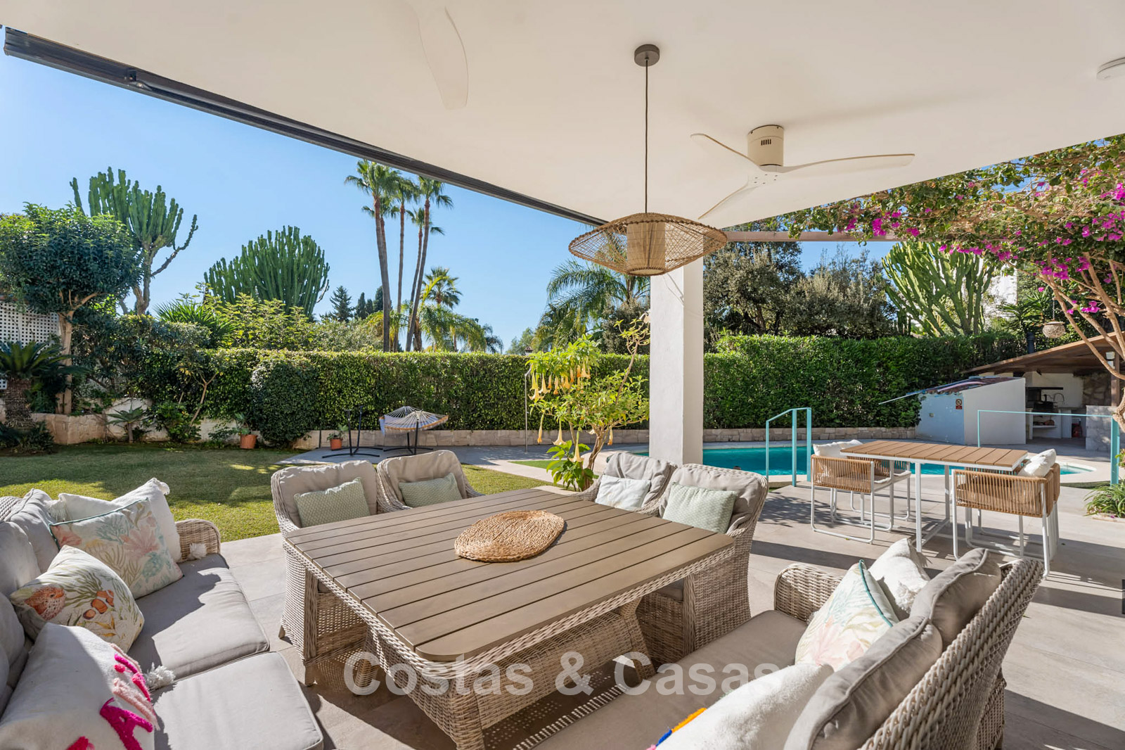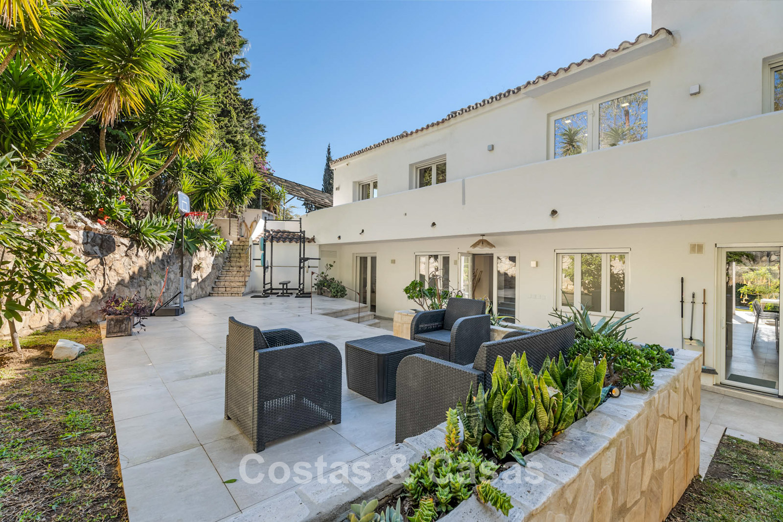 Gracias a la vegetación madura que rodea la amplia parcela, la villa disfruta de una ubicación tranquila y privada. Impresionante jardín con vegetación cuidada y piscina incorporada. Cocina exterior equipada con barbacoa y zona de comedor al aire libre. Varios terrazas permiten disfrutar del agradable clima mediterráneo. Amplio solárium que ofrece espacio adicional para relajarse. Orientación suroeste. Vistas al jardín y a los alrededores.