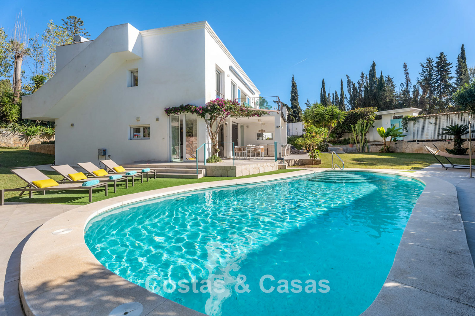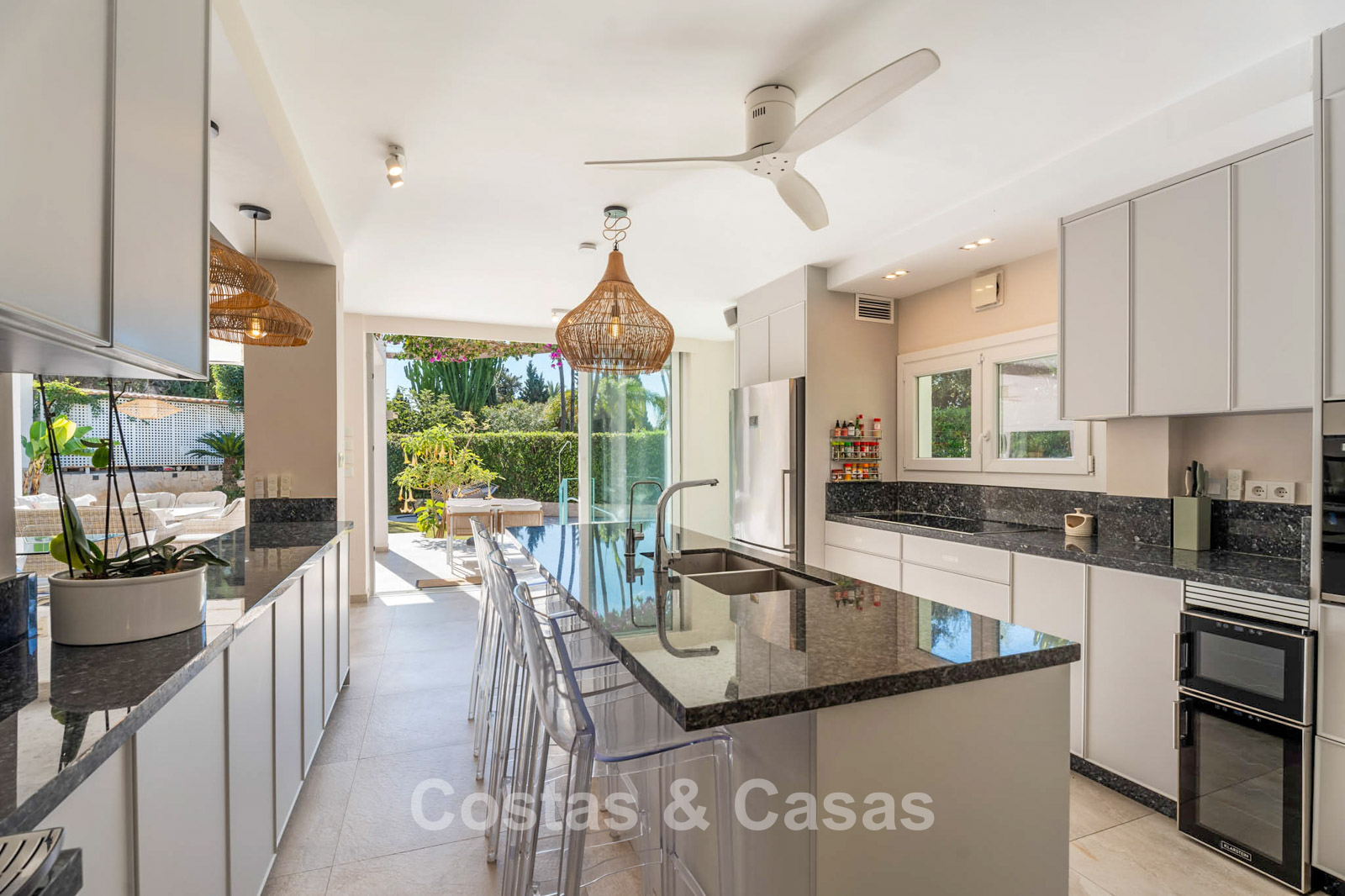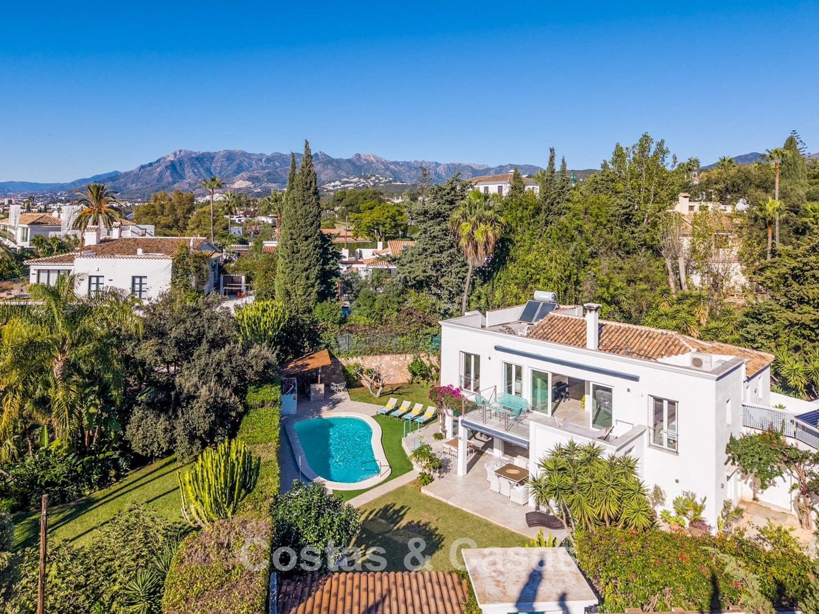 Villa mediterránea con el encanto clásico andaluz. Construida con materiales de alta calidad. Las grandes ventanas correderas del salón potencian la sensación de interior-exterior y proporcionan una luz natural excepcional. La zona de estar cuenta con un diseño de planta abierta. Las zonas de salón y comedor están perfectamente conectadas con la cocina moderna. Cocina abierta funcional equipada con electrodomésticos de alta calidad y una isla con zona de asiento. Lavadero independiente. La vivienda cuenta con cinco dormitorios y cuatro baños, complementados con una sala multifuncional adicional actualmente utilizada como oficina, que se puede convertir fácilmente en un sexto dormitorio si se desea. La suite principal dispone de vestidor, baño en suite y acceso directo a la terraza. En la planta inferior hay un espacio cerrado de 45 m², adecuado para almacenamiento o futura reforma. Cochera para varios vehículos.