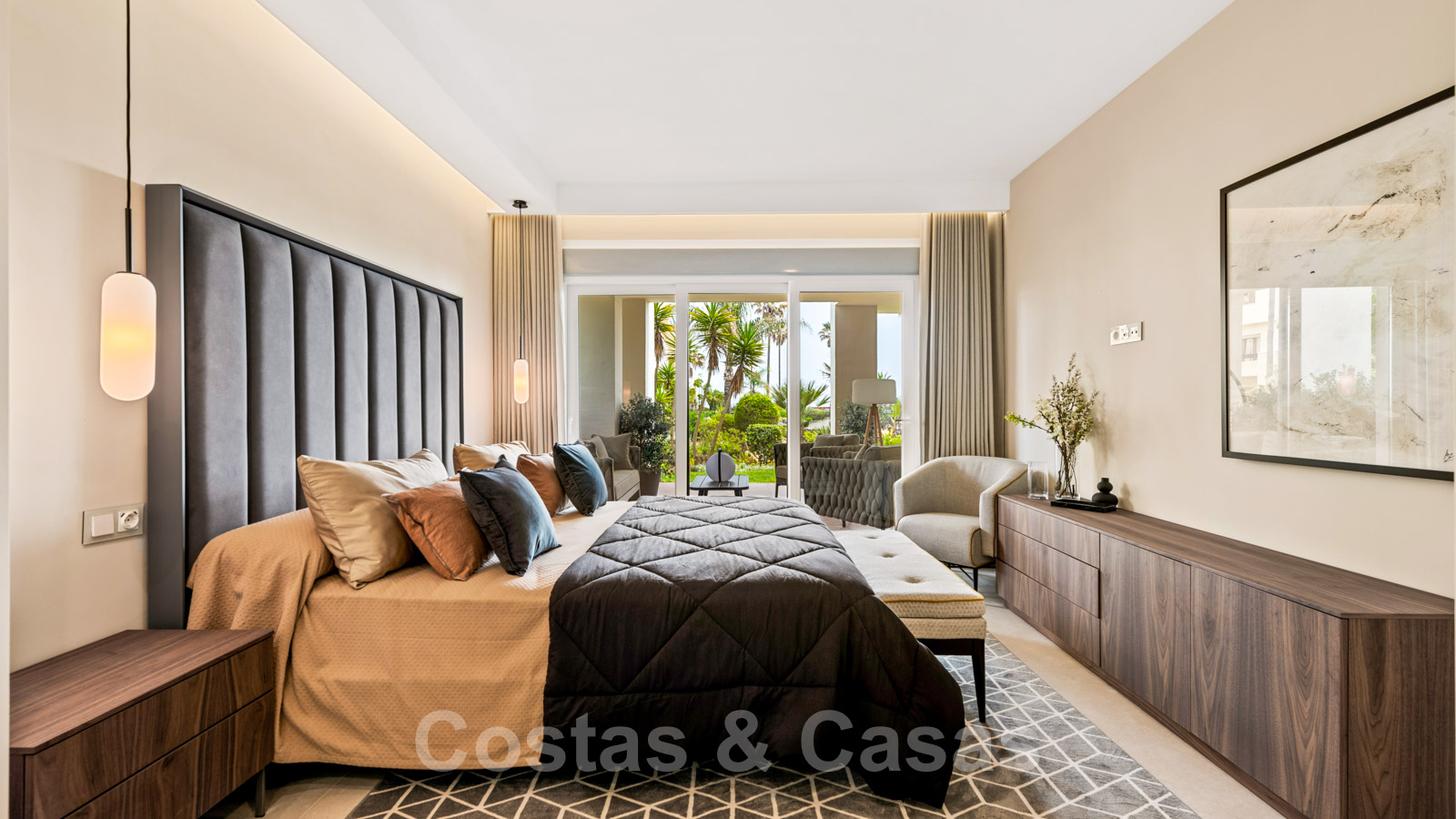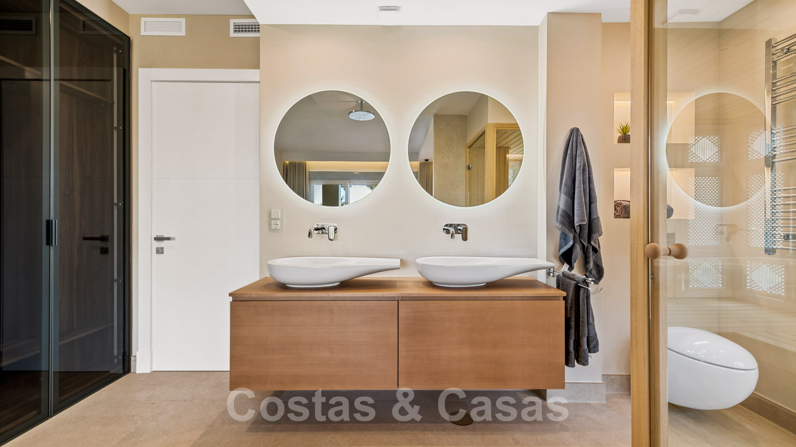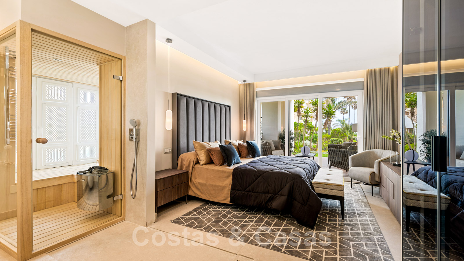 Dormitorio principal en suite con sauna, armarios empotrados y acceso a la terraza cubierta.