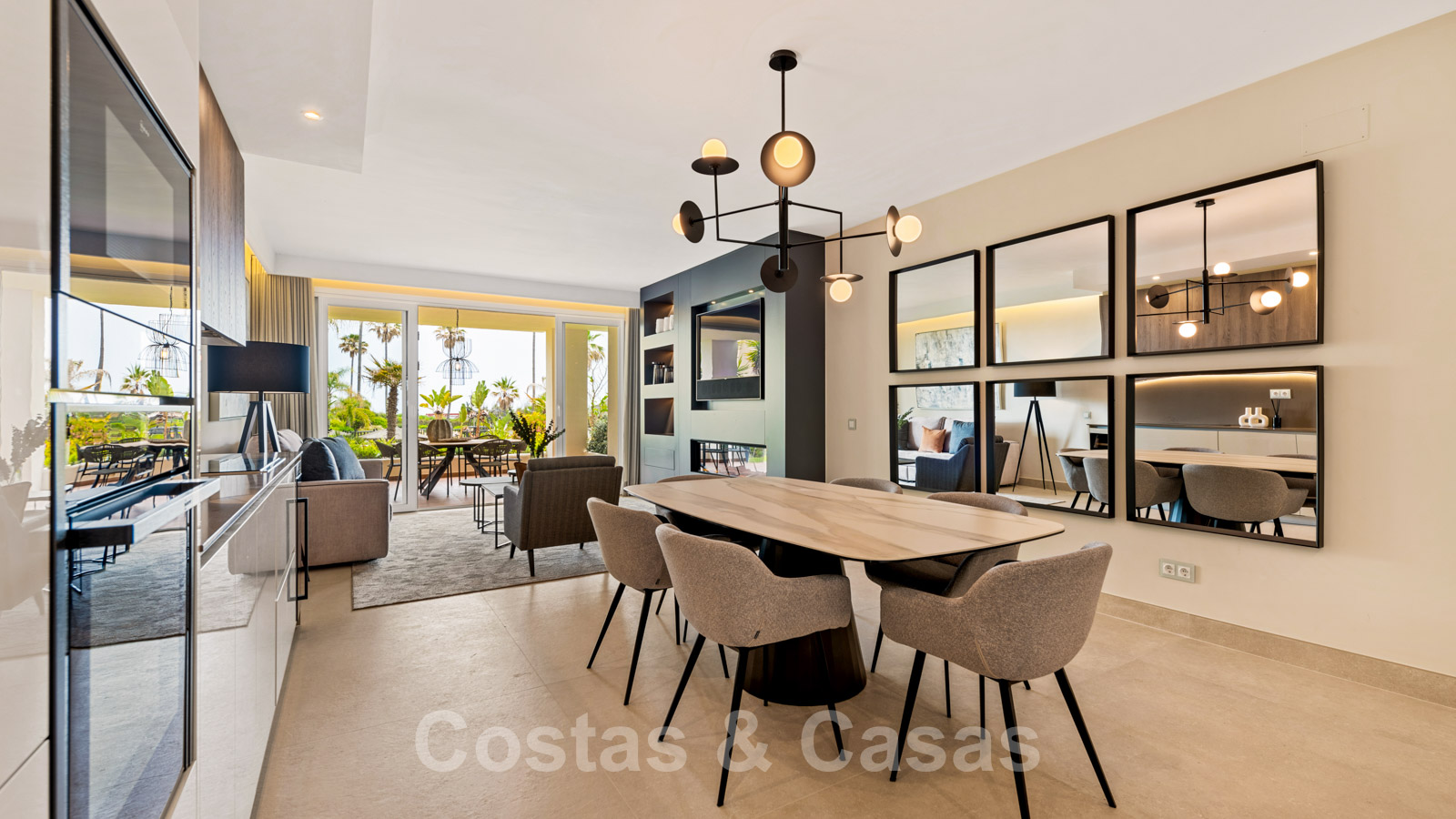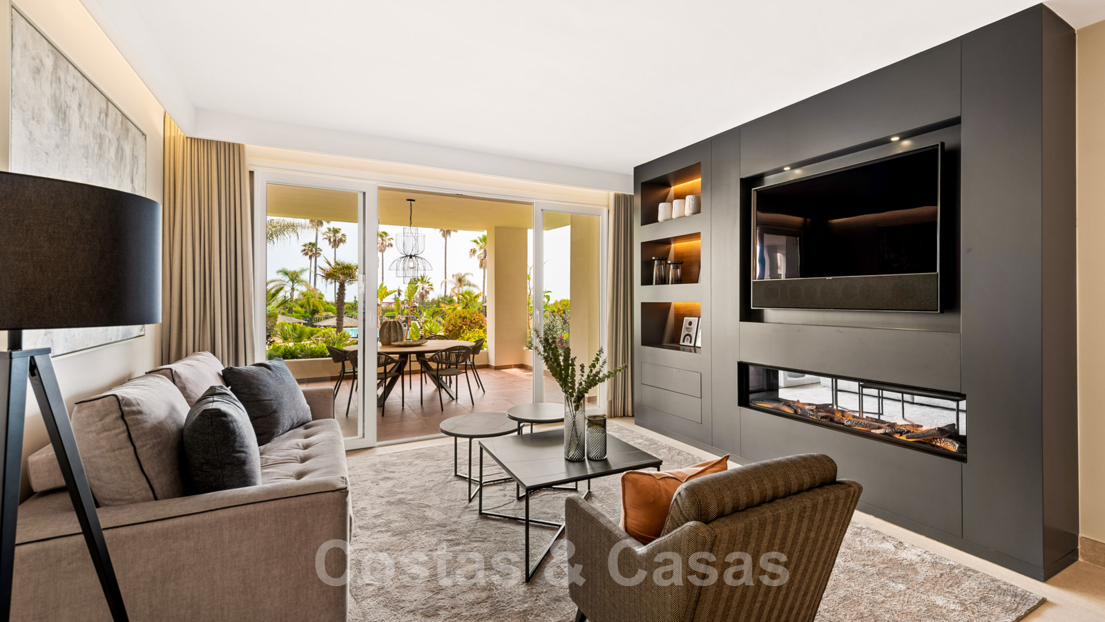 Salón con una moderna chimenea y ventanas correderas de suelo a techo que se abren a la terraza.