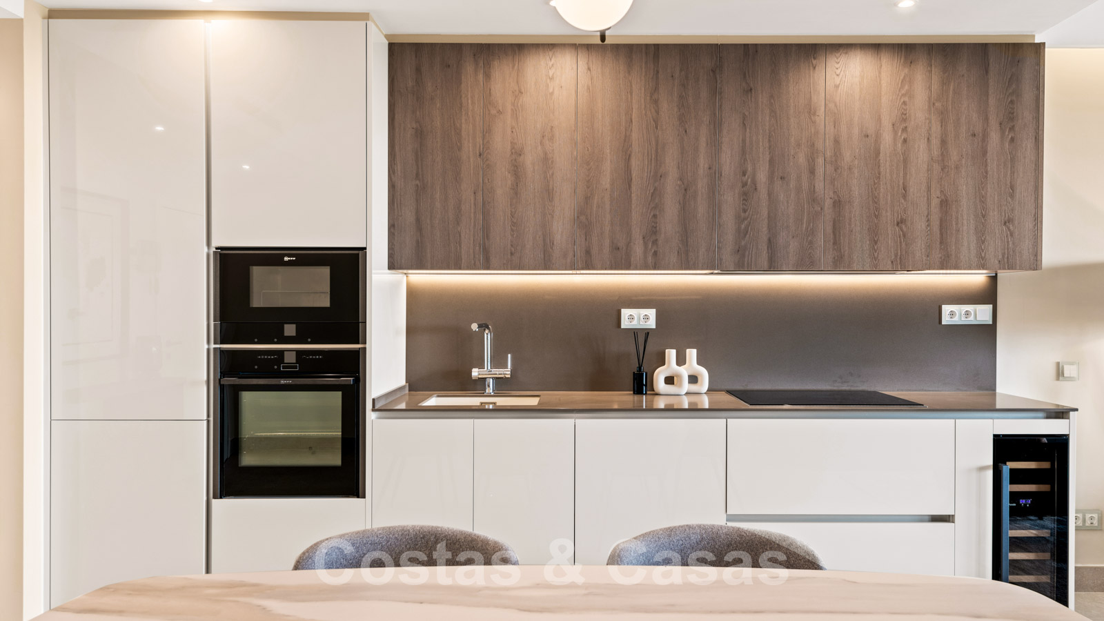Cocina abierta con mesa y totalmente equipada con electrodomésticos Neff.