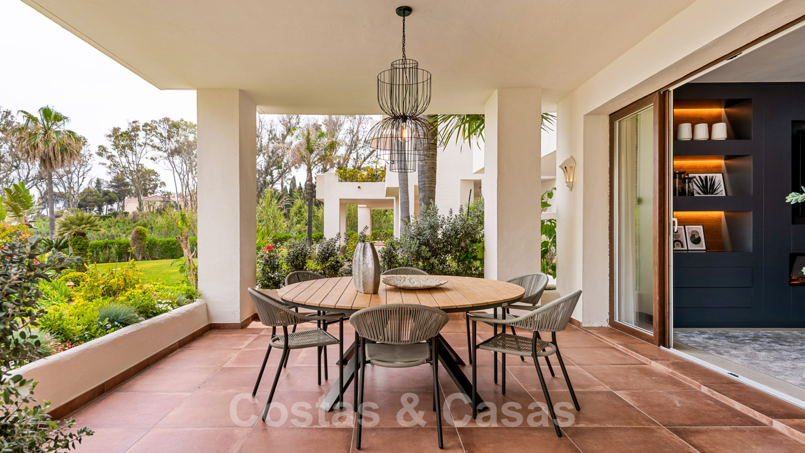 Amplia terraza cubierta con mesa y salón.